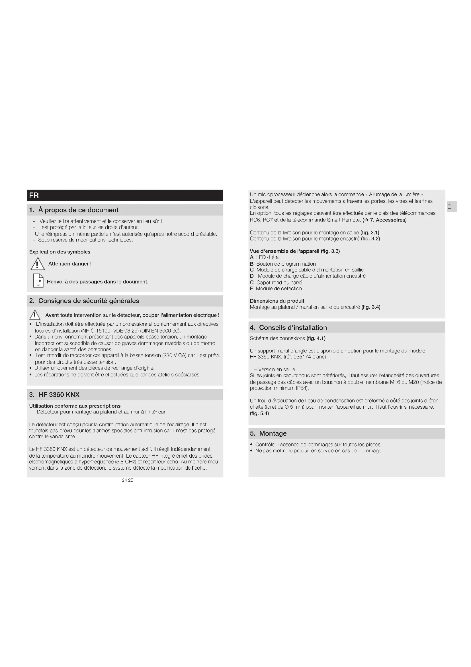 Un microprocesseur déclenche alors la commande « Allumage de la lumière ». L'appareil peut détecter les mouvements à travers les portes, les vitres et les fines cloisons. En option, tous les réglages peuvent être eectués par le biais des télécommandes RC6, RC7 et de la télécommande Smart Remote. (➔ 7 Accessoires) Contenu de la livraison pour le montage en saillie (fig 31) Contenu de la livraison pour le montage encastré (fig 32) Vue d'ensemble de l'appareil (fig 33) A LED d'état B Bouton de programmation C Module de charge câble d'alimentation en saillie D Module de charge câble d'alimentation encastré C Capot rond ou carré F Module de détection Dimensions du produit Montage au plafond / mural en saillie ou encastré (fig 34) 4 Conseils d'installation Schéma des connexions (fig 41) Un support mural d'angle est disponible en option pour le montage du modèle HF3360KNX. (réf. 035174 blanc) – Version en saillie Si les joints en caoutchouc sont détériorés, il faut assurer l'étanchéité des ouvertures de passage des câbles avec un bouchon à double membrane M16 ou M20 (indice de protection minimum IP54). Un trou d'évacuation de l'eau de condensation est préformé à côté des joints d'étan- chéité (foret de Ø 5mm) pour monter l'appareil au mur. Il faut l'ouvrir si nécessaire. (fig54) 5 Montage