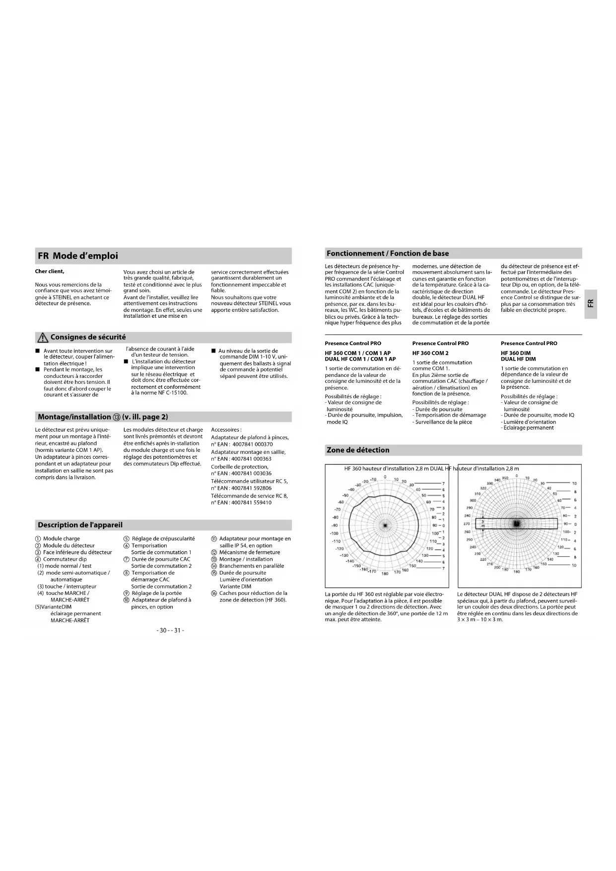 WARRANTY MANUFACTURER'S YEAR WARRANTY MANUFACTURER'S YEAR WARRANTY Disposal Electrical and electronic equip-ment, accessories and packaging must be recycled in an environ-mentally compatible manner.Do not dispose of electrical and elec-tronic equipment as domestic waste.EU countries only:Under the current European Directive on Waste Electrical and Electronic Equipment and its implementation in national law, electrical and electronic equip-ment no longer suitable for use must be collected separately and recycled in an environmen-tally compatible manner.- 30 - - 31 - L Avant toute intervention sur le détecteur, couper l'alimen- tation électrique ! L Pendant le montage, les conducteurs à raccorder doivent être hors tension. Il faut donc d'abord couper le courant et s'assurer de l'absence de courant à l'aide d'un testeur de tension. L L'installation du détecteur implique une intervention sur le réseau électrique et doit donc être effectuée cor- rectement et conformément à la norme NF C-15100. L Au niveau de la sortie de commande DIM 1-10 V, uni- quement des ballasts à signal de commande à potentiel séparé peuvent être utilisés. Description de l'appareil a Module charge b Module du détecteur c Face inférieure du détecteur d Commutateur dip (1) mode normal / test (2) mode semi-automatique / automatique (3) touche / interrupteur (4) touche MARCHE / MARCHE-ARRÊT (5) Variante DIM éclairage permanent MARCHE-ARRÊT e Réglage de crépuscularité f Temporisation Sortie de commutation 1 g Durée de poursuite CAC Sortie de commutation 2 h Temporisation de démarrage CAC Sortie de commutation 2 i Réglage de la portée j Adaptateur de plafond à pinces, en option k Adaptateur pour montage en saillie IP 54, en option l Mécanisme de fermeture m Montage / installation n Branchements en parallèle o Durée de poursuite Lumière d'orientation Variante DIM p Caches pour réduction de la zone de détection (HF 360). Montage/installation m (v. ill. page 2) Le détecteur est prévu unique- ment pour un montage à l'inté- rieur, encastré au plafond (hormis variante COM 1 AP). Un adaptateur à pinces corres- pondant et un adaptateur pour installation en saillie ne sont pas compris dans la livraison. Les modules détecteur et charge sont livrés prémontés et devront être enfichés après in-stallation du module charge et une fois le réglage des potentiomètres et des commutateurs Dip effectué. Accessoires : Adaptateur de plafond à pinces, n° EAN : 4007841 000370 Adaptateur montage en saillie, n° EAN : 4007841 000363 Corbeille de protection, n° EAN : 4007841 003036 Télécommande utilisateur RC 5, n° EAN : 4007841 592806 Télécommande de service RC 8, n° EAN : 4007841 559410 FR Mode d’emploi Cher client, Nous vous remercions de la confiance que vous avez témoi- gnée à STEINEL en achetant ce détecteur de présence. Vous avez choisi un article de très grande qualité, fabriqué, testé et conditionné avec le plus grand soin. Avant de l’installer, veuillez lire attentivement ces instructions de montage. En effet, seules une installation et une mise en service correctement effectuées garantissent durablement un fonctionnement impeccable et fiable. Nous souhaitons que votre nouveau détecteur STEINEL vous apporte entière satisfaction. Consignes de sécurité Fonctionnement / Fonction de base Les détecteurs de présence hy- per fréquence de la série Control PRO commandent l'éclairage et les installations CAC (unique- ment COM 2) en fonction de la luminosité ambiante et de la présence, par ex. dans les bu- reaux, les WC, les bâtiments pu- blics ou privés. Grâce à la tech- nique hyper fréquence des plus modernes, une détection de mouvement absolument sans la- cunes est garantie en fonction de la température. Grâce à la ca- ractéristique de direction double, le détecteur DUAL HF est idéal pour les couloirs d'hô- tels, d'écoles et de bâtiments de bureaux. Le réglage des sorties de commutation et de la portée du détecteur de présence est ef- fectué par l'intermédiaire des potentiomètres et de l'interrup- teur Dip ou, en option, de la télé- commande. Le détecteur Pres- ence Control se distingue de sur- plus par sa consommation très faible en électricité propre. Presence Control PRO