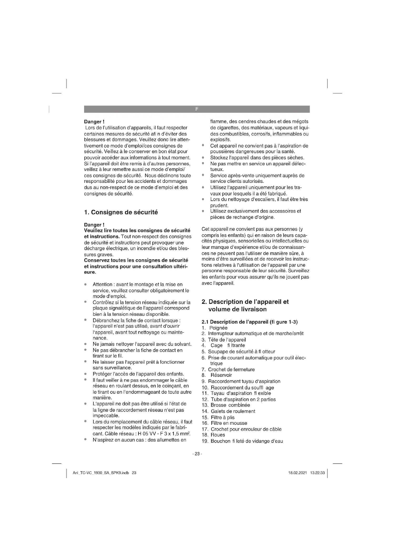 Avertissement ! Assurez-vous, avant de connecter la machine, que les données se trouvant sur la plaque de signalisation correspondent bien aux données du réseau. L‘appareil doit être uniquement branché sur une prise de courant de sécurité ! Anl_TC-VC_1930_SA_SPK9.indb 24Anl_TC-VC_1930_SA_SPK9.indb 24 18.02.2021 13:22:3318.02.2021 13:22:33F