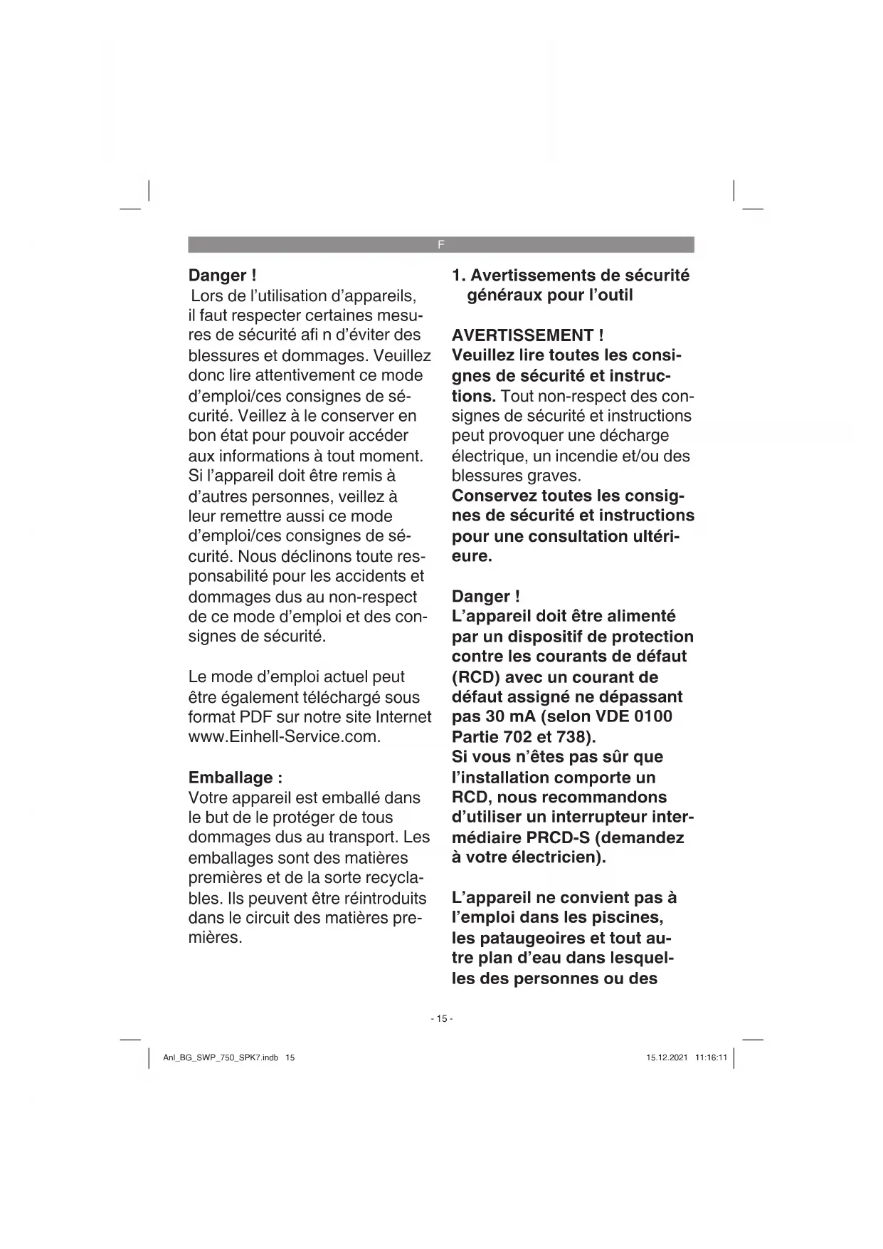 Si vous n’êtes pas sûr que l’installation comporte un RCD, nous recommandons d’utiliser un interrupteur inter- médiaire PRCD-S (demandez à votre électricien). L’appareil ne convient pas à l’emploi dans les piscines, les pataugeoires et tout au- tre plan d’eau dans lesquel- les des personnes ou des Anl_BG_SWP_750_SPK7.indb 15Anl_BG_SWP_750_SPK7.indb 15 15.12.2021 11:16:1115.12.2021 11:16:11F