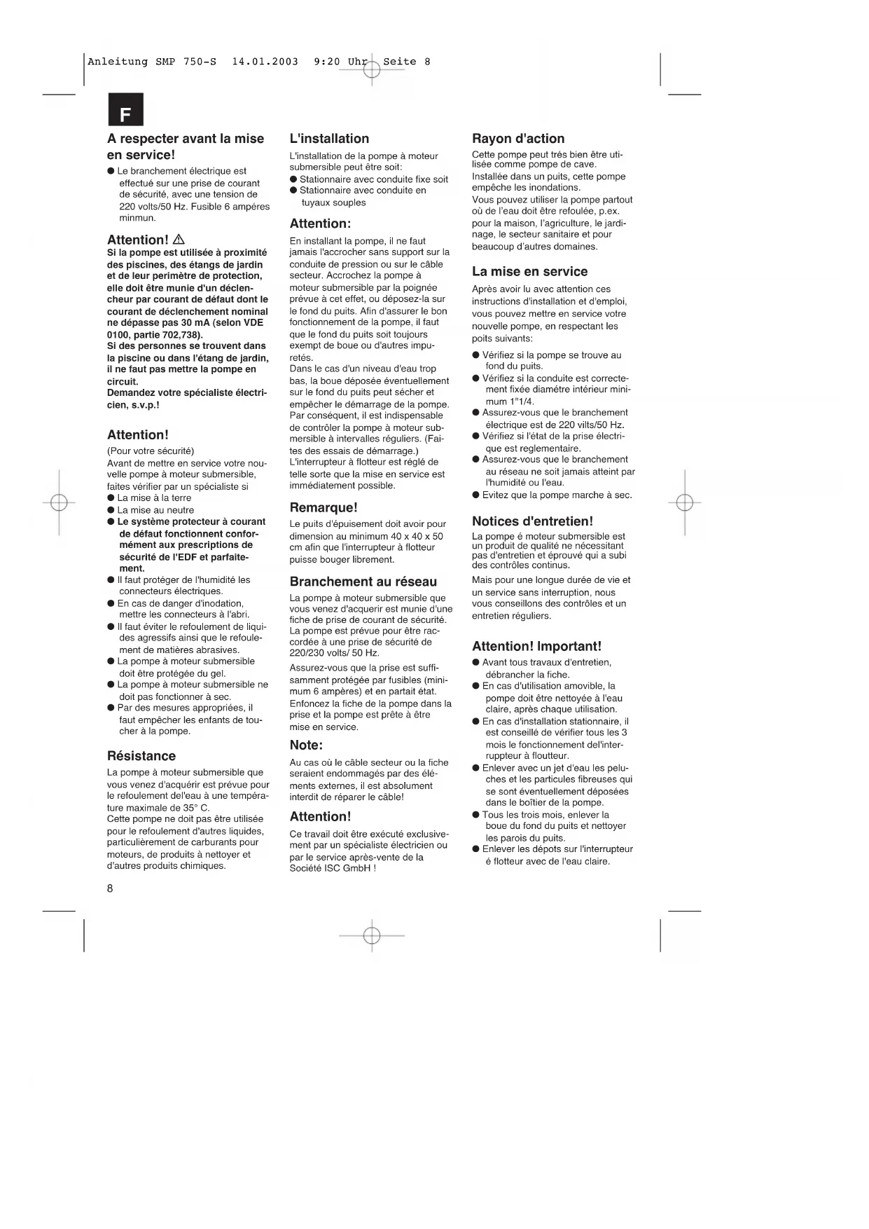 Power supply 230V ~ 50Hz Power consumption 750 Watt Delivery rate max.. 13.500 l/h Delivery height max 9 m Immersion depth max. 8 m Water temperature max. 35°C Hose connection 11/2“ IG Foreign bodies up to dia. 35 mm Switching point high: ON ca. 50 cm Switching point high: OFF ca. 5 cm Article No. 41.705.80 Technical data Performance data Delivery head Delivery rate SMP 750-S 2 m max.: 13.000 l/h 4 m max.: 9.800 l/h 6 m max.: 5.300 l/h Anleitung SMP 750-S 14.01.2003 9:20 Uhr Seite 78 A respecter avant la mise en service! ● Le branchement électrique est effectué sur une prise de courant de sécurité, avec une tension de 220 volts/50 Hz. Fusible 6 ampéres minmun. Attention! Si la pompe est utilisée à proximité des piscines, des étangs de jardin et de leur perimètre de protection, elle doit être munie d'un déclen- cheur par courant de défaut dont le courant de déclenchement nominal ne dépasse pas 30 mA (selon VDE 0100, partie 702,738). Si des personnes se trouvent dans la piscine ou dans l'étang de jardin, il ne faut pas mettre la pompe en circuit. Demandez votre spécialiste électri- cien, s.v.p.! Attention! (Pour votre sécurité) Avant de mettre en service votre nou- velle pompe à moteur submersible, faites vérifier par un spécialiste si ● La mise à la terre ● La mise au neutre ● Le système protecteur à courant de défaut fonctionnent confor- mément aux prescriptions de sécurité de l'EDF et parfaite- ment. ● Il faut protéger de l'humidité les connecteurs électriques. ● En cas de danger d'inodation, mettre les connecteurs à l'abri. ● Il faut éviter le refoulement de liqui- des agressifs ainsi que le refoule- ment de matières abrasives. ● La pompe à moteur submersible doit être protégée du gel. ● La pompe à moteur submersible ne doit pas fonctionner à sec. ● Par des mesures appropriées, il faut empêcher les enfants de tou- cher à la pompe. Résistance La pompe à moteur submersible que vous venez d'acquérir est prévue pour le refoulement del'eau à une tempéra- ture maximale de 35° C. Cette pompe ne doit pas être utilisée pour le refoulement d'autres liquides, particulièrement de carburants pour moteurs, de produits à nettoyer et d'autres produits chimiques. Rayon d'action Cette pompe peut trés bien être uti- lisée comme pompe de cave. Installée dans un puits, cette pompe empêche les inondations. Vous pouvez utiliser la pompe partout où de l’eau doit être refoulée, p.ex. pour la maison, l’agriculture, le jardi- nage, le secteur sanitaire et pour beaucoup d’autres domaines. La mise en service Après avoir lu avec attention ces instructions d'installation et d'emploi, vous pouvez mettre en service votre nouvelle pompe, en respectant les poits suivants: ● Vérifiez si la pompe se trouve au fond du puits. ● Vérifiez si la conduite est correcte- ment fixée diamétre intérieur mini- mum 1"1/4. ● Assurez-vous que le branchement électrique est de 220 vilts/50 Hz. ● Vérifiez si l'état de la prise électri- que est reglementaire. ● Assurez-vous que le branchement au réseau ne soit jamais atteint par l'humidité ou l'eau. ● Evitez que la pompe marche à sec. Notices d'entretien! La pompe é moteur submersible est un produit de qualité ne nécessitant pas d'entretien et éprouvé qui a subi des contrôles continus. Mais pour une longue durée de vie et un service sans interruption, nous vous conseillons des contrôles et un entretien réguliers. Attention! Important! ● Avant tous travaux d'entretien, débrancher la fiche. ● En cas d'utilisation amovible, la pompe doit être nettoyée à l'eau claire, après chaque utilisation. ● En cas d'installation stationnaire, il est conseillé de vérifier tous les 3 mois le fonctionnement del'inter- ruppteur à floutteur. ● Enlever avec un jet d'eau les pelu- ches et les particules fibreuses qui se sont éventuellement déposées dans le boîtier de la pompe. ● Tous les trois mois, enlever la boue du fond du puits et nettoyer les parois du puits. ● Enlever les dépots sur l'interrupteur é flotteur avec de l'eau claire. L'installation L'installation de la pompe à moteur submersible peut être soit: ● Stationnaire avec conduite fixe soit ● Stationnaire avec conduite en tuyaux souples Attention: En installant la pompe, il ne faut jamais l'accrocher sans support sur la conduite de pression ou sur le câble secteur. Accrochez la pompe à moteur submersible par la poignée prévue à cet effet, ou déposez-la sur le fond du puits. Afin d'assurer le bon fonctionnement de la pompe, il faut que le fond du puits soit toujours exempt de boue ou d'autres impu- retés. Dans le cas d'un niveau d'eau trop bas, la boue déposée éventuellement sur le fond du puits peut sécher et empêcher le démarrage de la pompe. Par conséquent, il est indispensable de contrôler la pompe à moteur sub- mersible à intervalles réguliers. (Fai- tes des essais de démarrage.) L'interrupteur à flotteur est réglé de telle sorte que la mise en service est immédiatement possible. Remarque! Le puits d'épuisement doit avoir pour dimension au minimum 40 x 40 x 50 cm afin que l'interrupteur à flotteur puisse bouger librement. Branchement au réseau La pompe à moteur submersible que vous venez d'acquerir est munie d'une fiche de prise de courant de sécurité. La pompe est prévue pour être rac- cordée à une prise de sécurité de 220/230 volts/ 50 Hz. Assurez-vous que la prise est suffi- samment protégée par fusibles (mini- mum 6 ampères) et en partait état. Enfoncez la fiche de la pompe dans la prise et la pompe est prête à être mise en service. Note: Au cas où le câble secteur ou la fiche seraient endommagés par des élé- ments externes, il est absolument interdit de réparer le câble! Attention! Ce travail doit être exécuté exclusive- ment par un spécialiste électricien ou par le service après-vente de la Société ISC GmbH !