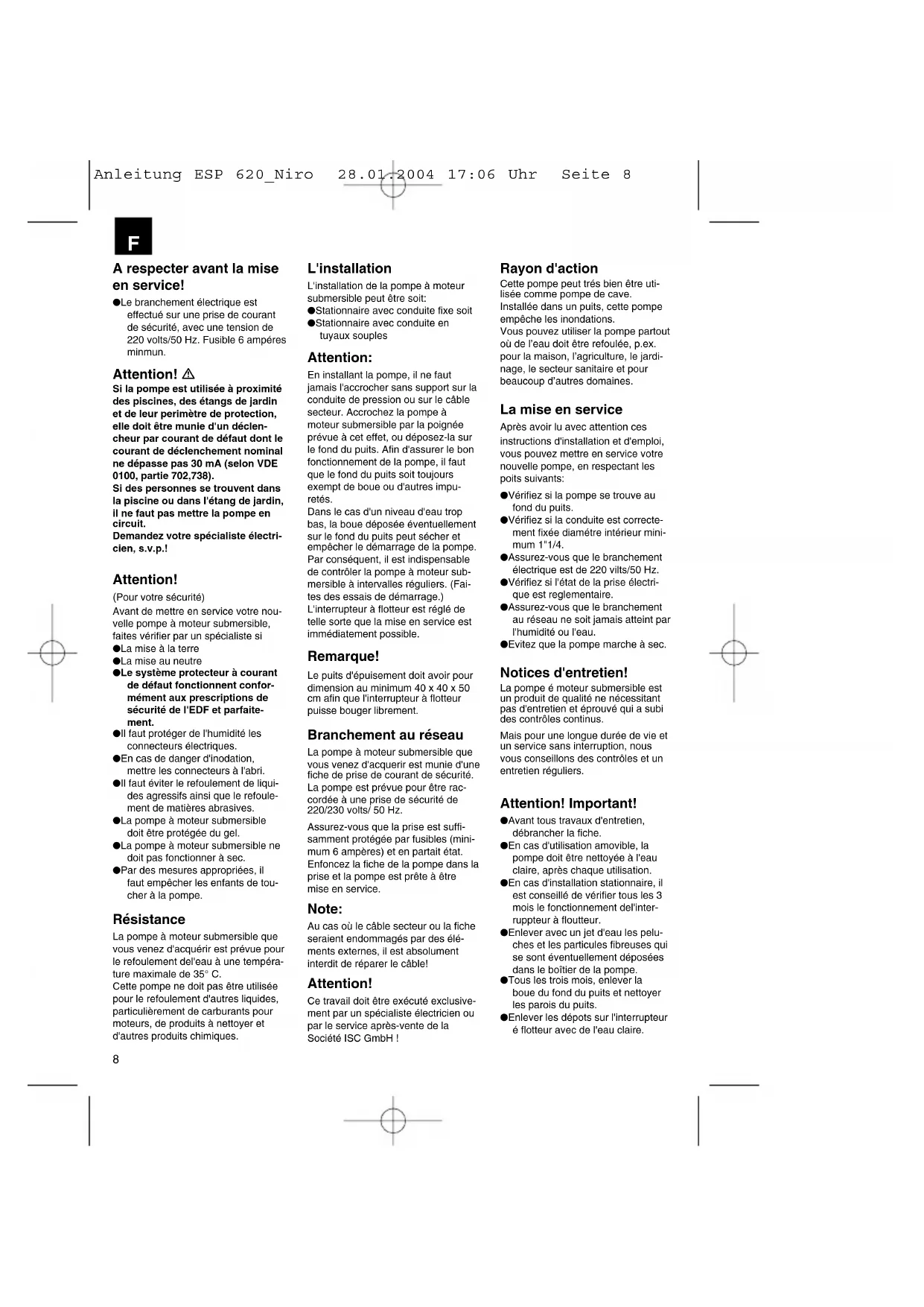 Power supply 230V ~ 50Hz Power consumption 620 Watt Delivery rate max.. 17.100 l/h Delivery height max 7,5 m Immersion depth max. 5 m Water temperature max. 35°C Hose connection 1 1/2“ threaded end Foreign bodies up to dia. 15 mm Switching point high: ON ca. 50 cm Switching point high: OFF ca. 5 cm Article No. 41.705.09 Technical data Performance data Delivery head Delivery rate 1m max.: 16.500 l/h 2m max.: 15.600 l/h 3m max.: 14.400 l/h 4m max.: 12.900 l/h 5m max.: 11.100 l/h 6m max.: 9.000 l/h Anleitung ESP 620_Niro 28.01.2004 17:06 Uhr Seite 78 A respecter avant la mise en service! ● Le branchement électrique esteffectué sur une prise de courantde sécurité, avec une tension de220 volts/50 Hz. Fusible 6 ampéresminmun. Attention! Si la pompe est utilisée à proximitédes piscines, des étangs de jardinet de leur perimètre de protection,elle doit être munie d'un déclen-cheur par courant de défaut dont lecourant de déclenchement nominalne dépasse pas 30 mA (selon VDE0100, partie 702,738).Si des personnes se trouvent dansla piscine ou dans l'étang de jardin,il ne faut pas mettre la pompe encircuit.Demandez votre spécialiste électri-cien, s.v.p.! Attention! (Pour votre sécurité) Avant de mettre en service votre nou-velle pompe à moteur submersible,faites vérifier par un spécialiste si● La mise à la terre● La mise au neutre● Le système protecteur à courantde défaut fonctionnent confor-mément aux prescriptions desécurité de l'EDF et parfaite-ment.● Il faut protéger de l'humidité lesconnecteurs électriques.● En cas de danger d'inodation,mettre les connecteurs à l'abri.● Il faut éviter le refoulement de liqui-des agressifs ainsi que le refoule-ment de matières abrasives.● La pompe à moteur submersibledoit être protégée du gel.● La pompe à moteur submersible nedoit pas fonctionner à sec.● Par des mesures appropriées, ilfaut empêcher les enfants de tou-cher à la pompe. Résistance La pompe à moteur submersible quevous venez d'acquérir est prévue pourle refoulement del'eau à une tempéra-ture maximale de 35° C.Cette pompe ne doit pas être utiliséepour le refoulement d'autres liquides,particulièrement de carburants pourmoteurs, de produits à nettoyer etd'autres produits chimiques. Rayon d'action Cette pompe peut trés bien être uti-lisée comme pompe de cave.Installée dans un puits, cette pompeempêche les inondations.Vous pouvez utiliser la pompe partoutoù de l’eau doit être refoulée, p.ex.pour la maison, l’agriculture, le jardi-nage, le secteur sanitaire et pourbeaucoup d’autres domaines. La mise en service Après avoir lu avec attention cesinstructions d'installation et d'emploi,vous pouvez mettre en service votrenouvelle pompe, en respectant lespoits suivants:● Vérifiez si la pompe se trouve aufond du puits.● Vérifiez si la conduite est correcte-ment fixée diamétre intérieur mini-mum 1"1/4.● Assurez-vous que le branchementélectrique est de 220 vilts/50 Hz.● Vérifiez si l'état de la prise électri-que est reglementaire.● Assurez-vous que le branchementau réseau ne soit jamais atteint parl'humidité ou l'eau.● Evitez que la pompe marche à sec. Notices d'entretien! La pompe é moteur submersible estun produit de qualité ne nécessitantpas d'entretien et éprouvé qui a subides contrôles continus.Mais pour une longue durée de vie etun service sans interruption, nousvous conseillons des contrôles et unentretien réguliers. Attention! Important! ● Avant tous travaux d'entretien,débrancher la fiche.● En cas d'utilisation amovible, lapompe doit être nettoyée à l'eauclaire, après chaque utilisation.● En cas d'installation stationnaire, ilest conseillé de vérifier tous les 3mois le fonctionnement del'inter-ruppteur à floutteur.● Enlever avec un jet d'eau les pelu-ches et les particules fibreuses quise sont éventuellement déposéesdans le boîtier de la pompe.● Tous les trois mois, enlever laboue du fond du puits et nettoyerles parois du puits.● Enlever les dépots sur l'interrupteuré flotteur avec de l'eau claire. L'installation L'installation de la pompe à moteursubmersible peut être soit:● Stationnaire avec conduite fixe soit● Stationnaire avec conduite entuyaux souples Attention: En installant la pompe, il ne fautjamais l'accrocher sans support sur laconduite de pression ou sur le câblesecteur. Accrochez la pompe àmoteur submersible par la poignéeprévue à cet effet, ou déposez-la surle fond du puits. Afin d'assurer le bonfonctionnement de la pompe, il fautque le fond du puits soit toujoursexempt de boue ou d'autres impu-retés. Dans le cas d'un niveau d'eau tropbas, la boue déposée éventuellementsur le fond du puits peut sécher etempêcher le démarrage de la pompe.Par conséquent, il est indispensablede contrôler la pompe à moteur sub-mersible à intervalles réguliers. (Fai-tes des essais de démarrage.)L'interrupteur à flotteur est réglé detelle sorte que la mise en service estimmédiatement possible. Remarque! Le puits d'épuisement doit avoir pourdimension au minimum 40 x 40 x 50cm afin que l'interrupteur à flotteurpuisse bouger librement. Branchement au réseau La pompe à moteur submersible quevous venez d'acquerir est munie d'unefiche de prise de courant de sécurité.La pompe est prévue pour être rac-cordée à une prise de sécurité de220/230 volts/ 50 Hz.Assurez-vous que la prise est suffi-samment protégée par fusibles (mini-mum 6 ampères) et en partait état.Enfoncez la fiche de la pompe dans laprise et la pompe est prête à êtremise en service. Note: Au cas où le câble secteur ou la ficheseraient endommagés par des élé-ments externes, il est absolumentinterdit de réparer le câble! Attention! Ce travail doit être exécuté exclusive-ment par un spécialiste électricien oupar le service après-vente de laSociété ISC GmbH !