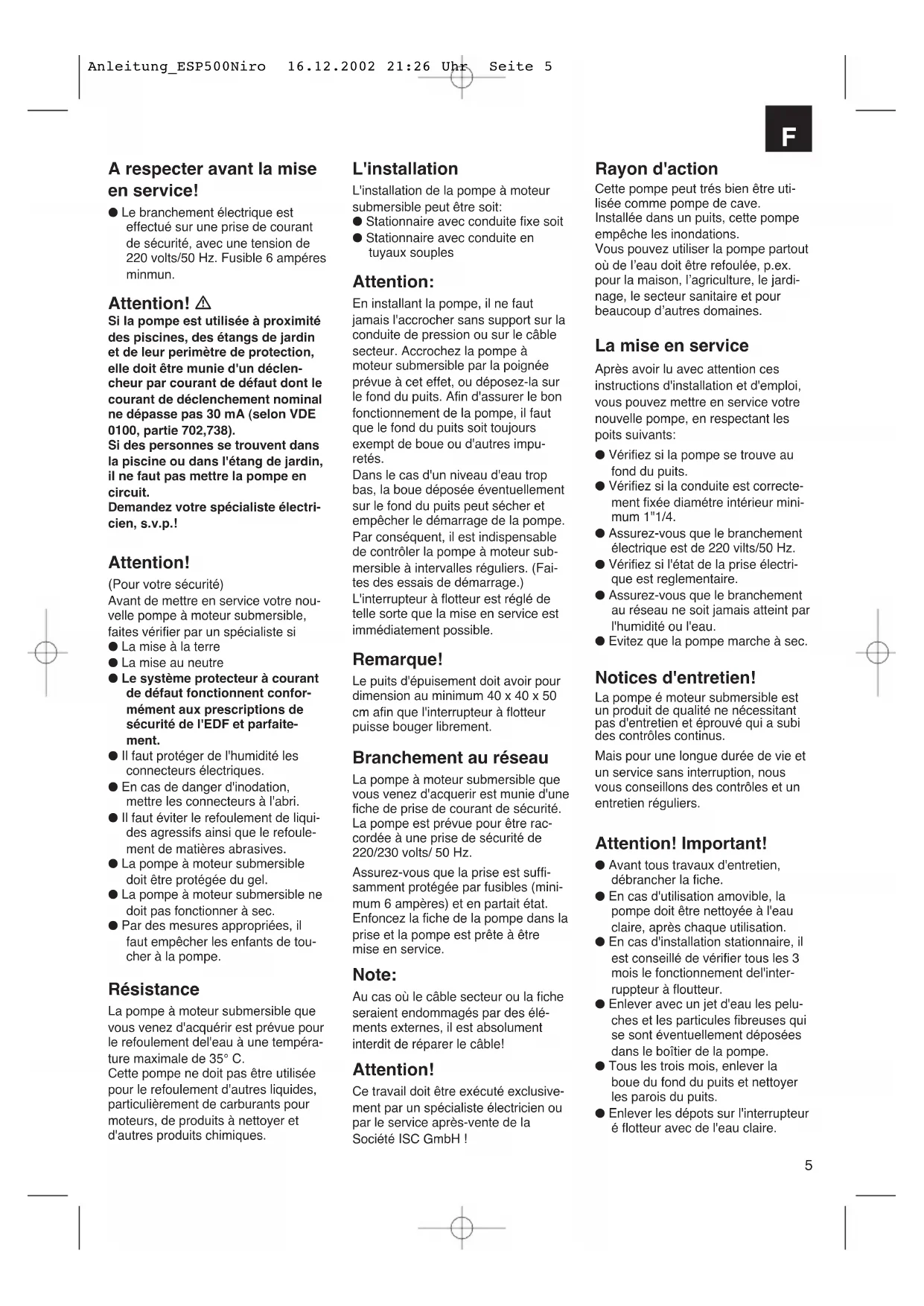 Förderhöhe Fördermenge ESP 500 NIRO 1m max.: 16.500 l/h 2m max.: 15.600 l/h 3m max.: 14.400 l/h 4m max.: 12.900 l/h 5m max.: 11.100 l/h 6m max.: 19.000 l/h Anleitung_ESP500Niro 16.12.2002 21:26 Uhr Seite 45 A respecter avant la mise en service! ● Le branchement électrique est effectué sur une prise de courant de sécurité, avec une tension de 220 volts/50 Hz. Fusible 6 ampéres minmun. Attention! Si la pompe est utilisée à proximité des piscines, des étangs de jardin et de leur perimètre de protection, elle doit être munie d'un déclen- cheur par courant de défaut dont le courant de déclenchement nominal ne dépasse pas 30 mA (selon VDE 0100, partie 702,738). Si des personnes se trouvent dans la piscine ou dans l'étang de jardin, il ne faut pas mettre la pompe en circuit. Demandez votre spécialiste électri- cien, s.v.p.! Attention! (Pour votre sécurité) Avant de mettre en service votre nou- velle pompe à moteur submersible, faites vérifier par un spécialiste si ● La mise à la terre ● La mise au neutre ● Le système protecteur à courant de défaut fonctionnent confor- mément aux prescriptions de sécurité de l'EDF et parfaite- ment. ● Il faut protéger de l'humidité les connecteurs électriques. ● En cas de danger d'inodation, mettre les connecteurs à l'abri. ● Il faut éviter le refoulement de liqui- des agressifs ainsi que le refoule- ment de matières abrasives. ● La pompe à moteur submersible doit être protégée du gel. ● La pompe à moteur submersible ne doit pas fonctionner à sec. ● Par des mesures appropriées, il faut empêcher les enfants de tou- cher à la pompe. Résistance La pompe à moteur submersible que vous venez d'acquérir est prévue pour le refoulement del'eau à une tempéra- ture maximale de 35° C. Cette pompe ne doit pas être utilisée pour le refoulement d'autres liquides, particulièrement de carburants pour moteurs, de produits à nettoyer et d'autres produits chimiques. Rayon d'action Cette pompe peut trés bien être uti- lisée comme pompe de cave. Installée dans un puits, cette pompe empêche les inondations. Vous pouvez utiliser la pompe partout où de l’eau doit être refoulée, p.ex. pour la maison, l’agriculture, le jardi- nage, le secteur sanitaire et pour beaucoup d’autres domaines. La mise en service Après avoir lu avec attention ces instructions d'installation et d'emploi, vous pouvez mettre en service votre nouvelle pompe, en respectant les poits suivants: ● Vérifiez si la pompe se trouve au fond du puits. ● Vérifiez si la conduite est correcte- ment fixée diamétre intérieur mini- mum 1"1/4. ● Assurez-vous que le branchement électrique est de 220 vilts/50 Hz. ● Vérifiez si l'état de la prise électri- que est reglementaire. ● Assurez-vous que le branchement au réseau ne soit jamais atteint par l'humidité ou l'eau. ● Evitez que la pompe marche à sec. Notices d'entretien! La pompe é moteur submersible est un produit de qualité ne nécessitant pas d'entretien et éprouvé qui a subi des contrôles continus. Mais pour une longue durée de vie et un service sans interruption, nous vous conseillons des contrôles et un entretien réguliers. Attention! Important! ● Avant tous travaux d'entretien, débrancher la fiche. ● En cas d'utilisation amovible, la pompe doit être nettoyée à l'eau claire, après chaque utilisation. ● En cas d'installation stationnaire, il est conseillé de vérifier tous les 3 mois le fonctionnement del'inter- ruppteur à floutteur. ● Enlever avec un jet d'eau les pelu- ches et les particules fibreuses qui se sont éventuellement déposées dans le boîtier de la pompe. ● Tous les trois mois, enlever la boue du fond du puits et nettoyer les parois du puits. ● Enlever les dépots sur l'interrupteur é flotteur avec de l'eau claire. L'installation L'installation de la pompe à moteur submersible peut être soit: ● Stationnaire avec conduite fixe soit ● Stationnaire avec conduite en tuyaux souples Attention: En installant la pompe, il ne faut jamais l'accrocher sans support sur la conduite de pression ou sur le câble secteur. Accrochez la pompe à moteur submersible par la poignée prévue à cet effet, ou déposez-la sur le fond du puits. Afin d'assurer le bon fonctionnement de la pompe, il faut que le fond du puits soit toujours exempt de boue ou d'autres impu- retés. Dans le cas d'un niveau d'eau trop bas, la boue déposée éventuellement sur le fond du puits peut sécher et empêcher le démarrage de la pompe. Par conséquent, il est indispensable de contrôler la pompe à moteur sub- mersible à intervalles réguliers. (Fai- tes des essais de démarrage.) L'interrupteur à flotteur est réglé de telle sorte que la mise en service est immédiatement possible. Remarque! Le puits d'épuisement doit avoir pour dimension au minimum 40 x 40 x 50 cm afin que l'interrupteur à flotteur puisse bouger librement. Branchement au réseau La pompe à moteur submersible que vous venez d'acquerir est munie d'une fiche de prise de courant de sécurité. La pompe est prévue pour être rac- cordée à une prise de sécurité de 220/230 volts/ 50 Hz. Assurez-vous que la prise est suffi- samment protégée par fusibles (mini- mum 6 ampères) et en partait état. Enfoncez la fiche de la pompe dans la prise et la pompe est prête à être mise en service. Note: Au cas où le câble secteur ou la fiche seraient endommagés par des élé- ments externes, il est absolument interdit de réparer le câble! Attention! Ce travail doit être exécuté exclusive- ment par un spécialiste électricien ou par le service après-vente de la Société ISC GmbH !