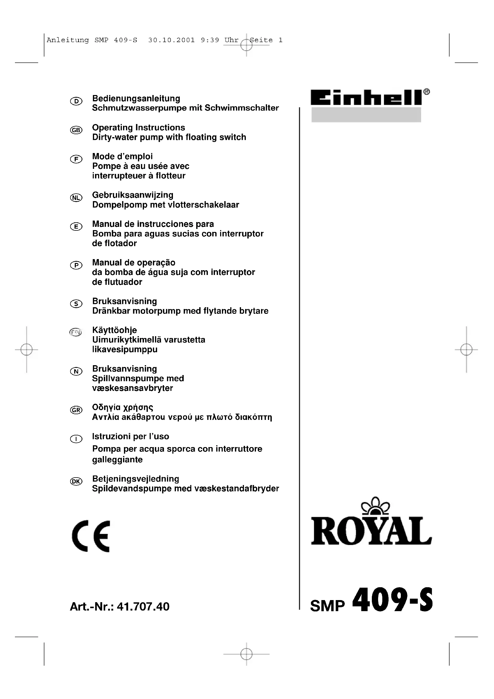● Faites attention à ce que l’écart entre la tête de l’interrupteur à flot- teur et le dispositif de crantage de l’interrupteur à flotteur ne soit pas trop faible. En cas d’écart insuffi- sant, un fonctionnement irrépro- chable n’est pas garanti. ● En ce qui concerne le réglage, veil- lez à ce que l’interrupteur à flotteur ne touche pas le sol avant l’arrêt de la pompe. Attention! Risque de marche à sec. Anleitung SMP 409-S 30.10.2001 9:39 Uhr Seite 910 Renseignements concernant la garantie: Les dommages suivants ne sont pas couverts par la garantie: ● Altération de la garniture mécanique d’étanchéité par un fonctionnement à sec, ou par l’introduction de corps étrangers dans l’eau ● Obstruction de la roue à aubes par un corps étranger ● Détériorations durant le transport ● Ingérence étrangère Commande de pièces de rechange 1. Lors d’un éventuel besoin en pièces de rechange, les données suivantes doivent être fournies :2. Type de l’appareil3. Numéro d’article de l’appareil4. Numéro d’identification de l’appareil5. Numéro de la pièce de rechange pour la pièce de rechange nécessaire.