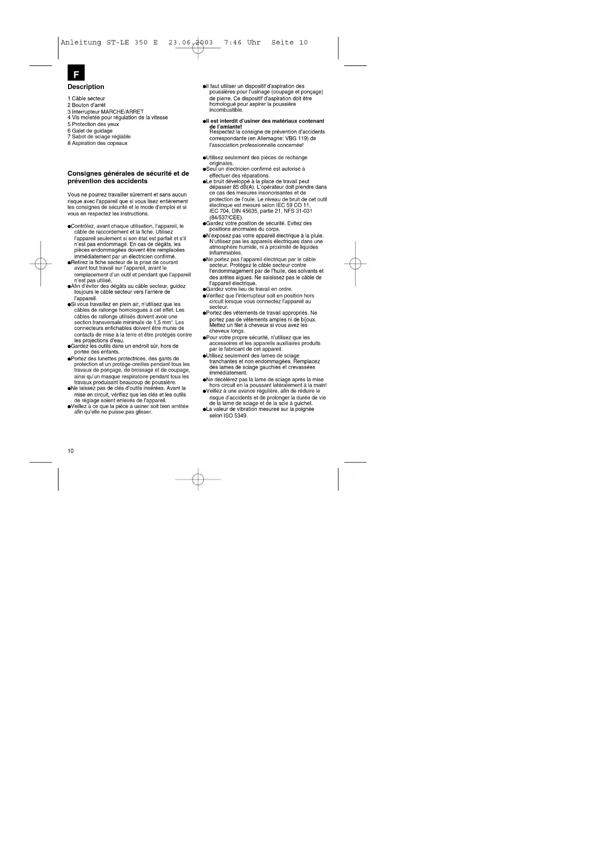 Support Anleitung ST-LE 350 E 23.06.2003 7:46 Uhr Seite 910 Description 1 Câble secteur 2 Bouton d’arrêt 3 Interrupteur MARCHE/ARRET 4 Vis moletée pour régulation de la vitesse 5 Protection des yeux 6 Galet de guidage 7 Sabot de sciage réglable 8 Aspiration des copeaux Consignes générales de sécurité et de prévention des accidents Vous ne pourrez travailler sûrement et sans aucun risque avec l’appareil que si vous lisez entièrement les consignes de sécurité et le mode d’emploi et si vous en respectez les instructions. Contrôlez, avant chaque utilisation, l’appareil, le câble de raccordement et la fiche. Utilisez l’appareil seulement si son état est parfait et s’il n’est pas endommagé. En cas de dégâts, les pièces endommagées doivent être remplacées immédiatement par un électricien confirmé. Retirez la fiche secteur de la prise de courant avant tout travail sur l’appareil, avant le remplacement d’un outil et pendant que l’appareil n’est pas utilisé. Afin d’éviter des dégâts au câble secteur, guidez toujours le câble secteur vers l’arrière de l’appareil. Si vous travaillez en plein air, n’utilisez que les câbles de rallonge homologués à cet effet. Les câbles de rallonge utilisés doivent avoir une section transversale minimale de 1,5 mm