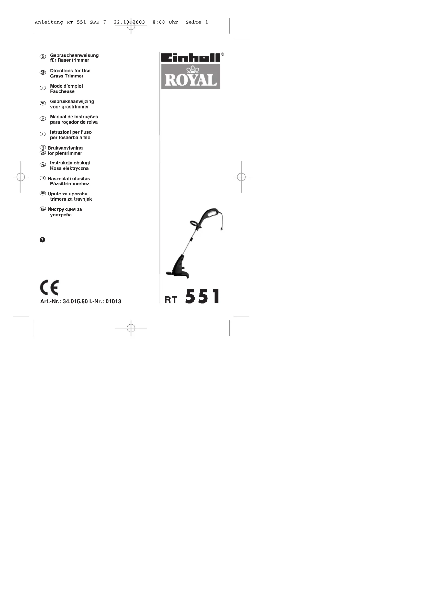 Téléchargez la notice de votre Coupe-herbe au format PDF gratuitement ! Retrouvez votre notice Royal RT 551 - EINHELL et reprennez votre appareil électronique en main. Sur cette page sont publiés tous les documents nécessaires à l'utilisation de votre appareil Royal RT 551 de la marque EINHELL.