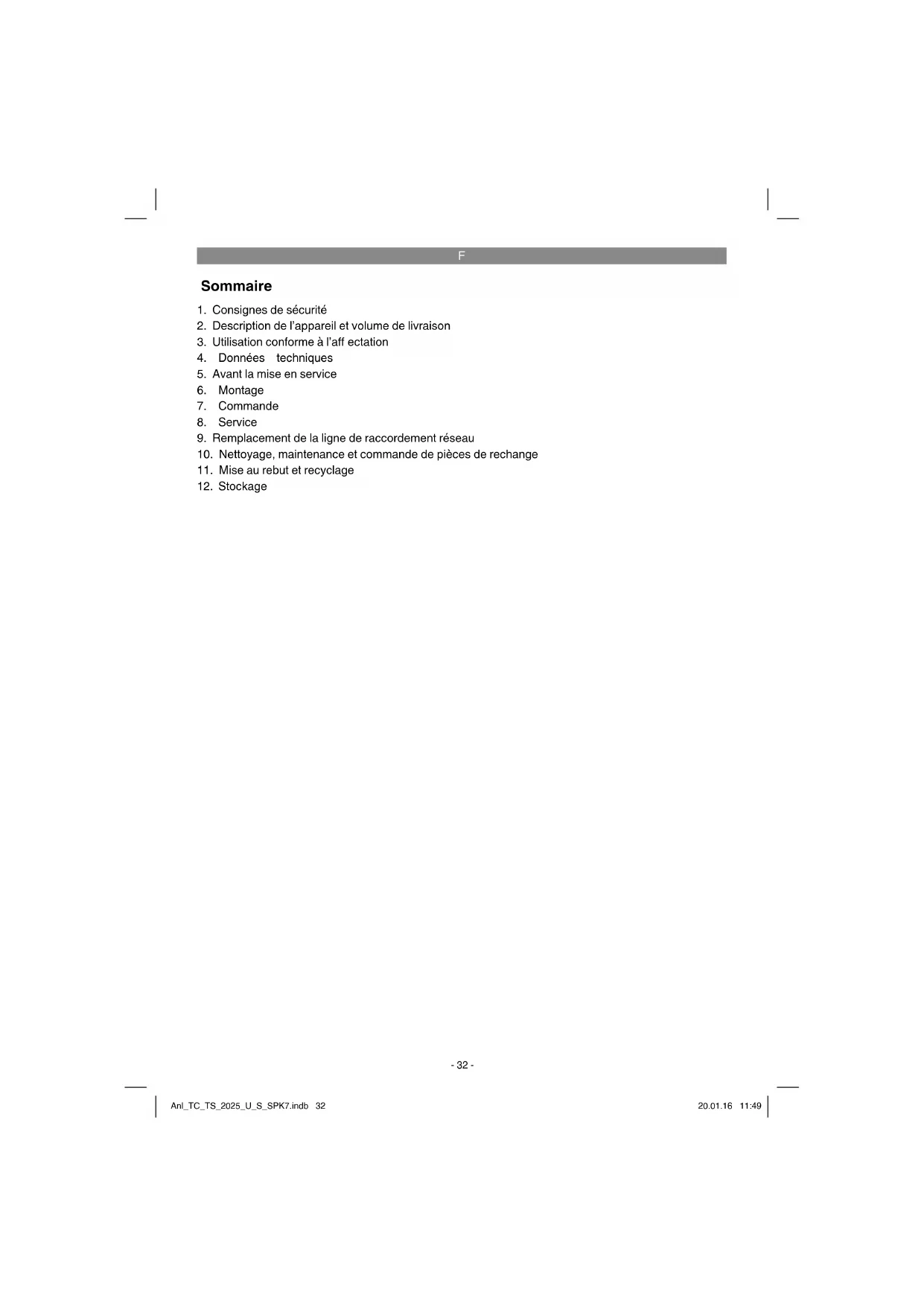 Avant de travailler à nouveau avec la scie, il faut contrôler le bon fonctionnement des dis- positifs de protection. Anl_TC_TS_2025_U_S_SPK7.indb 37Anl_TC_TS_2025_U_S_SPK7.indb 37 20.01.16 11:4920.01.16 11:49F
