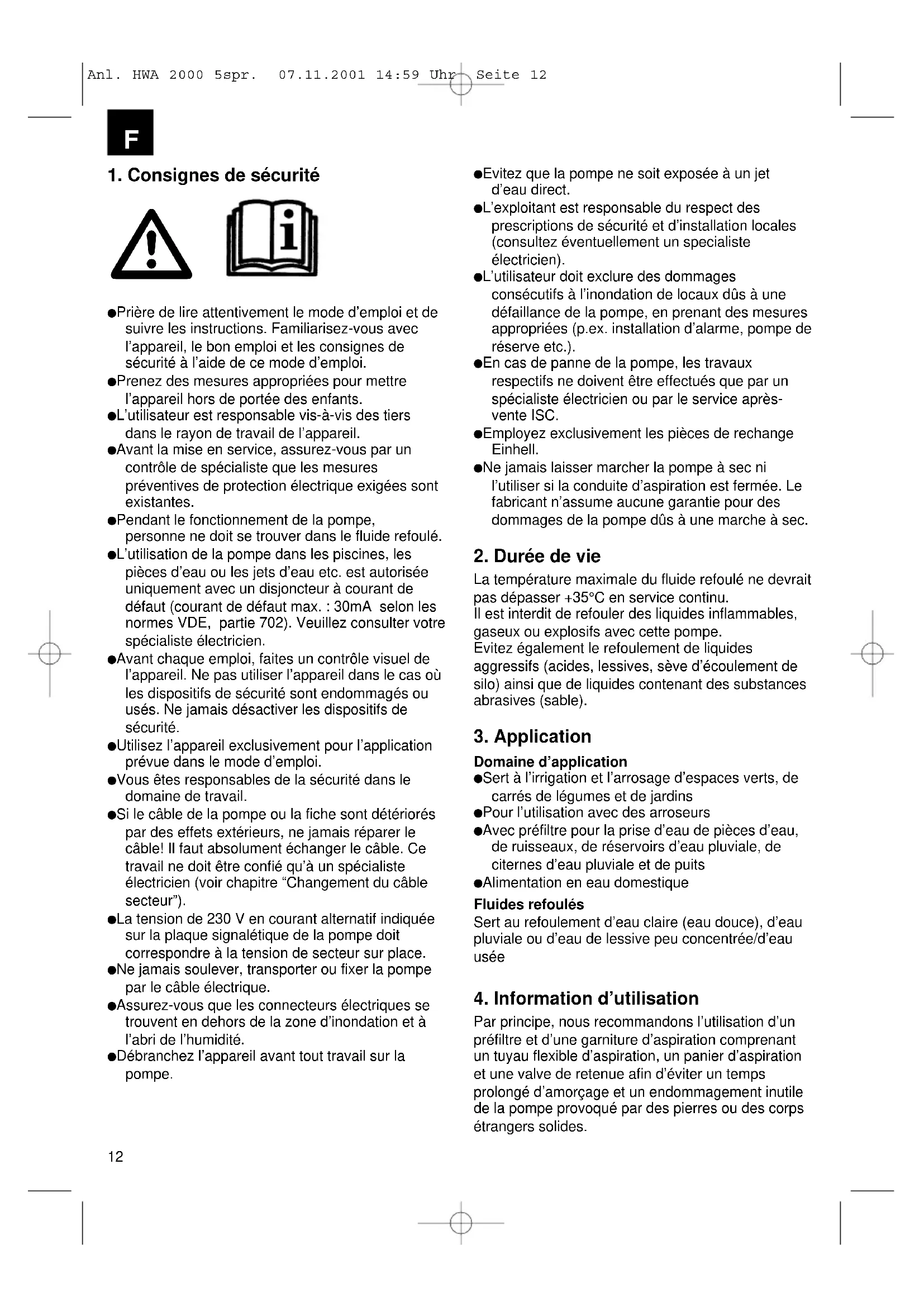 Anl. HWA 2000 5spr. 07.11.2001 14:59 Uhr Seite 14bouton appuyé. Selon la hauteur d’aspiration et le volume d’air dans la conduite d’aspiration, ce premier processus d’aspiration peut durer env. 0,5 à 5 minutes. En cas de durées d’aspiration prolongées, il faudrait remplir de nouveau de l’eau.