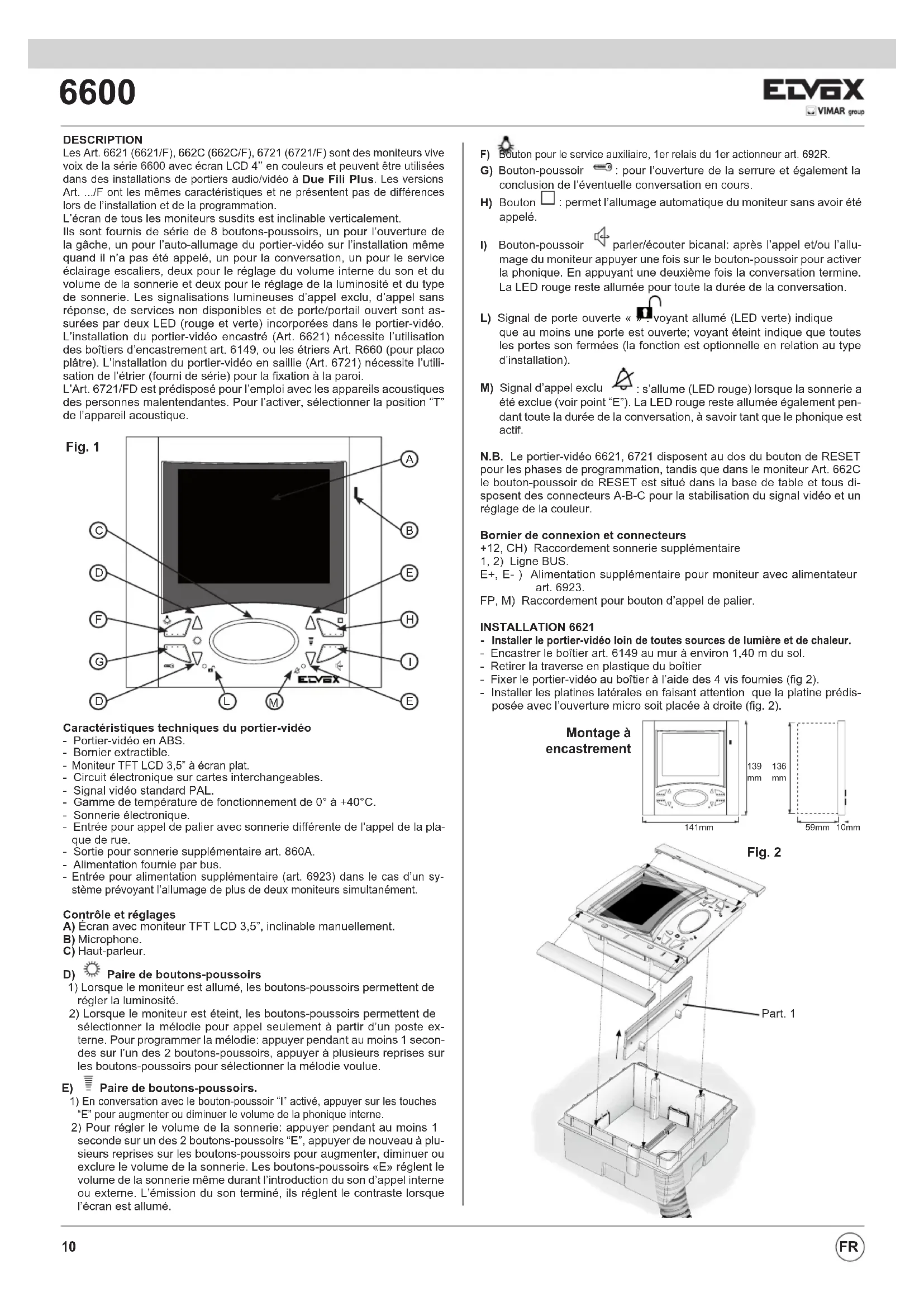 DESCRIPTION Les Art. 6621 (6621/F), 662C (662C/F), 6721 (6721/F) sont des moniteurs vive voix de la série 6600 avec écran LCD 4’’ en couleurs et peuvent être utilisées dans des installations de portiers audio/vidéo à Due Fili Plus . Les versions Art. .../F ont les mêmes caractéristiques et ne présentent pas de différences lors de l’installation et de la programmation. L’écran de tous les moniteurs susdits est inclinable verticalement. Ils sont fournis de série de 8 boutons-poussoirs, un pour l’ouverture de la gâche, un pour l’auto-allumage du portier-vidéo sur l’installation même quand il n’a pas été appelé, un pour la conversation, un pour le service éclairage escaliers, deux pour le réglage du volume interne du son et du volume de la sonnerie et deux pour le réglage de la luminosité et du type de sonnerie. Les signalisations lumineuses d’appel exclu, d’appel sans réponse, de services non disponibles et de porte/portail ouvert sont as- surées par deux LED (rouge et verte) incorporées dans le portier-vidéo. L’installation du portier-vidéo encastré (Art. 6621) nécessite l’utilisation des boîtiers d’encastrement art. 6149, ou les étriers Art. R660 (pour placo plâtre). L’installation du portier-vidéo en saillie (Art. 6721) nécessite l’utili- sation de l’étrier (fourni de série) pour la fixation à la paroi. L’Art. 6721/FD est prédisposé pour l’emploi avec les appareils acoustiques des personnes malentendantes. Pour l’activer, sélectionner la position “T” de l’appareil acoustique. Caractéristiques techniques du portier-vidéo - Portier-vidéo en ABS. - Bornier extractible.