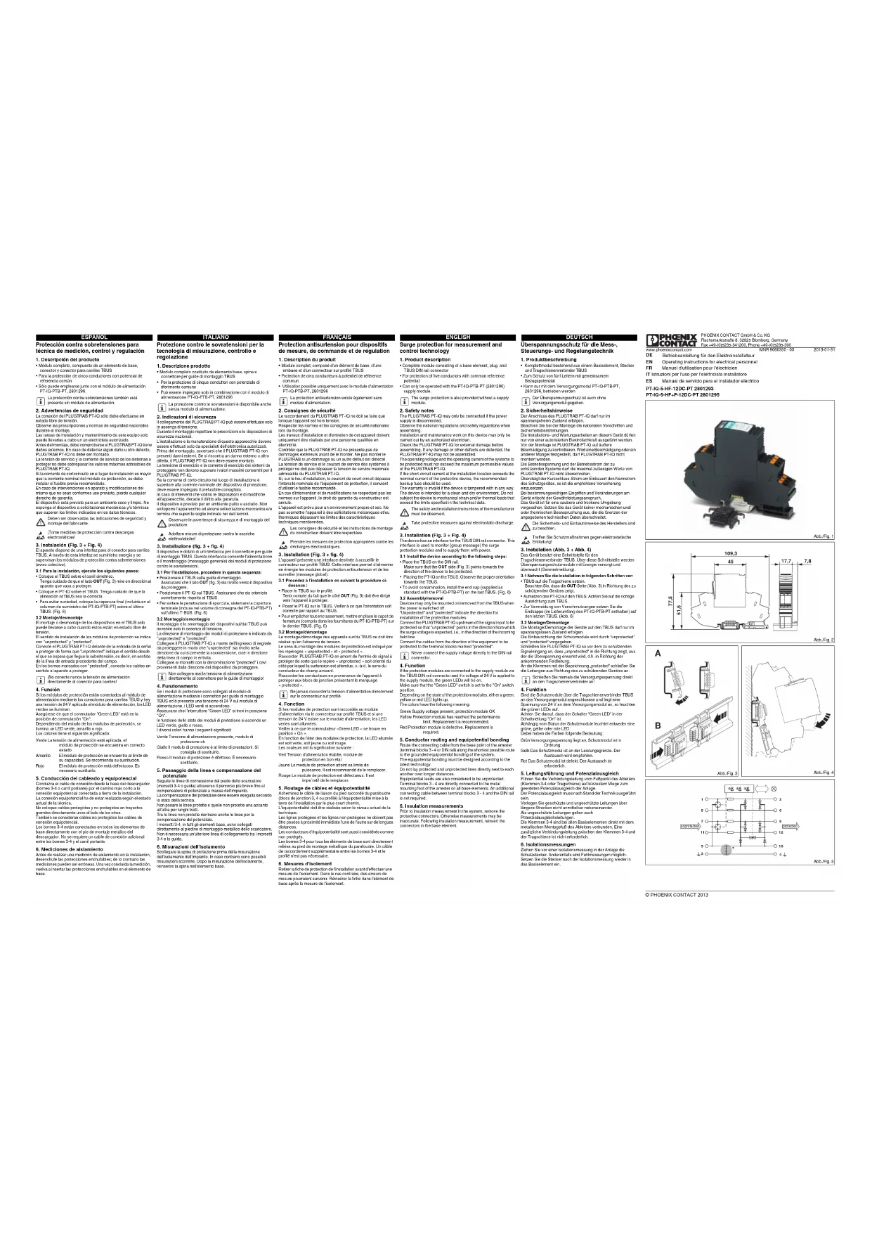 - Può essere impiegato solo in combinazione con il modulo di alimentazione PT-IQ-PTB-PT, 28012962. Indicazioni di sicurezzaIl collegamento del PLUGTRAB PT-IQ può essere effettuato solo in assenza di tensione.Durante il montaggio rispettare le prescrizioni e le disposizioni di sicurezza nazionali.L'installazione e la manutenzione di questo apparecchio devono essere effettuati solo da specialisti dell'elettronica autorizzati.Prima del montaggio, accertarsi che il PLUGTRAB PT-IQ non presenti danni esterni. Se si riscontra un danno esterno o altro difetto, il PLUGTRAB PT-IQ non deve essere montato.La tensione di esercizio e la corrente di esercizio dei sistemi da proteggere non devono superare i valori massimi consentiti per il PLUGTRAB PT-IQ.Se la corrente di corto circuito nel luogo di installazione è superiore alla corrente nominale del dispositivo di protezione, deve essere impiegato il prefusibile consigliato.In caso di interventi che violino le disposizioni e di modifiche all'apparecchio, decade il diritto alla garanzia.Il dispositivo è previsto per un ambiente pulito e asciutto. Non sottoporre l'apparecchio ad alcuna sollecitazione meccanica e/o termica che superi le soglie indicate nei dati tecnici.3. Installazione (fig. 3 + fig. 4)Il dispositivo è dotato di un'interfaccia per il connettore per guide di montaggio TBUS. Questa interfaccia consente l'alimentazione e il monitoraggio (messaggio generale) dei moduli di protezione contro le sovratensioni.3.1 Per l'installazione, procedere in questa sequenza:• Posizionare il TBUS sulla guida di montaggio. Assicurarsi che il lato OUT (fig.3) sia rivolto verso il dispositivo da proteggere.• Posizionare il PT-IQ sul TBUS. Assicurarsi che sia orientato correttamente rispetto al TBUS.• Per evitare la penetrazione di sporcizia, sistemare la copertura terminale (inclusa nel volume di consegna del PT-IQ-PTB-PT) sull'ultimo T-BUS. (Fig.6)3.2 Montaggio/smontaggioIl montaggio e lo smontaggio dei dispositivi sul/dal TBUS può avvenire solo in assenza di tensione.La direzione di montaggio dei moduli di protezione è indicata da "unprotected" e "protected".Collegare il PLUGTRAB PT-IQ a monte dell'ingresso di segnale da proteggere in modo che "unprotected" sia rivolto nella direzione da cui si prevede la sovratensione, cioè in direzione della linea di campo in entrata.Collegare ai morsetti con la denominazione "protected" i cavi provenienti dalla direzione del dispositivo da proteggere.4. FunzionamentoSe i moduli di protezione sono collegati al modulo di alimentazione mediante i connettori per guide di montaggio TBUS ed è presente una tensione di 24 V sul modulo di alimentazione, i LED verdi si accendono.Assicurarsi che l'interruttore "Green LED" si trovi in posizione "On".In funzione dello stato dei moduli di protezione si accende un LED verde, giallo o rosso.I diversi colori hanno i seguenti significati:5. Passaggio della linea e compensazione del potenzialeSeguite le linee di connessione dal piede dello scaricatore (morsetti 3-4 o guida) attraverso il percorso più breve fino al compensatore di potenziale a massa dell'impianto.La compensazione del potenziale deve essere eseguita secondo lo stato della tecnica.Non posare le linee protette e quelle non protette una accanto all'altra per lunghi tratti.Tra le linee non protette rientrano anche le linee per la compensazione del potenziale.I morsetti 3-4, in tutti gli elementi base, sono collegati direttamente al piedino di montaggio metallico dello scaricatore. Non è necessaria un'ulteriore linea di collegamento tra i morsetti 3-4 e la guida.6. Misurazioni dell'isolamentoScollegare la spina di protezione prima della misurazione dell'isolamento dell'impianto. In caso contrario sono possibili misurazioni scorrette. Dopo la misurazione dell'isolamento, reinserire la spina nell'elemento base.La protezione contro le sovratensioni è disponibile anche senza modulo di alimentazione.Osservare le avvertenze di sicurezza e di montaggio del produttore.Adottare misure di protezione contro le scariche elettrostatiche!Non collegare mai la tensione di alimentazione direttamente al connettore per le guide di montaggio!Verde Tensione di alimentazione presente, modulo di protezione okGiallo Il modulo di protezione è al limite di prestazioni. Si consiglia di sostituirlo.Rosso Il modulo di protezione è difettoso. È necessario sostituirlo. Protection antisurtension pour dispositifs de mesure, de commande et de régulation 1. Description du produit• Module complet, composé d'un élément de base, d'une embase et d'un connecteur sur profilé TBUS• Protection de cinq conducteurs à potentiel de référence commun