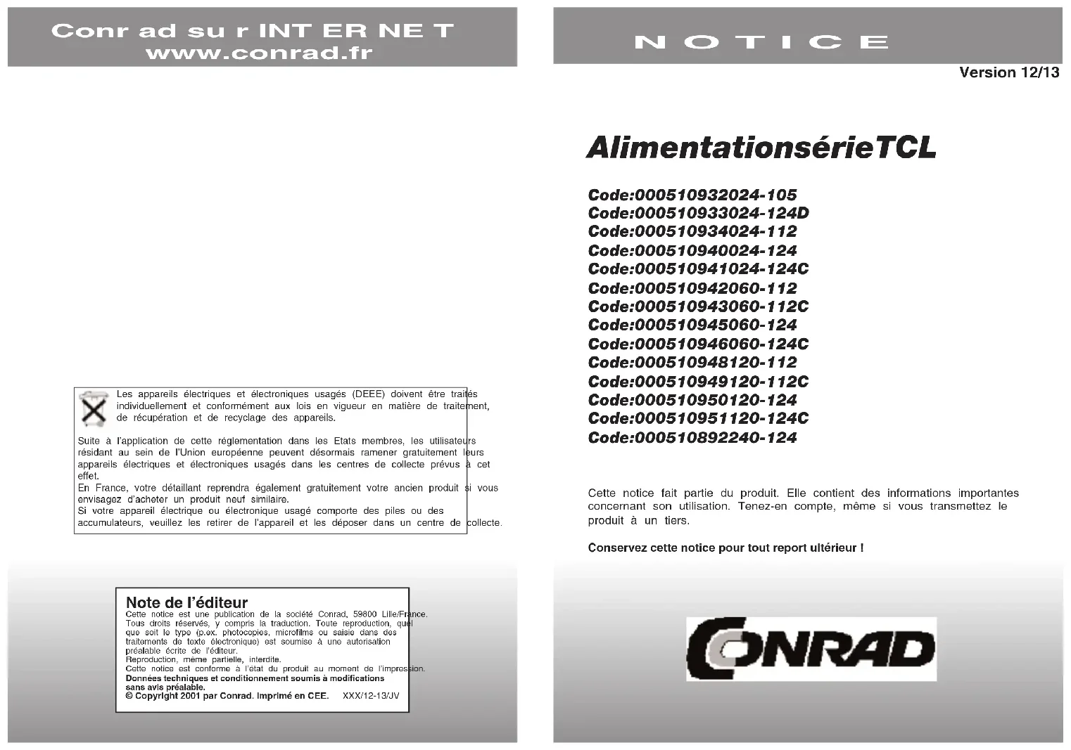 Note de l’éditeur Cette notice est une publication de la société Conrad, 59800 Lille/France.Tous droits réservés, y compris la traduction. Toute reproduction, quelque soit le type (p.ex. photocopies, microfilms ou saisie dans destraitements de texte électronique) est soumise à une autorisationpréalable écrite de l’éditeur.Reproduction, même partielle, interdite.Cette notice est conforme à l’état du produit au moment de l’impression.Données techniques et conditionnement soumis à modificationssans avis préalable. © Copyright 2001 par Conrad. Imprimé en CEE. XXX/12-13/JV Alimentation série TCL Code : 000510932 024-105 Code : 000510933 024-124D Code : 000510934 024-112 Code : 000510940 024-124 Code : 000510941 024-124C Code : 000510942 060-112 Code : 000510943 060-112C Code : 000510945 060-124 Code : 000510946 060-124C Code : 000510948 120-112 Code : 000510949 120-112C Code : 000510950 120-124 Code : 000510951 120-124C Code : 000510892 240-124 Cette notice fait partie du produit. Elle contient des informations importantes concernant son utilisation. Tenez-en compte, même si vous transmettez le produit à un tiers. Conservez cette notice pour tout report ultérieur ! N O T I C E Conr ad su r INT ER NE T www.conrad.fr Version 12/13 Les appareils électriques et électroniques usagés (DEEE) doivent être traités individuellement et conformément aux lois en vigueur en matière de traitement, de récupération et de recyclage des appareils. Suite à l’application de cette réglementation dans les Etats membres, les utilisateurs résidant au sein de l’Union européenne peuvent désormais ramener gratuitement leurs appareils électriques et électroniques usagés dans les centres de collecte prévus à cet effet. En France, votre détaillant reprendra également gratuitement votre ancien produit si vous envisagez d’acheter un produit neuf similaire. Si votre appareil électrique ou électronique usagé comporte des piles ou des accumulateurs, veuillez les retirer de l’appareil et les déposer dans un centre de collecte.Consignes de sécurité