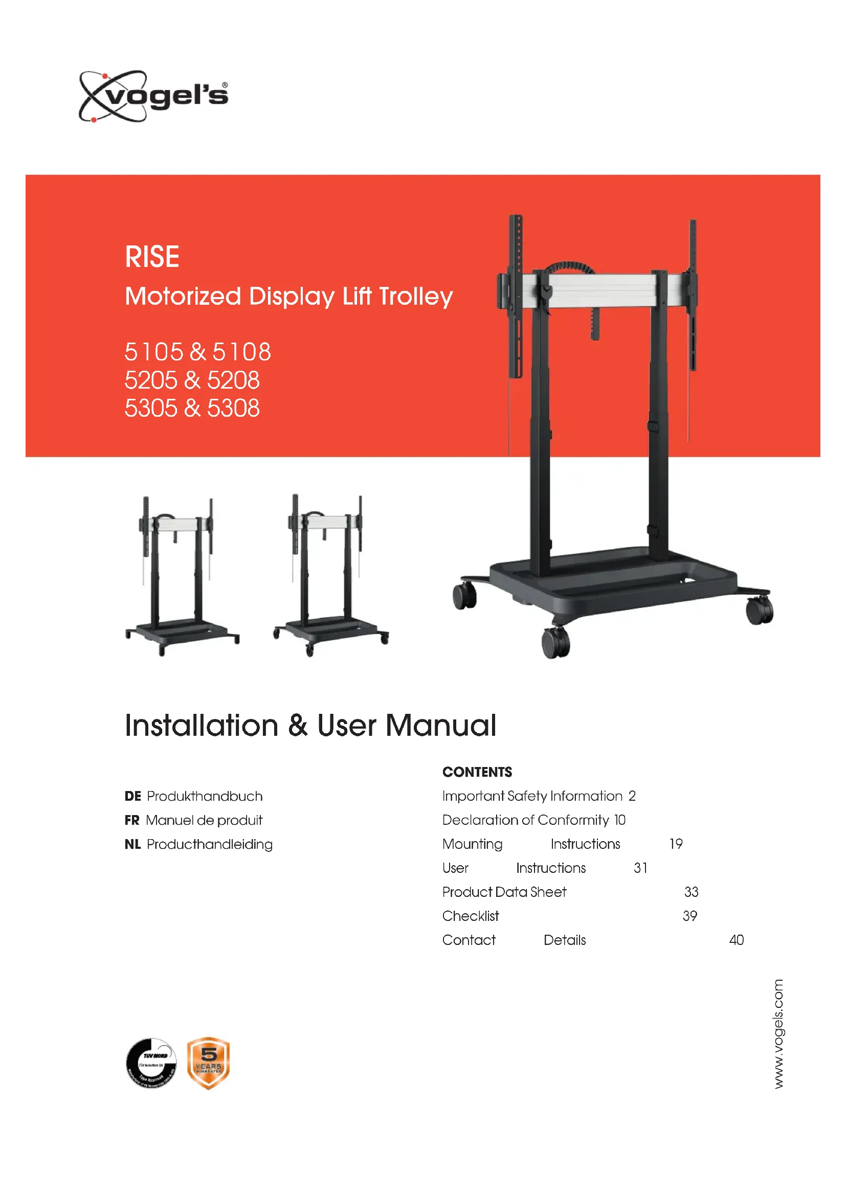 Informations importantes concernant la sécurité - FR Informations importantes concernant la sécurité de l’installateur et de l’utilisateur Installateur: Avant de commencer l’installation, lisez attentivement les consignes de sécurité, les règles d’installation et le reste de ce manuel de produit. Si vous ne lisez pas, ne comprenez pas bien ou ne suivez pas toutes les instructions, vous risquez de vous blesser gravement, d’endommager l’équipement ou d’annuler la garantie d’usine! Il est de la responsabilité de l’installateur certifié de s’assurer que tous les systèmes de montage/accessoires sont correctement assemblés et installés en utilisant les instructions fournies. Utilisateur: Veuillez lire attentivement les informations de sécurité ci-dessous et le manuel d’utilisation (si inclus) avant d’utiliser le support réglable en hauteur ou le chariot. Cela garantit le bon fonctionnement de l’appareil et évite les accidents. Sécurité électrique Ne branchez l’appareil que sur une prise de courant correctement mise à la terre. Assurez-vous que l’appareil peut être immédiatement isolé de la prise de courant. N’utilisez l’appareil que dans des pièces sèches, protégez-le de l’eau et d’autres liquides. N’essuyez l’appareil qu’avec un chiffon sec. N’ouvrez pas le système de levage. RISQUE DE CHOC ÉLECTRIQUE. Il n’y a aucune pièce réparable à l’intérieur. En cas de dysfonctionnement, débranchez l’appareil de la prise de courant et appelez un technicien agréé. Ne marchez pas sur le cordon d’alimentation et ne l’endommagez pas de quelque manière que ce soit. Remplacez immédiatement les cordons de ligne endommagés par des cordons neufs identiques. Sécurité mécanique Veillez à ce que l’installation de l’appareil soit effectuée par un technicien agréé. Utilisez uniquement les pièces de montage d’origine fournies avec le système et n’utilisez pas d’accessoires non recommandés par le fabricant. Ne chargez pas l’appareil de manière incorrecte: Pour connaître la charge maximale de l’appareil, veuillez vous reporter à la fiche technique de ce manuel. Ne dépassez pas la charge indiquée: L’utilisation d’écrans plus lourds peut entraîner une instabilité et le basculement de l’appareil et provoquer des blessures graves ou mortelles! La fonction de réglage en hauteur de cet appareil ne fonctionnera pas correctement si le poids dépasse la charge maximale indiquée. Utilisez ce système de montage uniquement pour l’usage auquel il est destiné, tel que décrit dans ces instructions. Ne vous accrochez pas à l’appareil. APPAREIL TRÈS LOURD. Risque de blessures graves lorsque l’appareil se renverse en raison d’une utilisation incorrecte. Les prises de courant de l’appareil et de la prise murale doivent être facilement accessibles. Débranchez la prise secteur avant de déplacer le produit. Veillez à ce que le produit puisse bouger librement. Avant de déplacer l’appareil vers le haut ou vers le bas, assurez une distance de sécurité d’au moins 20cm entre toute partie de l’appareil et toute autre pièce afin d’éviter les cisaillements ou les écrasements. En cas d’accident, veuillez libérer le panneau de commande. L’appareil s’arrêtera de bouger immédiatement. Fonction anti-collision et utilisation prévue La détection de collision est un système permettant de détecter tout contact entre le système de levage d’écran et un objet, afin réduire l’impact. Ce système de détection de collision est destiné à la protection du système de levage d’écran, mais il n’est pas explicitement conçu comme un mécanisme de sécurité pour prévenir les blessures corporelles. Votre appareil est-il équipé de roues? N’utilisez les roues de l’appareil que sur des sols plats et stables. Déplacez l’appareil sur des sols plats uniquement. Risque de basculement en cas d’utilisation sur des sols inégaux, du passage des seuils de porte, etc. APPAREIL TRÈS LOURD. Risque de blessures graves en cas de basculement de l’appareil. Bloquez les freins des roues avant lors de l’utilisation de l’appareil. Déplacez toujours votre chariot avec l’écran dans sa position la plus basse. Les prises de courant de l’appareil et de la prise murale doivent être facilement accessibles. Débranchez la prise secteur avant de déplacer le produit. Règles de montage AVERTISSEMENT Une installation correcte est extrêmement importante et ne relève pas de la responsabilité de Vogel’s Products. Une installation incorrecte peut entraîner des blessures corporelles ou des dommages matériels. Vogel’s Products ne sera en aucun cas responsable si le produit a été installé incorrectement. Les accessoires de montage ne sont pas inclus avec le produit pour des raisons de sécurité, car les propriétés et la force portante des murs/plafonds dépendent de la situation. Les accessoires de montage appropriés doivent être choisis en fonction du matériau du mur/plafond. Consultez un spécialiste dans le domaine ou un magasin spécialisé pour le choix des accessoires de montage. Il est de la responsabilité de l’installateur de s’assurer que le mur/plafond peut supporter au moins quatre fois le poids combiné de l’écran/projecteur et du support. La charge maximale de ce produit est indiquée dans ces instructions de montage. Les instructions d’installation et d’utilisation de l’écran/projecteur doivent également être suivies pour un emplacement et une fixation corrects de l’écran/projecteur. En cas de problèmes techniques, veuillez contacter votre installateur. 5RISE 5105/5108/5205/5208/5305/5308