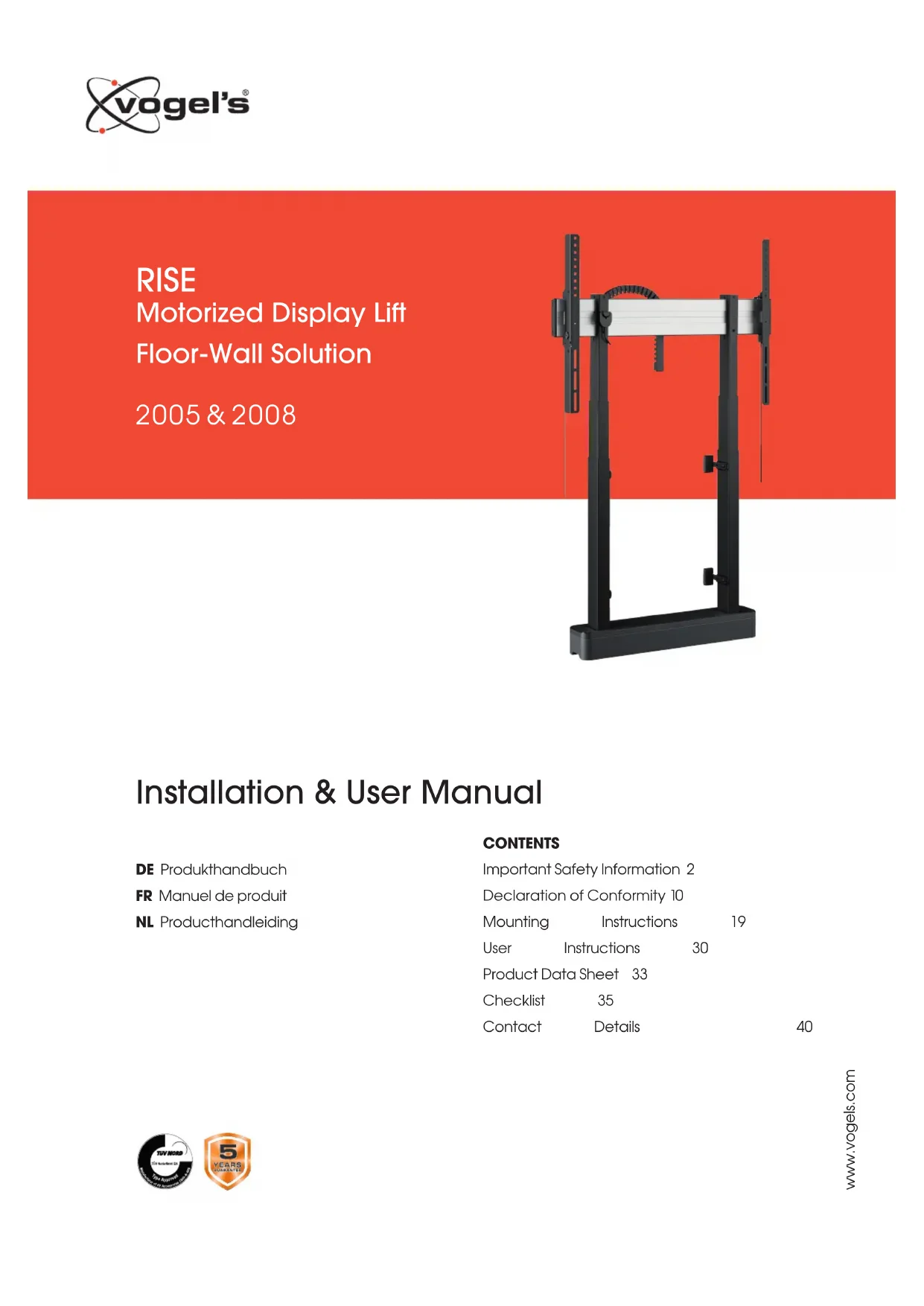 Informations importantes concernant la sécurité - FR Informations importantes concernant la sécurité de l’installateur et de l’utilisateur Installateur: Avant de commencer l’installation, lisez attentivement les consignes de sécurité, les règles d’installation et le reste de ce manuel de produit. Si vous ne lisez pas, ne comprenez pas bien ou ne suivez pas toutes les instructions, vous risquez de vous blesser gravement, d’endommager l’équipement ou d’annuler la garantie d’usine! Il est de la responsabilité de l’installateur certifié de s’assurer que tous les systèmes de montage/accessoires sont correctement assemblés et installés en utilisant les instructions fournies. Utilisateur: Veuillez lire attentivement les informations de sécurité ci-dessous et le manuel d’utilisation (si inclus) avant d’utiliser le support réglable en hauteur ou le chariot. Cela garantit le bon fonctionnement de l’appareil et évite les accidents. Sécurité électrique Ne branchez l’appareil que sur une prise de courant correctement mise à la terre. Assurez-vous que l’appareil peut être immédiatement isolé de la prise de courant. N’utilisez l’appareil que dans des pièces sèches, protégez-le de l’eau et d’autres liquides. N’essuyez l’appareil qu’avec un chiffon sec. N’ouvrez pas le système de levage. RISQUE DE CHOC ÉLECTRIQUE. Il n’y a aucune pièce réparable à l’intérieur. En cas de dysfonctionnement, débranchez l’appareil de la prise de courant et appelez un technicien agréé. Ne marchez pas sur le cordon d’alimentation et ne l’endommagez pas de quelque manière que ce soit. Remplacez immédiatement les cordons de ligne endommagés par des cordons neufs identiques. Sécurité mécanique Veillez à ce que l’installation de l’appareil soit effectuée par un technicien agréé. Utilisez uniquement les pièces de montage d’origine fournies avec le système et n’utilisez pas d’accessoires non recommandés par le fabricant. Ne chargez pas l’appareil de manière incorrecte: Pour connaître la charge maximale de l’appareil, veuillez vous reporter à la fiche technique de ce manuel. Ne dépassez pas la charge indiquée: L’utilisation d’écrans plus lourds peut entraîner une instabilité et le basculement de l’appareil et provoquer des blessures graves ou mortelles! La fonction de réglage en hauteur de cet appareil ne fonctionnera pas correctement si le poids dépasse la charge maximale indiquée. Utilisez ce système de montage uniquement pour l’usage auquel il est destiné, tel que décrit dans ces instructions. Ne vous accrochez pas à l’appareil. APPAREIL TRÈS LOURD. Risque de blessures graves lorsque l’appareil se renverse en raison d’une utilisation incorrecte. Les prises de courant de l’appareil et de la prise murale doivent être facilement accessibles. Débranchez la prise secteur avant de déplacer le produit. Veillez à ce que le produit puisse bouger librement. Avant de déplacer l’appareil vers le haut ou vers le bas, assurez une distance de sécurité d’au moins 20cm entre toute partie de l’appareil et toute autre pièce afin d’éviter les cisaillements ou les écrasements. En cas d’accident, veuillez libérer le panneau de commande. L’appareil s’arrêtera de bouger immédiatement. Fonction anti-collision et utilisation prévue La détection de collision est un système permettant de détecter tout contact entre le système de levage d’écran et un objet, afin réduire l’impact. Ce système de détection de collision est destiné à la protection du système de levage d’écran, mais il n’est pas explicitement conçu comme un mécanisme de sécurité pour prévenir les blessures corporelles. Votre appareil est-il équipé de roues? N’utilisez les roues de l’appareil que sur des sols plats et stables. Déplacez l’appareil sur des sols plats uniquement. Risque de basculement en cas d’utilisation sur des sols inégaux, du passage des seuils de porte, etc. APPAREIL TRÈS LOURD. Risque de blessures graves en cas de basculement de l’appareil. Bloquez les freins des roues avant lors de l’utilisation de l’appareil. Déplacez toujours votre chariot avec l’écran dans sa position la plus basse. Les prises de courant de l’appareil et de la prise murale doivent être facilement accessibles. Débranchez la prise secteur avant de déplacer le produit. Règles de montage AVERTISSEMENT Une installation correcte est extrêmement importante et ne relève pas de la responsabilité de Vogel’s Products. Une installation incorrecte peut entraîner des blessures corporelles ou des dommages matériels. Vogel’s Products ne sera en aucun cas responsable si le produit a été installé incorrectement. Les accessoires de montage ne sont pas inclus avec le produit pour des raisons de sécurité, car les propriétés et la force portante des murs/plafonds dépendent de la situation. Les accessoires de montage appropriés doivent être choisis en fonction du matériau du mur/plafond. Consultez un spécialiste dans le domaine ou un magasin spécialisé pour le choix des accessoires de montage. Il est de la responsabilité de l’installateur de s’assurer que le mur/plafond peut supporter au moins quatre fois le poids combiné de l’écran/projecteur et du support. La charge maximale de ce produit est indiquée dans ces instructions de montage. Les instructions d’installation et d’utilisation de l’écran/projecteur doivent également être suivies pour un emplacement et une fixation corrects de l’écran/projecteur. En cas de problèmes techniques, veuillez contacter votre installateur. 5RISE 2005 & 2008