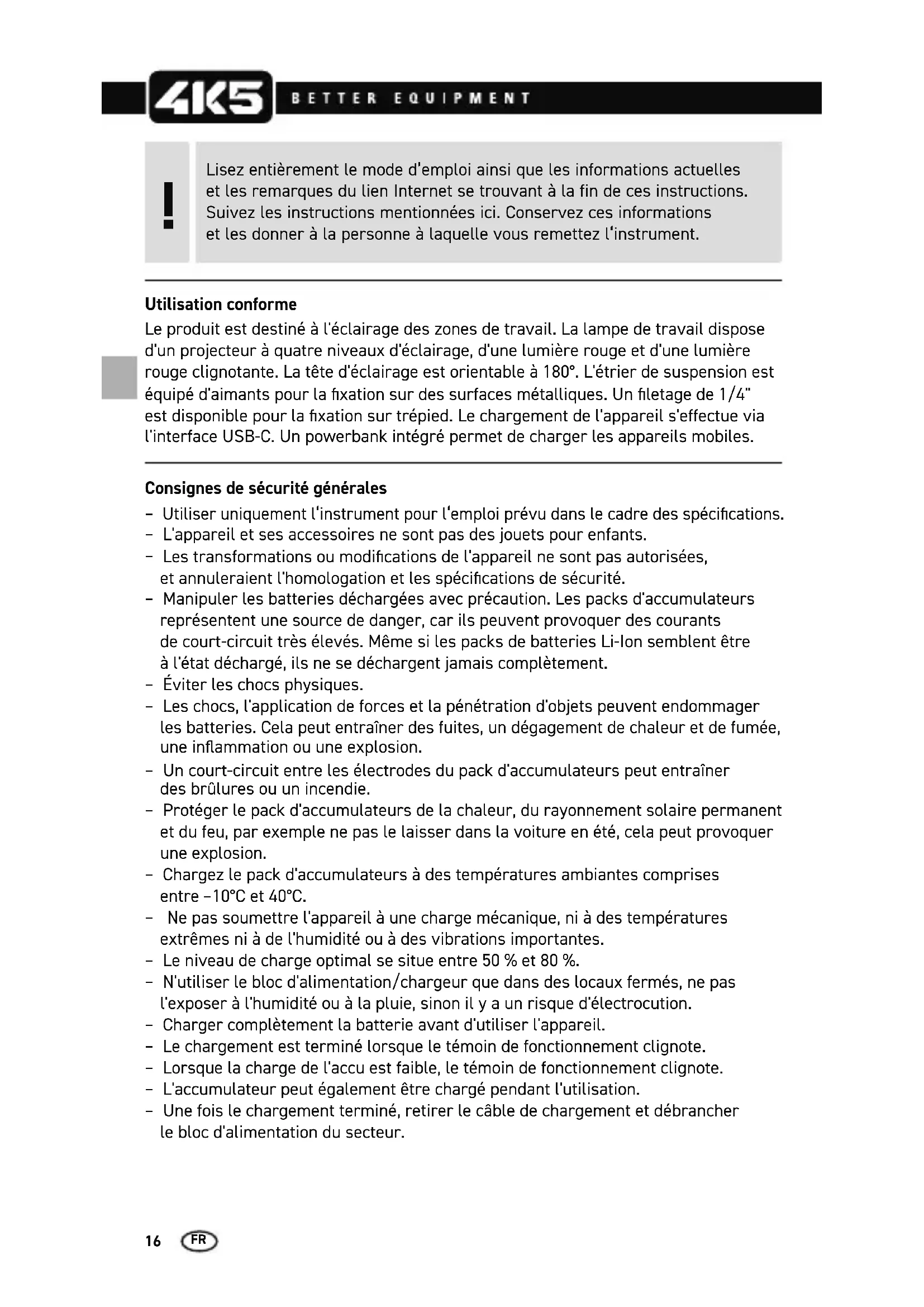 Utilisation conforme Le produit est destiné à l'éclairage des zones de travail. La lampe de travail dispose d'un projecteur à quatre niveaux d'éclairage, d'une lumière rouge et d'une lumière rouge clignotante. La tête d'éclairage est orientable à 180°. L'étrier de suspension est équipé d'aimants pour la xation sur des surfaces métalliques. Un letage de 1/4" est disponible pour la xation sur trépied. Le chargement de l'appareil s'effectue via l'interface USB-C. Un powerbank intégré permet de charger les appareils mobiles. Consignes de sécurité générales – Utiliser uniquement l‘instrument pour l‘emploi prévu dans le cadre des spécications.
