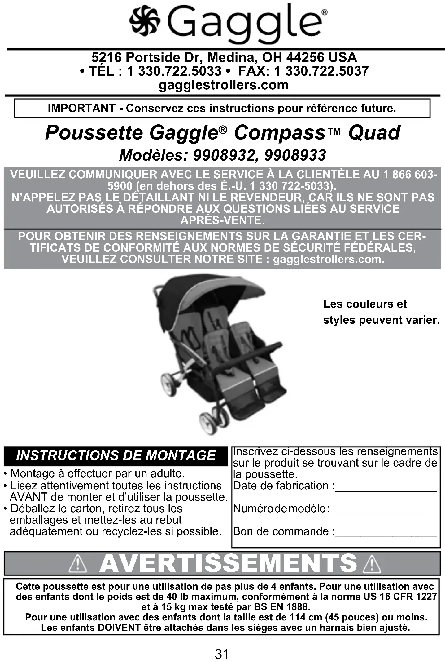 - Déballez le carton, retirez tous les emballages et mettez-les au rebut adéquatement ou recyclez-les si possible. Inscrivez ci-dessous les renseignements sur le produit se trouvant sur le cadre de la poussette. Date de fabrication :________________ Numéro de modèle : _______________ Bon de commande :________________ IMPORTANT - Conservez ces instructions pour référence future. Cette poussette est pour une utilisation de pas plus de 4 enfants. Pour une utilisation avec des enfants dont le poids est de 40 lb maximum, conformément à la norme US 16 CFR 1227 et à 15 kg max testé par BS EN 1888.Pour une utilisation avec des enfants dont la taille est de 114 cm (45 pouces) ou moins.Les enfants DOIVENT être attachés dans les sièges avec un harnais bien ajusté.Table des matières Table des matières............................................................................. Avertissements................................................. ............................... Instructions de montage Outils et pièces............................................................................. Étape 1 : Montage de l’essieu arrière et des freins...................... Étape 2 : Montage des roues arrière............................................ Étape 3 : Montage des roues doubles avant................................ Étape 4 : Montage du guidon....................................................... Étape 5 : Montage de l’auvent...................................................... Étape 6 : Enlèvement de la canopée / Assemblage du porte-gobelet....................................... Fonctionnement et utilisation de la poussette Déplier et plier la poussette......................................................... Attacher les enfants dans la poussette........................................ Régler l’inclinaison des dossiers................................................. Se servir du frein à main............................................................. Verrouiller la rotation des roues doubles avant........................... Démonter et remplacer le guidon................................................ Se servir de l’auvent.................................................................... Entretien de la poussette Nettoyage...................................................................................
