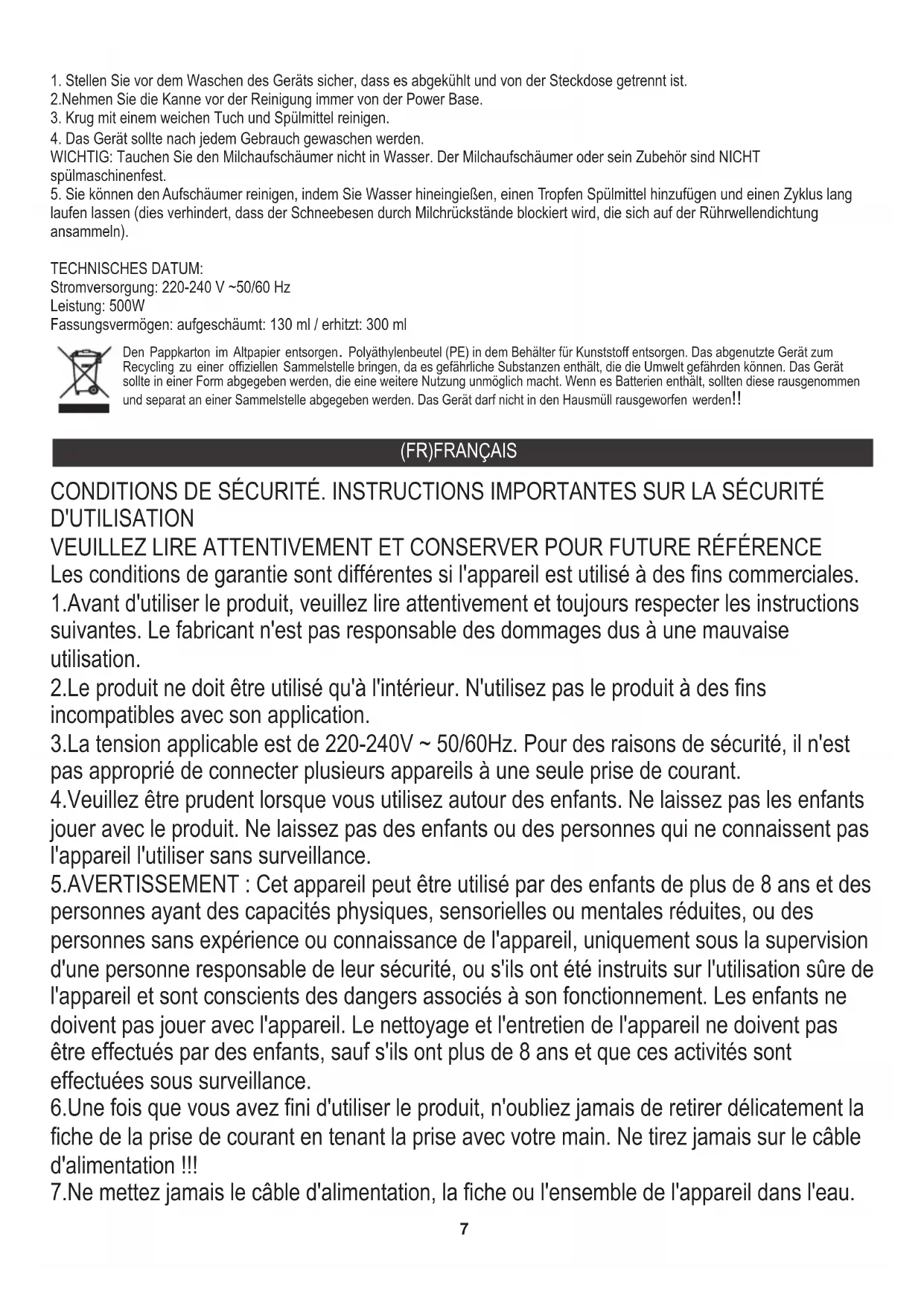 DONNEES TECHNIQUES : - une fois - si vous souhaitez chauffer et faire mousser votre lait (avec le fouet 1b) pour obtenir la mousse du cappucino Le voyant au-dessus de la fonction clignotera pendant 2 secondes et le mousseur à lait commencera à fonctionner automatiquement. Puissance : 500W Alimentation : 220-240V ~50/60Hz 5.Vous pouvez nettoyer le mousseur en y versant de l'eau, en ajoutant une goutte de savon à vaisselle et en faisant fonctionner pendant un cycle (cela empêche le fouet de se bloquer par les sédiments de lait qui s'accumulent sur le joint de l'arbre de l'agitateur). Respect de l'environnement. Nous vous prions de bien vouloir trier les emballages en carton ainsi que les sachets plastiques (en polyéthylène). L'appareil usagé ne doit pas être jeté à la poubelle mais remis au point de collecte prévu à cet effet car il contient des éléments pouvant être nocifs pour l'environnement. L'appareil électrique doit être remis de manière à limiter au maximum une éventuelle utilisation ultérieure. Si l'appareil contient des piles, il faut les retirer et les remettre à un autre point de collecte. Ne pas jeter l'appareil dans une poubelle de déchets ménagers !!!