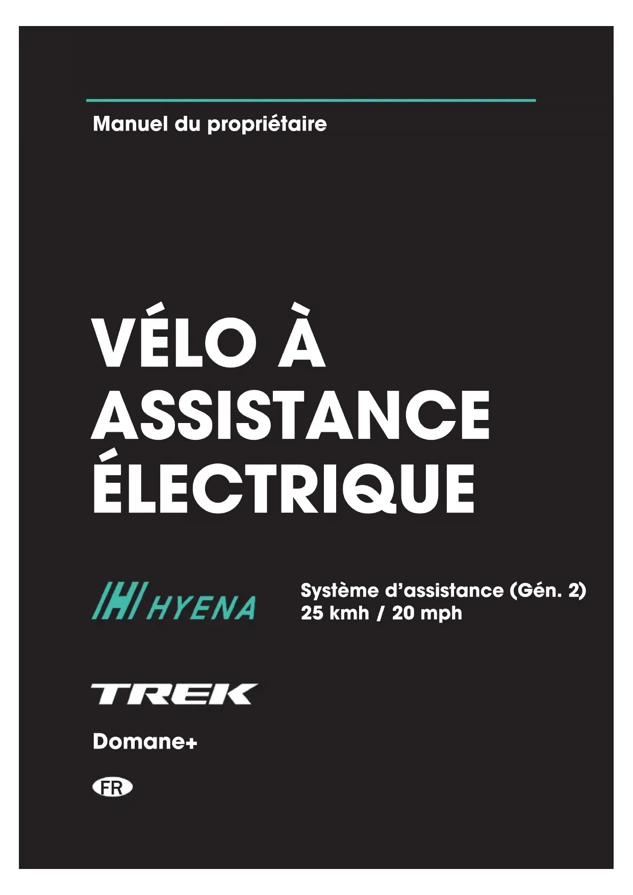 AVERTISSEMENT Le non respect des instructions de cette section peut endommager les composants de votre VAE et annuler la garantie, et surtout causer des blessures graves voire mortelles.FR-25 Hyena Inc. Tél +886 4 23598810 Fax +886 4 23598610 www.hyena-ebike.com Adresse : No.25, Jingke N. Rd., Nantun Dist.,Taichung City 408, Taiwan (R.O.C.)FR-26 Coordonnées Siège américain Trek US Service client 801 W Madison street Waterloo, Wisconsin 53594, USA Tél : +1 920.478.4678 Siège européen Bikeurope B.V./Trek Benelux Service client Ceintuurbaan 2-20C 3847 LG Harderwijk Pays-Bas Tél : +31 (0)88-4500699 Trek South West Europe Ronda de Poniente, 12. 1ª Dcha Parque Empresarial Euronova 28760 Tres Cantos Espagne Tél. : +33 (0)562120810 (France) www.trekbikes.com Garantie limitée Votre vélo est couvert par une garantie limitée. Veuillez consulter notre site Internet pour plus de détails. Contactez votre revendeur de vélos local agréé pour toute demande concernant l’entretien et la garantie. Consultez le site Internet de Trek (Assistance) pour obtenir la dernière version de ce manuel. Les nouvelles fonctionnalités décrites dans la dernière version du manuel ne s’appliquent peut-être pas à votre VAE. Réf. 5279736 FR - Rév. 1, Avril 2022 © 2022 Trek Bicycle Corporation. Tous droits réservés.Réf. 5279736 - FR Rév. 1 (Gen-2)
