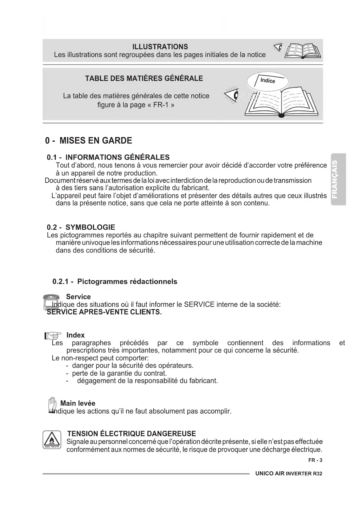 ATTENTION Indique que le personnel préposé à la réparation doit gérer l’appareil conformément à la notice d’installation. LORSQUE VOUS UTILISEZ DES APPAREILS ÉLECTRIQUES, IL EST TOUJOURS NÉCESSAIRE DE SUIVRE SCRUPULEUSEMENT LES CONSIGNES DE SÉCURITÉ FONDAMENTALES AFIN DE RÉDUIRE LES RISQUES D’INCENDIE ET D’ÉLECTROCHOCS ET ACCIDENTS A PERSONNES, Y COMPRIS CE QUI SUIT :UNICO AIR INVERTER R32 FR - 5 FRANÇAIS