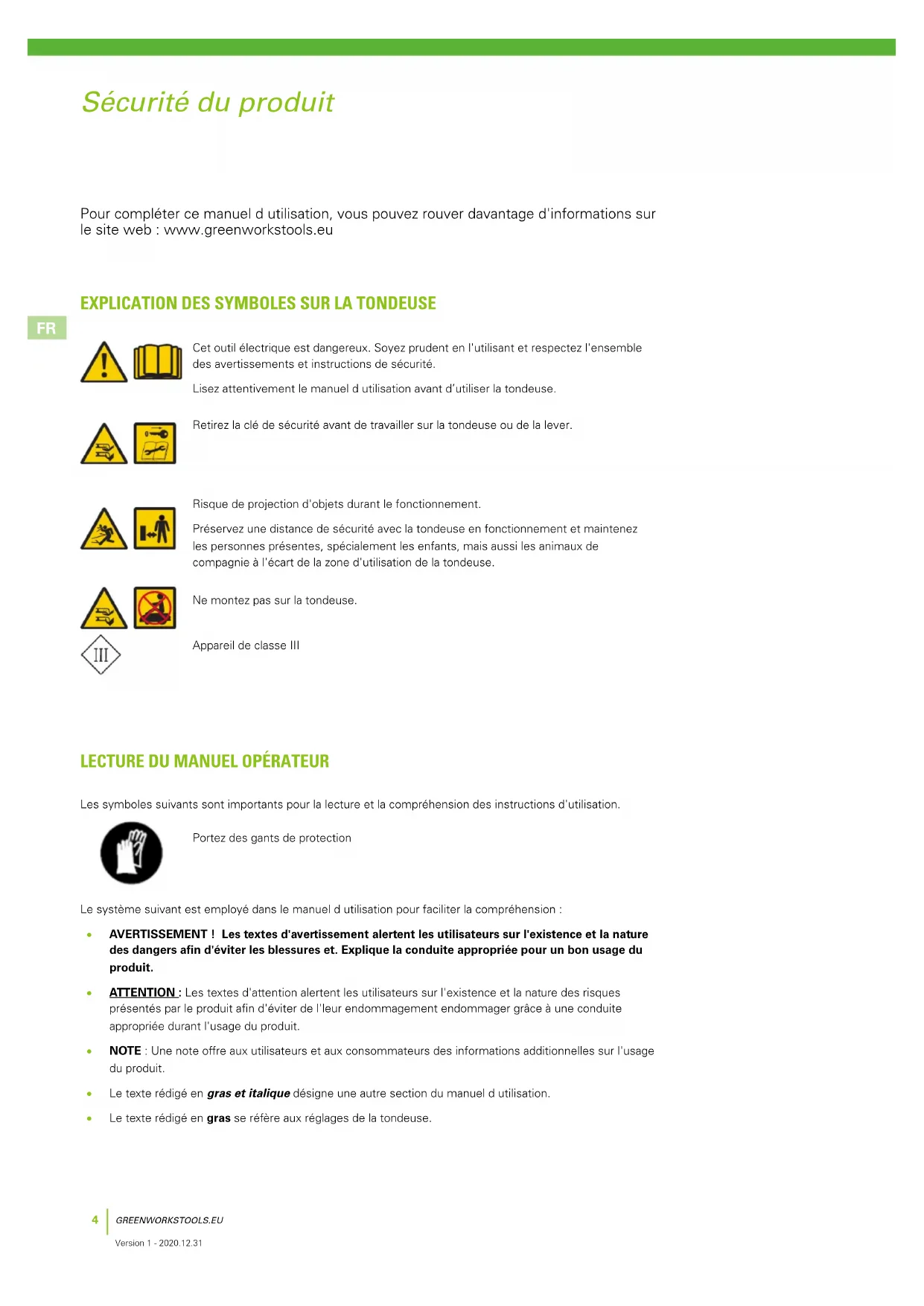 Cet outil électrique est dangereux. Soyez prudent en l'utilisant et respectez l'ensemble des avertissements et instructions de sécurité. Lisez attentivement le manuel d utilisation avant d’utiliser la tondeuse. Retirez la clé de sécurité avant de travailler sur la tondeuse ou de la lever. Risque de projection d'objets durant le fonctionnement. Préservez une distance de sécurité avec la tondeuse en fonctionnement et maintenez les personnes présentes, spécialement les enfants, mais aussi les animaux de compagnie à l'écart de la zone d'utilisation de la tondeuse. Ne montez pas sur la tondeuse. Appareil de classe III Pour compléter ce manuel d utilisation, vous pouvez rouver davantage d'informations sur le site web : www.greenworkstools.eu