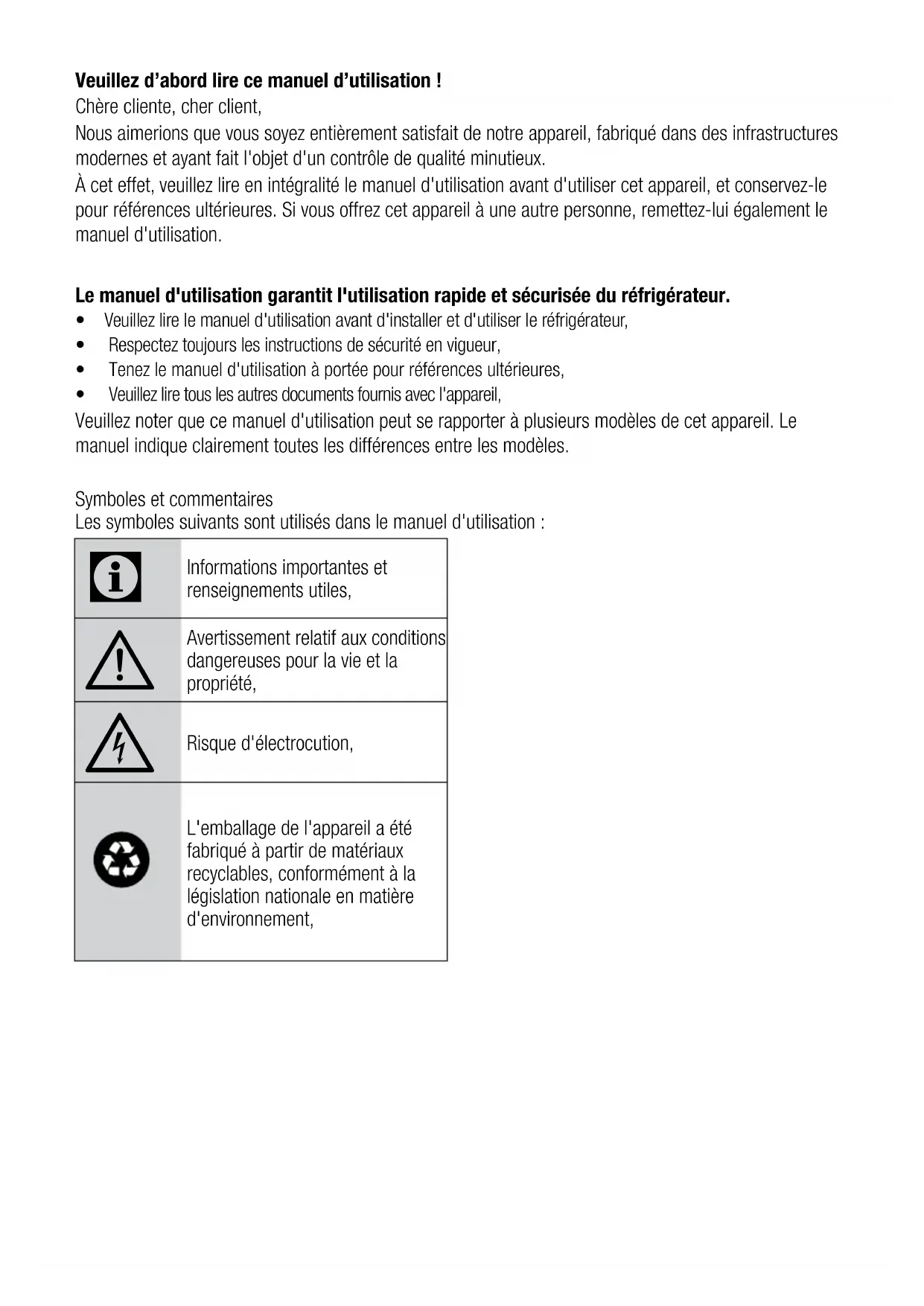 - 6.2. Protection des surfaces en plastique 7 Dépannage 42 Table des matières3 / 42 FR Réfrigérateur / Manuel d’utilisation 1 Instructions en matière de sécurité et d’environnement Cette section fournit les instructions de sécurité nécessaires à la prévention des risques de blessures ou de dommage matériel. Le non- respect de ces instructions annule tous les types de garantie de l'appareil. Utilisation Préconisée p. 41