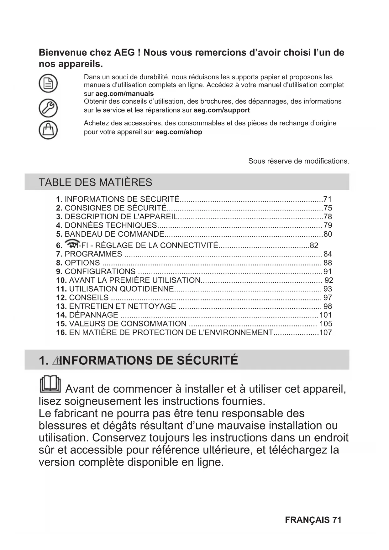 Recycle materials with the symbol . Put the packaging in relevant containers to recycle it. Help protect the environment and human health by recycling waste of electrical and electronic appliances. Do not dispose of appliances marked with the symbol with the household waste. Return the product to your local recycling facility or contact your municipal office. 70 ENGLISHBienvenue chez AEG ! Nous vous remercions d’avoir choisi l’un de nos appareils. Table title.Dans un souci de durabilité, nous réduisons les supports papier et proposons lesmanuels d’utilisation complets en ligne. Accédez à votre manuel d’utilisation completsur aeg.com/manualsObtenir des conseils d’utilisation, des brochures, des dépannages, des informationssur le service et les réparations sur aeg.com/supportAchetez des accessoires, des consommables et des pièces de rechange d’originepour votre appareil sur aeg.com/shopSous réserve de modifications.