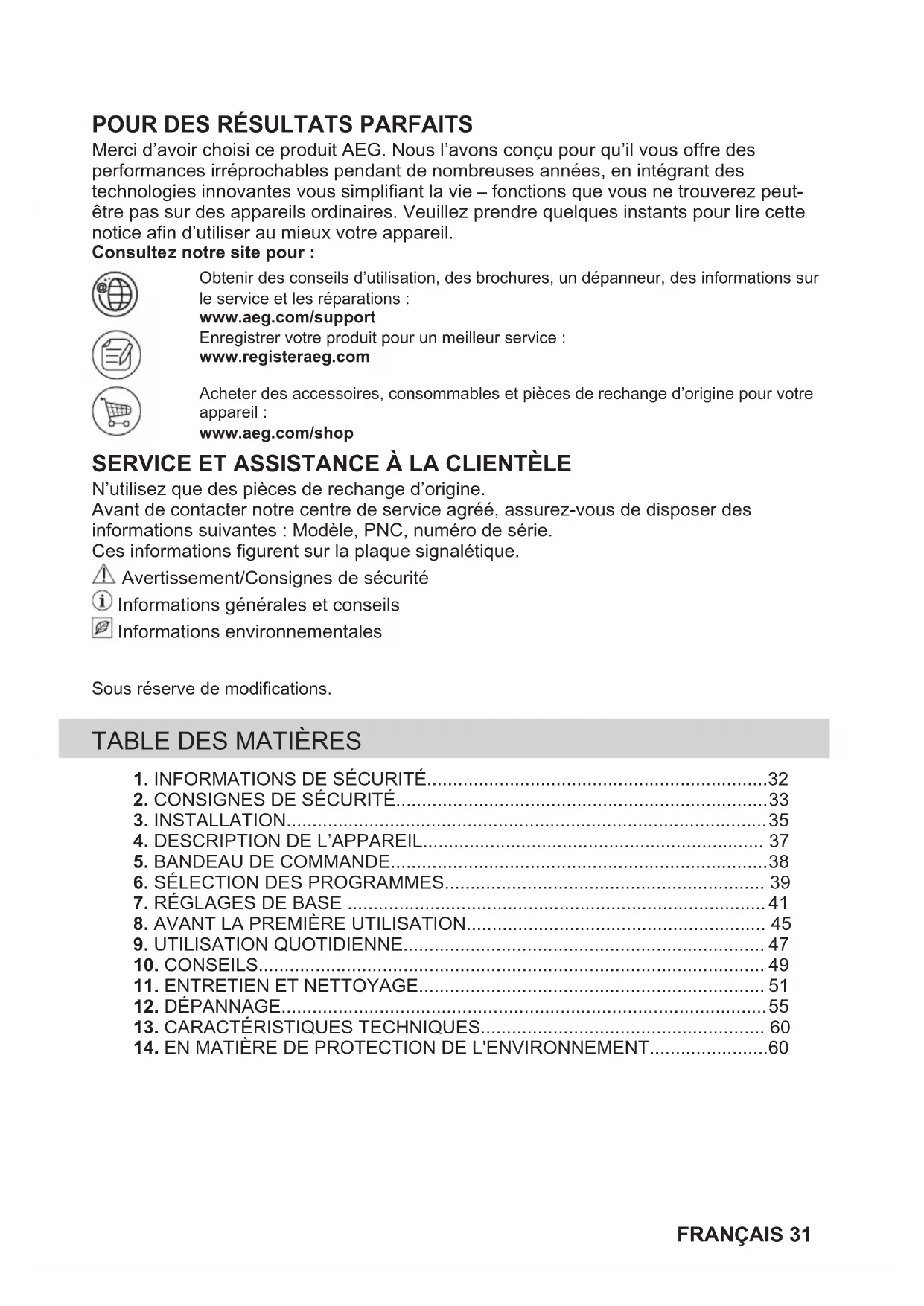N’utilisez que des pièces de rechange d’origine. Avant de contacter notre centre de service agréé, assurez-vous de disposer des informations suivantes : Modèle, PNC, numéro de série. Ces informations figurent sur la plaque signalétique. Avertissement/Consignes de sécurité Informations générales et conseils Informations environnementales Sous réserve de modifications.