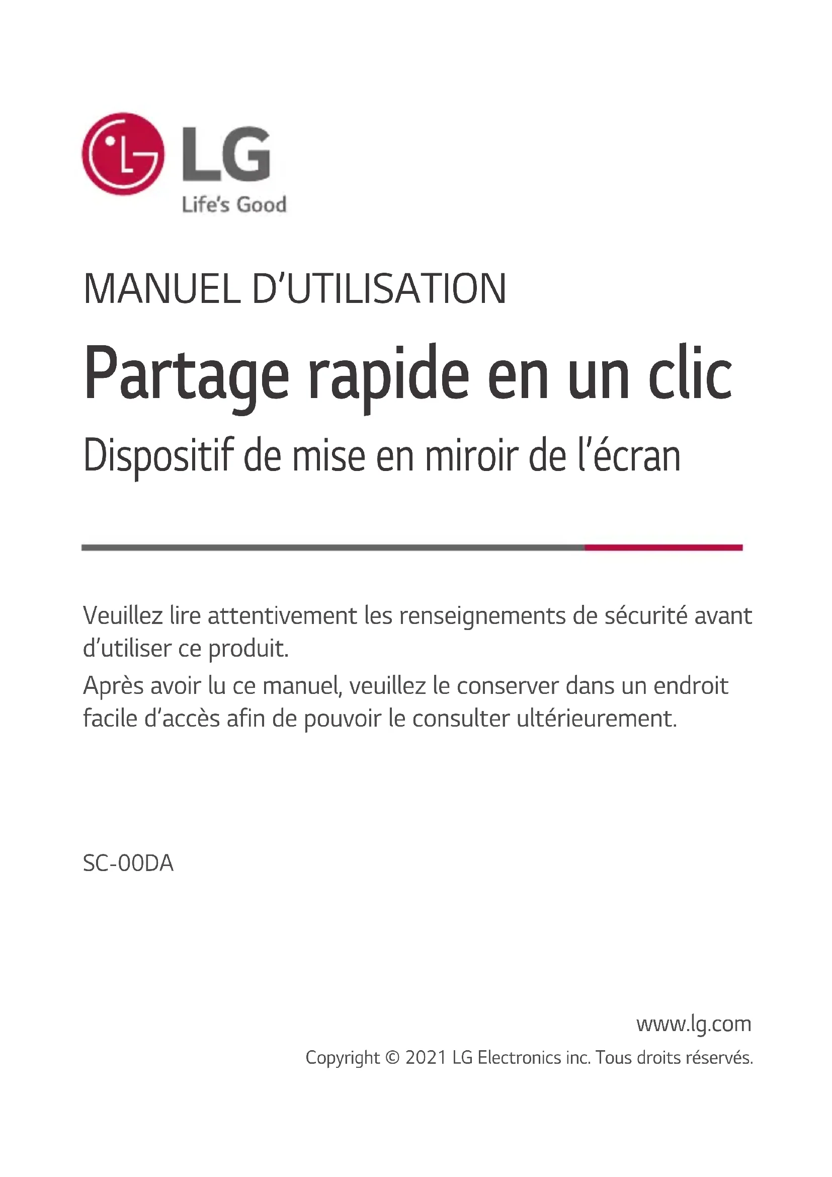 Partage rapide en un clic Dispositif de mise en miroir de l’écran Veuillez lire attentivement les renseignements de sécurité avant d’utiliser ce produit. Après avoir lu ce manuel, veuillez le conserver dans un endroit facile d’accès afin de pouvoir le consulter ultérieurement. SC-00DA www.lg.com Copyright © 2021 LG Electronics inc. Tous droits réservés.2 FRANÇAIS