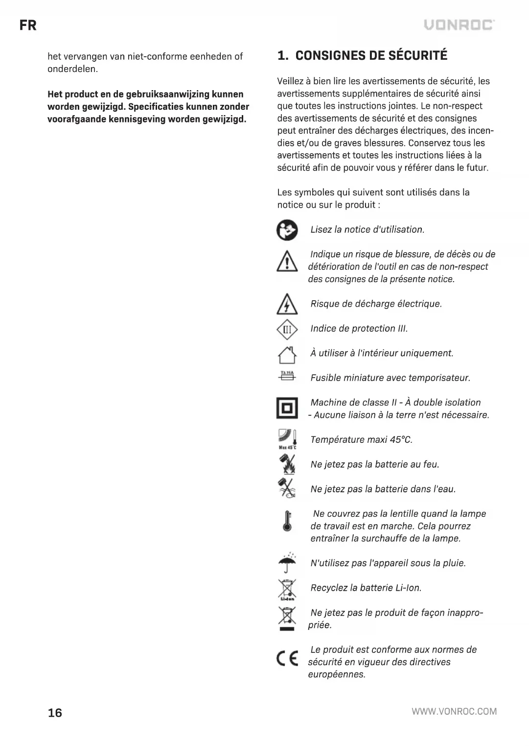 Nettoyage Nettoyez régulièrement l'extérieur de la machine àl'aide d'un chiffon doux et de préférence après chaque utilisation. Supprimez les taches tenaces àl'aide d'un chiffon doux légèrement humide et d'une solution savonneuse. N'utilisez aucun solvant comme de l'essence, de l'alcool, de l'ammoniaque, etc. car ces produits chimiques peuvent endommager les composants synthétiques de la lampe de travail. ENVIRONNEMENT Les appareils électriques et électroniques défectueux ou en fin de vie doivent être rapportés dans des sites de recyclage appropriés. Pour les pays de la Communauté Européenne uniquement Ne jetez pas les outils électriques avec les déchets ménagers. Conformément àla Directive Européenne 2012/19/UE relative àl'élimination des déchets élec- triques et électroniques et àsa transposition dans la législation nationale, les outils électriques usagés doivent être collectés séparément et être jetés de façon écologique. GARANTIE Les produits VONROC sont développés avec les normes de qualité les plus hautes et ils sont garantis pour être exempts de défaut de pièces et de main d'œuvre pour la durée stipulée par la loi et àcompter de la date d'achat initiale. Si, au cours de cette période, le produit devait rencontrer une quelconque panne due àun défaut de pièce ou de main d'œuvre, contactez VONROC directement. Les conditions suivantes sont exclues de la garantie :