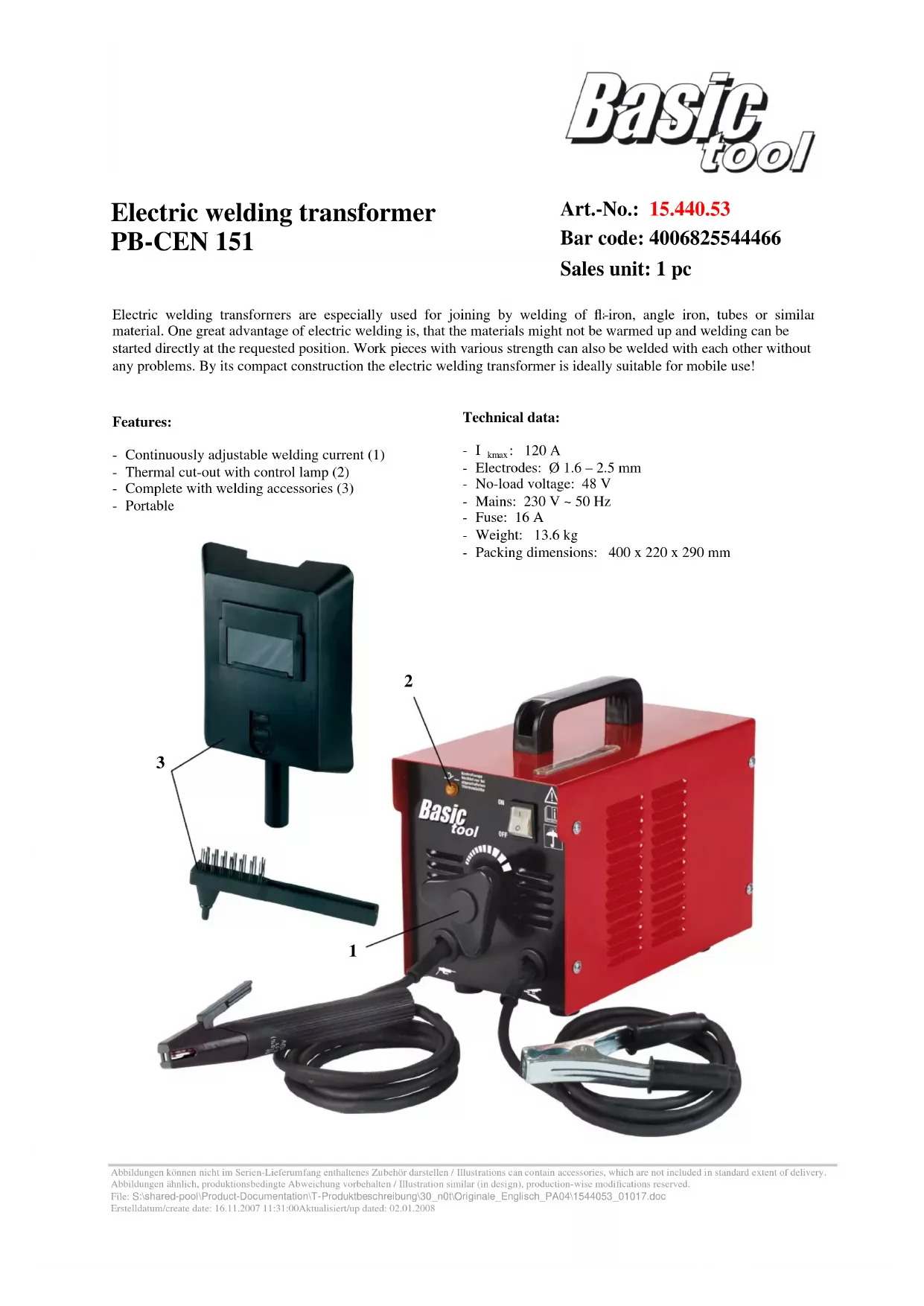 | Caractéristiques techniques | Poste à souder Basic tool PB-CEN 151, technologie MIG/MAG, puissance réglable, tension d'entrée 230V. |