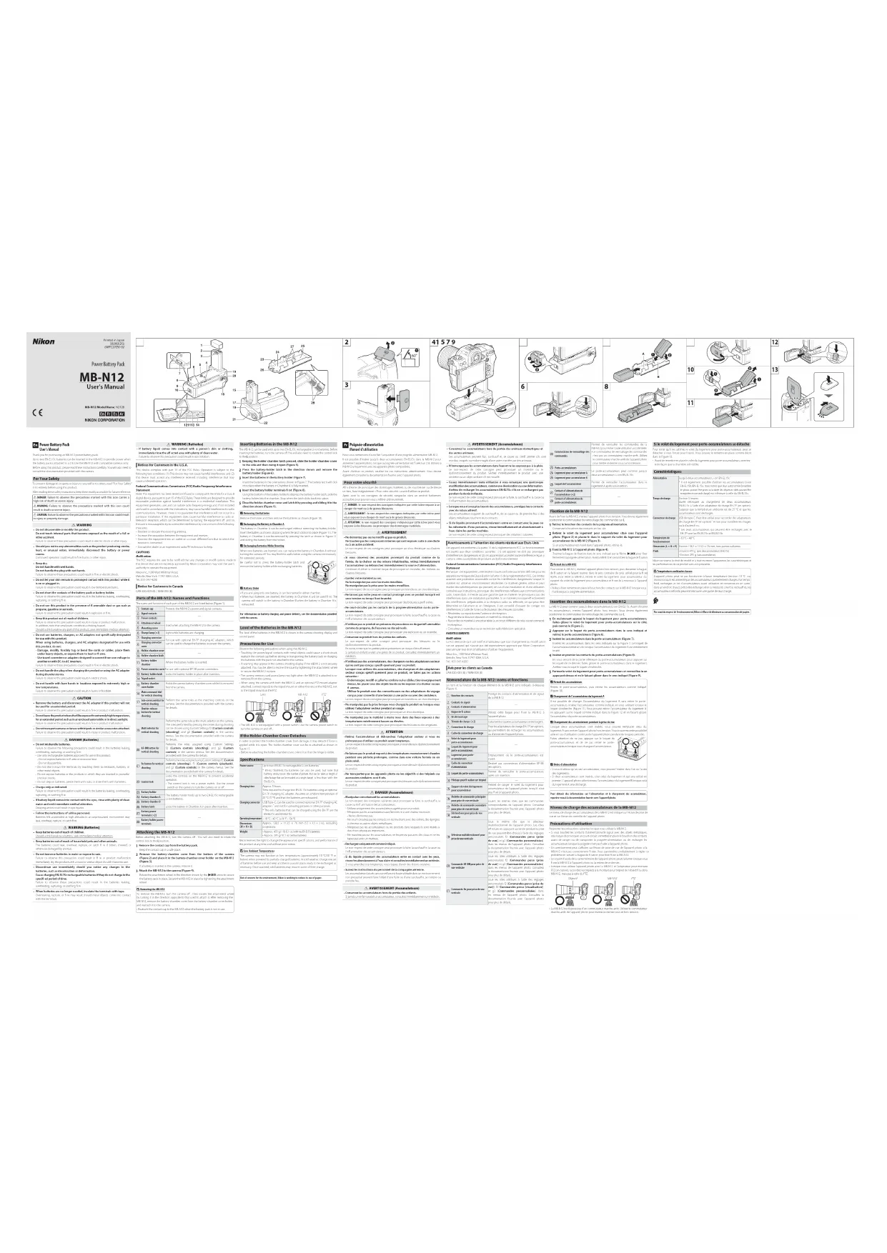 - Approx. 295g/10.5oz (without batteries)Nikon reserves the right to change the appearance, specifi cations, and performance of this product at any time and without prior notice.D Low Ambient Temperatures The camera may not function at low temperatures (approximately 10°C/50 °F or below) when powered by partially-charged batteries. In cold weather, charge one set of batteries before use and keep another in a warm place, ready to be exchanged as necessary. Once warmed, cold batteries may recover some of their charge.Out of concern for the environment, Nikon is working to reduce its use of paper. Poignée-alimentationManuel d’utilisationNous vous remercions d’avoir fait l’acquisition d’une poignée-alimentation MB-N12.Il est possible d’insérer jusqu’à deux accumulateurs EN-EL15c dans la MB-N12 pour alimenter l’appareil photo, lorsque la poignée-alimentation est fi xée à un Z8. Utilisez la MB-N12 uniquement avec les appareils photo compatibles.Avant d’utiliser ce produit, veuillez lire ces instructions attentivement. Vous devrez également consulter la documentation fournie avec l’appareil photo. Pour votre sécurité Pour votre sécuritéAfi n d’éviter de provoquer des dommages matériels ou de vous blesser ou de blesser un tiers, lisez intégralement «Pour votre sécurité» avant d’utiliser ce produit.Après avoir lu ces consignes de sécurité, rangez-les dans un endroit facilement accessible pour pouvoir vous y référer ultérieurement. A DANGER: le non-respect des consignes indiquées par cette icône expose à un danger de mort ou à de graves blessures. A AVERTISSEMENT: le non-respect des consignes indiquées par cette icône peut vous exposer à un danger de mort ou à de graves blessures. A ATTENTION: le non-respect des consignes indiquées par cette icône peut vous exposer à des blessures ou provoquer des dommages matériels.