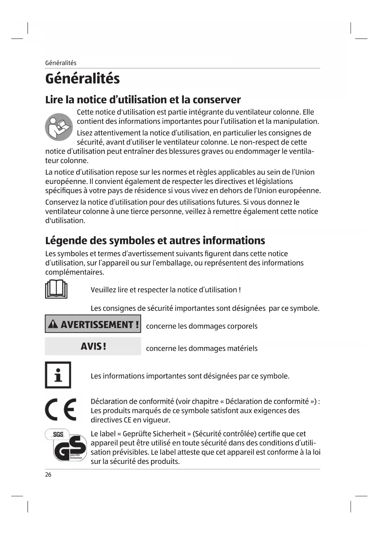 - Élimination de l’appareil Généralités Généralités Lire la notice d’utilisation et la conserver Cette notice d'utilisation est partie intégrante du ventilateur colonne. Elle contient des informations importantes pour l’utilisation et la manipulation. Lisez attentivement la notice d’utilisation, en particulier les consignes de sécurité, avant d’utiliser le ventilateur colonne. Le non-respect de cette notice d’utilisation peut entraîner des blessures graves ou endommager le ventila- teur colonne. La notice d’utilisation repose sur les normes et règles applicables au sein de l’Union européenne. Il convient également de respecter les directives et législations spécifiques à votre pays de résidence si vous vivez en dehors de l’Union européenne. Conservez la notice d’utilisation pour des utilisations futures. Si vous donnez le ventilateur colonne à une tierce personne, veillez à remettre également cette notice d'utilisation. Légende des symboles et autresinformations Les symboles et termes d’avertissement suivants figurent dans cette notice d’utilisation, sur l’appareil ou sur l’emballage, ou représentent des informations complémentaires. Veuillez lire et respecter la notice d’utilisation! Les consignes de sécurité importantes sont désignées par ce symbole. AVERTISSEMENT! concerne les dommages corporels AVIS ! concerne les dommages matériels Les informations importantes sont désignées par cesymbole. Déclaration de conformité (voir chapitre «Déclaration de conformité»): Les produits marqués de ce symbole satisfont aux exigences des directives CE en vigueur. Le label «Geprüfte Sicherheit» (Sécurité contrôlée) certifie que cet appareil peut être utilisé en toute sécurité dans des conditions d’utili- sation prévisibles. Le label atteste que cet appareil est conforme à la loi sur la sécurité des produits.27 Généralités / Sécurité Sécurité Utilisation conforme à l’usageprévu L'appareil est exclusivement destiné à la ventilation dans des pièces sèches et fermées et uniquement dans le cadre d'un usage domestique. De plus, l’appareil n’est pas destiné à une utilisation professionnelle mais uniquement à une utilisation privée. Toute autre utilisation ou modification de l’appareil n’est pas conforme et est strictement interdite. Nous ne pou- vons être tenus responsables des dommages survenus à la suite d’une utilisation non conforme ou incorrecte. Ce symbole indique des appareils électriques qui correspondent à la classe de protection II. Ce symbole fait référence aux prescriptions spéciales en matière d’élimination des appareils usagés (voir le chapitre « Élimination »).28 Consignes de sécurité AVERTISSEMENT ! Veuillez lire et respecter les consignes de sécurité énoncées ci-après. Le non-respect de ces consignes peut engendrer des risques d’accident et de blessures, ainsi que des dommages matériels ou des dysfonctionnements de l’appareil. Risques pour les enfants et lespersonnes dont les facultés sont limitées - Les enfants âgés de plus de 8ans et les personnes dont les facultés physiques, sensorielles ou mentales sont limitées ou les personnes manquant d’expérience et/ou de connaissances sont autorisés à utiliser cet appareil, à condition qu’ils soient surveillés ou qu’ils aient été instruits quant à son usage sûr et qu’ils aient compris les dangers en résultant. - Le nettoyage et l’entretien de l’appareil ne doivent pas être effectués par des enfants de moins de 8ans. Passé cet âge, les enfants peuvent réaliser ces opérations s’ils sont surveillés. Les enfants de moins de 8ans doivent être tenus à distance de l’appareil et du cordon. - Les enfants ne doivent pas jouer avec l’appareil. Les en- fants ne sont pas conscients du danger inhérent à l’utili- sation d’appareils électriques. Par conséquent, utilisez et conservez l’appareil hors de portée des enfants de moins de 8ans. Ne laissez pas pendre le cordon électrique afin d’éviter que quelqu’un ne tire dessus. - Conservez l’emballage hors de portée des enfants – Risque d’asphyxie! Sécurité29 Sécurité Risques liés à l’utilisation d’appareils électriques - Branchez l’appareil uniquement sur une prise secteur avec terre, installée de manière conforme et dont la tension de secteur respecte la plaque signalétique. - Si le cordon électrique est endommagé, seul un atelier spé- cialisé désigné par le constructeur est autorisé à le rempla- cer afin d’éviter tout risque de blessure, d’accident ou de dégâts à l’appareil. - Veillez à ce que la prise secteur se trouve à proximité de l’ap- pareil et soit facilement accessible de façon à ce que l’appa- reil puisse être rapidement débranché en cas d’accident. - Seuls des ateliers spécialisés et habilités sont autorisés à effectuer les réparations. Les appareils réparés par un per- sonnel non spécialisé représentent un danger pour l’utilisa- teur. - Ne laissez pas l’appareil sans surveillance pendant qu’il fonc- tionne afin d’éviter tout accident. - Afin d’éviter tout accident, n’utilisez jamais la même prise secteur avec terre pour brancher simultanément plusieurs appareils ménagers (par exemple sur une triplite). - Ne plongez jamais l’appareil dans l’eau et ne l’utilisez pas en plein air, car ce dernier ne doit en aucun cas être exposé à la pluie ou à l’humidité – Risque d’électrocution! - Si l’appareil venait à tomber dans l’eau, débranchez d’abord la prise avant de le sortir de l’eau! Ne remettez pas l’appareil en service avant de l’avoir fait contrôler par un SAV agréé. Ceci vaut également lorsque le câble d’alimentation ou l’appareil est endommagé ou si l’appareil est tombé. Risque d’électrocution! - Débranchez toujours la prise lorsque l’appareil n’est pas utilisé, avant le net
