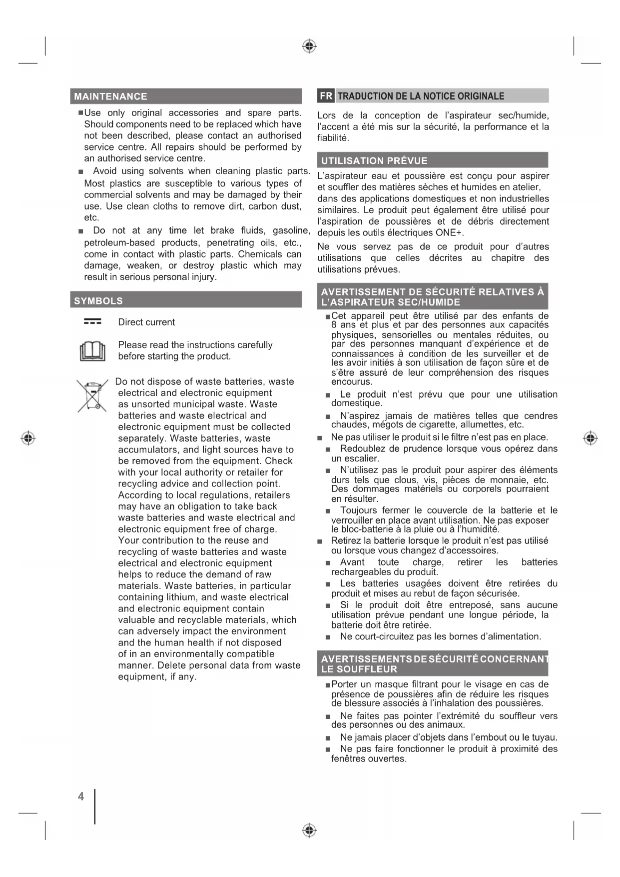 L’aspirateur eau et poussière est conçu pour aspirer HWVRXႉHUGHVPDWLqUHVVqFKHVHWKXPLGHVHQDWHOLHU dans des applications domestiques et non industrielles similaires. Le produit peut également être utilisé pour l’aspiration de poussières et de débris directement depuis les outils électriques ONE+. Ne vous servez pas de ce produit pour d’autres utilisations que celles décrites au chapitre des utilisations prévues.