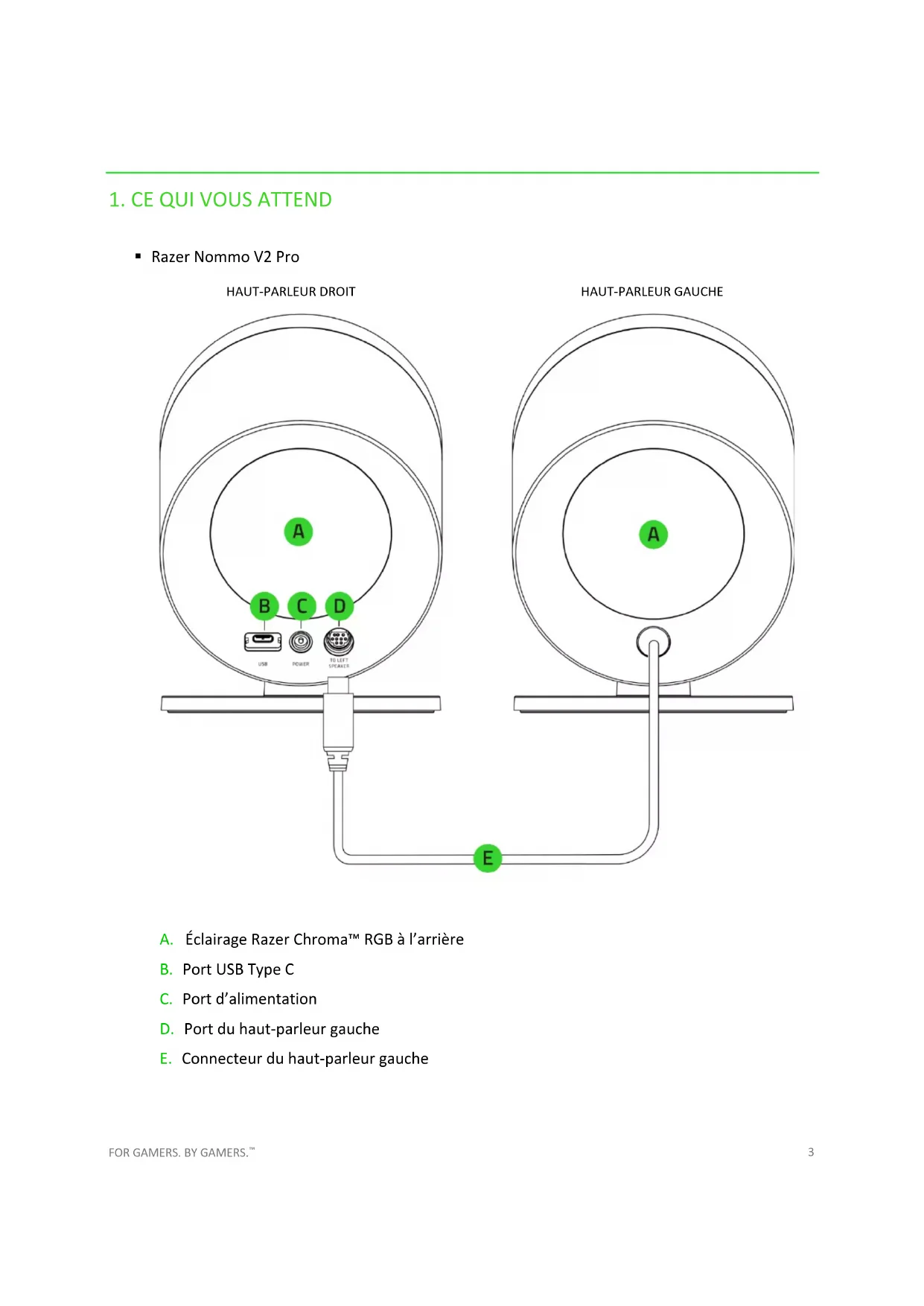A. Éclairage Razer Chroma™ RGB à l’arrière B. Port USB Type C C. Port d’alimentation D. Port du haut-parleur gauche E. Connecteur du haut-parleur gauche HAUT-PARLEUR GAUCHE HAUT-PARLEUR DROITFOR GAMERS. BY GAMERS.