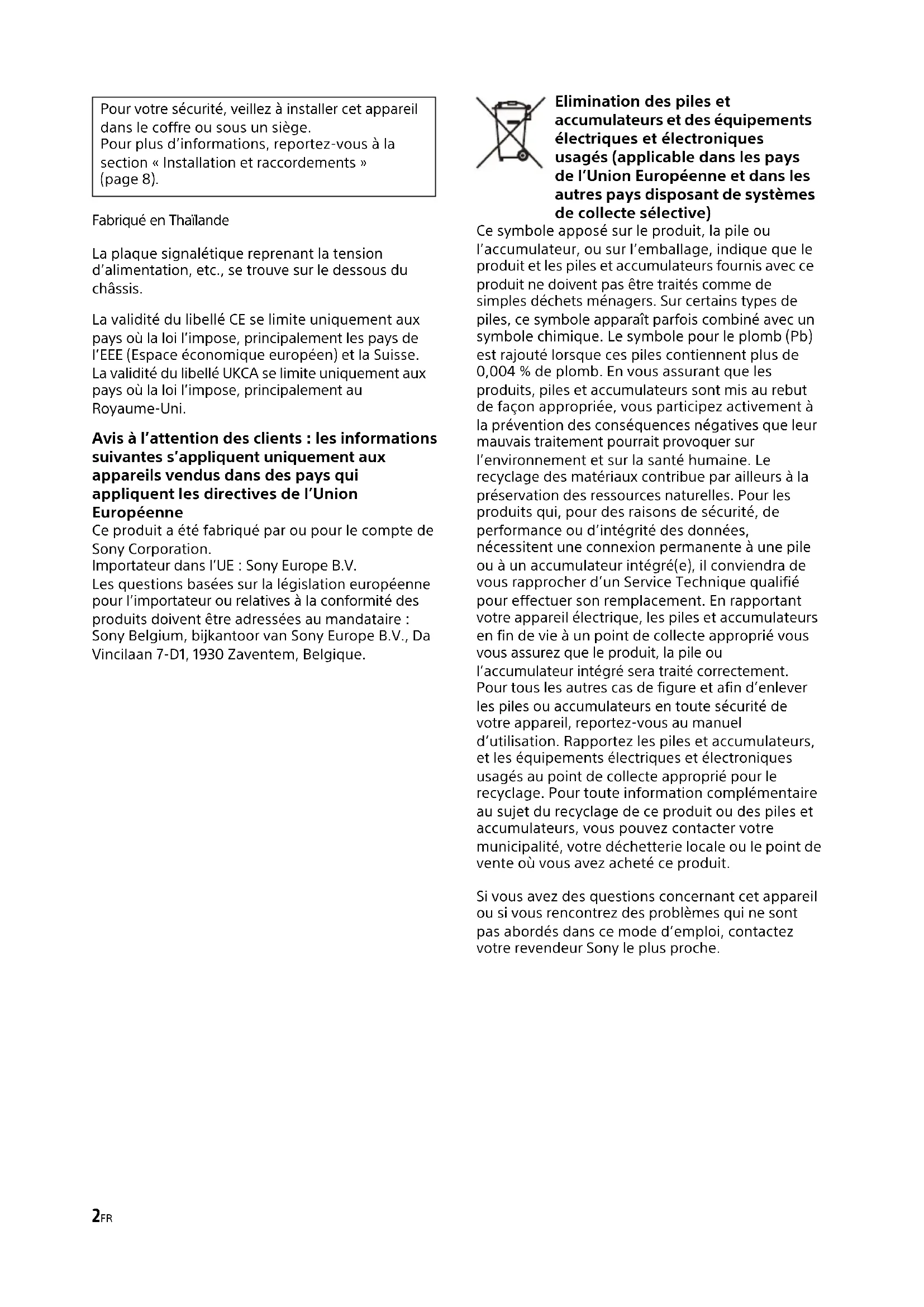 絕勿使用額定安培數超過放大器隨附保險絲的保險 絲,否則可能會損壞放大器。2FR Fabriqué en Thaïlande La plaque signalétique reprenant la tension d’alimentation, etc., se trouve sur le dessous du châssis. La validité du libellé CE se limite uniquement aux pays où la loi l’impose, principalement les pays de l’EEE (Espace économique européen) et la Suisse. La validité du libellé UKCA se limite uniquement aux pays où la loi l’impose, principalement au Royaume-Uni. Avis à l’attention des clients : les informations suivantes s’appliquent uniquement aux appareils vendus dans des pays qui appliquent les directives de l’Union Européenne Ce produit a été fabriqué par ou pour le compte de Sony Corporation. Importateur dans l’UE : Sony Europe B.V. Les questions basées sur la législation européenne pour l’importateur ou relatives à la conformité des produits doivent être adressées au mandataire : Sony Belgium, bijkantoor van Sony Europe B.V., Da Vincilaan 7-D1, 1930 Zaventem, Belgique. Elimination des piles et accumulateurs et des équipements électriques et électroniques usagés (applicable dans les pays de l’Union Européenne et dans les autres pays disposant de systèmes de collecte sélective) Ce symbole apposé sur le produit, la pile ou l’accumulateur, ou sur l’emballage, indique que le produit et les piles et accumulateurs fournis avec ce produit ne doivent pas être traités comme de simples déchets ménagers. Sur certains types de piles, ce symbole apparaît parfois combiné avec un symbole chimique. Le symbole pour le plomb (Pb) est rajouté lorsque ces piles contiennent plus de 0,004 % de plomb. En vous assurant que les produits, piles et accumulateurs sont mis au rebut de façon appropriée, vous participez activement à la prévention des conséquences négatives que leur mauvais traitement pourrait provoquer sur l’environnement et sur la santé humaine. Le recyclage des matériaux contribue par ailleurs à la préservation des ressources naturelles. Pour les produits qui, pour des raisons de sécurité, de performance ou d’intégrité des données, nécessitent une connexion permanente à une pile ou à un accumulateur intégré(e), il conviendra de vous rapprocher d’un Service Technique qualifié pour effectuer son remplacement. En rapportant votre appareil électrique, les piles et accumulateurs en fin de vie à un point de collecte approprié vous vous assurez que le produit, la pile ou l’accumulateur intégré sera traité correctement. Pour tous les autres cas de figure et afin d’enlever les piles ou accumulateurs en toute sécurité de votre appareil, reportez-vous au manuel d’utilisation. Rapportez les piles et accumulateurs, et les équipements électriques et électroniques usagés au point de collecte approprié pour le recyclage. Pour toute information complémentaire au sujet du recyclage de ce produit ou des piles et accumulateurs, vous pouvez contacter votre municipalité, votre déchetterie locale ou le point de vente où vous avez acheté ce produit. Si vous avez des questions concernant cet appareil ou si vous rencontrez des problèmes qui ne sont pas abordés dans ce mode d’emploi, contactez votre revendeur Sony le plus proche. Pour votre sécurité, veillez à installer cet appareil dans le coffre ou sous un siège. Pour plus d’informations, reportez-vous à la section « Installation et raccordements » (page 8).3FR Caractéristiques
