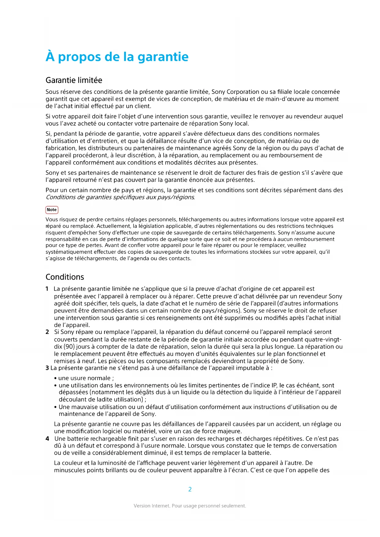 ersion Internet. Pour usage personnel seulement.risquent d’empêcher Sony d ’eectuer une copie de sauvegarde de certains téléchargements. Sony n’assume aucune responsabilité en cas de perte d’informations de quelque sorte que ce soit et ne procédera à aucun remboursement pour ce type de pertes. Avant de coner votre appareil pour le faire réparer ou remplacer, veuillez systématiquement eectuer des copies de sauvegarde de toutes les informations stockées sur votre appareil, qu’il s’agisse de téléchargements, du calendrier ou des contacts. Garantie limitée pour Taïwan Sous réserve des conditions de la présente garantie limitée, Sony Corporation ou sa liale locale concernée garantit que cet appareil est exempt de vices de conception, de matériau et de main-d’œuvre au moment de l’achat initial eectué par un client, et ce, pour une durée d’un (1) an à partir de la date d’achat. Tous les accessoires d’origine livrés avec l’appareil sont garantis pour une période de six (6) mois à compter de la date d’achat. Si, pendant la période de garantie, cet appareil s’avère défectueux dans des conditions normales d’utilisation et d’entretien, et que la défaillance résulte d’un vice de conception, de matériau ou de fabrication, les distributeurs ou partenaires de maintenance agréés Sony de la région ou du pays d’achat de l’appareil produit procéderont, à leur discrétion, à la réparation, au remplacement ou au remboursement de l’appareil conformément aux conditions et modalités stipulées aux présentes. Note Vous risquez de perdre certains réglages personnels, téléchargements ou autres informations lorsque votre appareil est