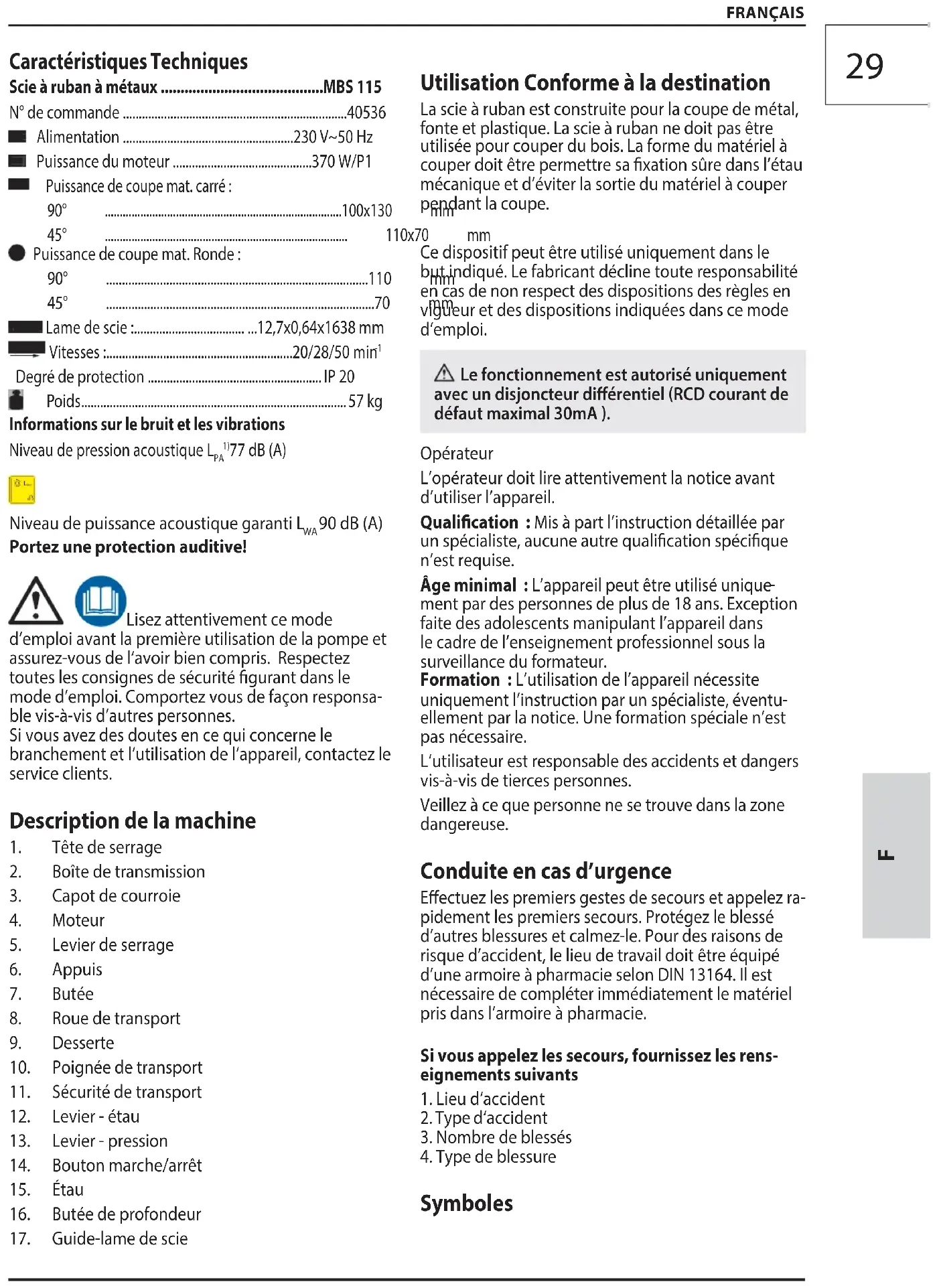 respondantes. Les réparations doivent être conées uniquement à un électricien utilisant uniquement des pièces détachées d’origine, faute de quoi l’utilisateur s’expose à des risques d’accident. Les personnes et les enfants ignorant le fonctionne- ment de l’appareil ainsi que le personnes avec capa- cités physiques, sensorielles et psychiques limitées ne doivent pas utiliser l ’appareil. Consignes de sécurité complémentaires. Scie à ruban à métaux Utilisez toujours la bonne lame. Avant d’insérer la matière à couper dans l’étau ou avant de le retirer, arrêtez la machine. Éloignez susamment les doigts et les mains de la lame de scie en marche. Il est interdit de freiner la lame de scie à la main. Il est interdit de retirer le dispositif de sécurité et les capots de Protection. Ne retirez jamais les scories à la main, utilisez une brosse. Ne quittez jamais la machine en marche. Mise en marche pour votre securite Avant de procéder à n‘importe quelle interven