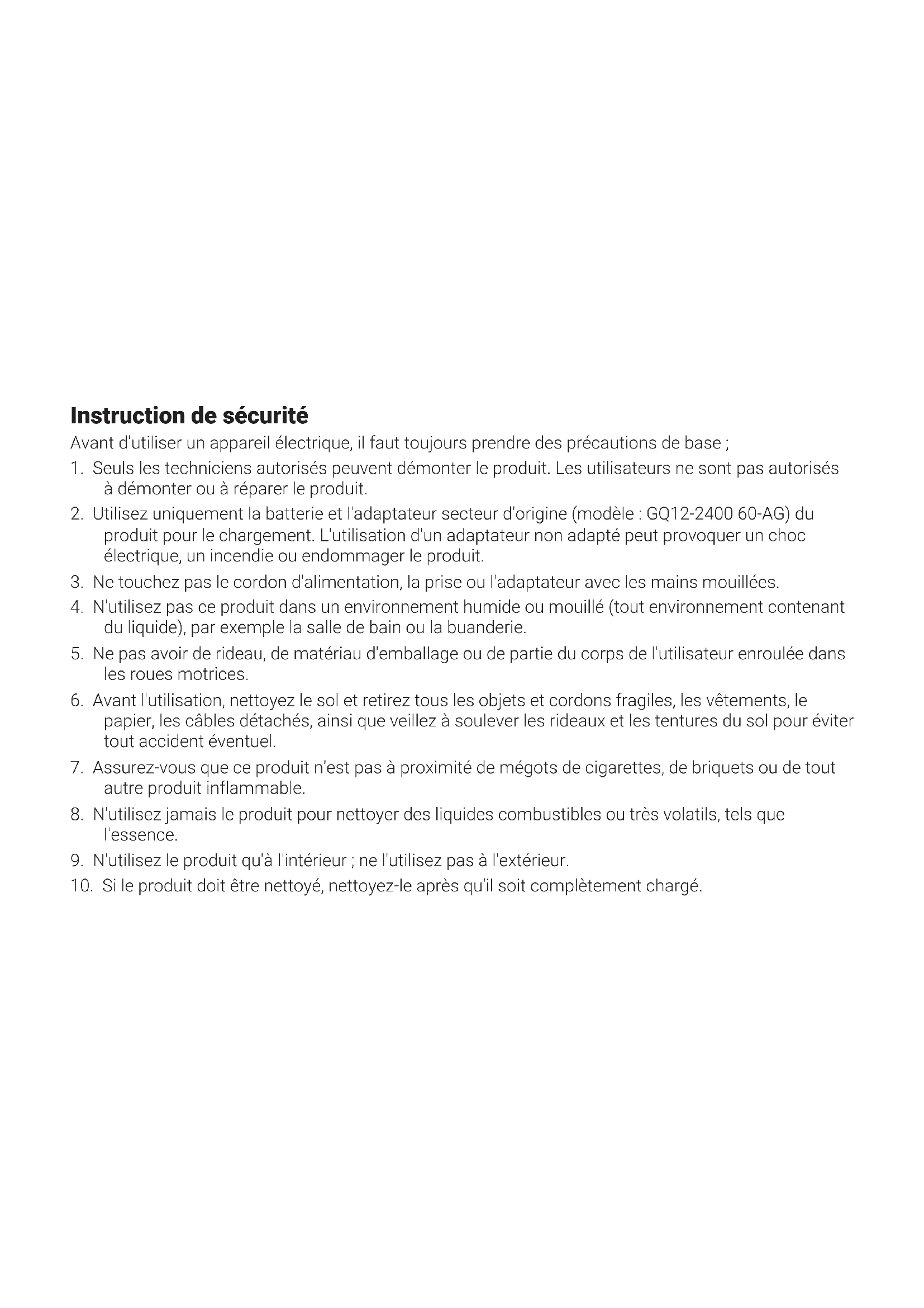 - Pour recharger la batterie, utilisez uniquement le bloc d'alimentation amovible fourni avec l'appareil. Veuillez éviter l'opération ci-dessousTABLE DE MATIÈRES Composantes du produit 51 Corps principal et accessoires 51 Schéma du corps principal 52 Poubelle & brosse roulante & station de chargementı 53 Fonctionnement du produit 54 APP Connexion 54 Robot Standby 54 Commencer le nettoyage 54 Arrêter le nettoyage 55 Auto-chargement 55 Fonctionnement de l'établissement du calendrier 56 Indication LED 56 Rechargement des batteries 57 Modes de nettoyage 58 Installation des composants 59 Maintenance des produits 60 Nettoyage des brosses latérales 60 Nettoyage de la poubelle et des filtres 60 Nettoyage des capteurs & des poteaux de charge & brosse roulante 61 How to assemble 2-in-one Water Tank 62 Comment assembler un réservoir d'eau 2 en 1 63 Dépannage 64 Spécifications des produits 65 Retrait des batteries 6649 Composante du produit Corps principal et accessoires Objet Description Quantité 1 Corps principal 1 2 Charger l'amarrage 1 3 Adaptateur d'alimentation 1 4 Réservoir d'eau électronique 2 en 1 1 5 Brosse latérale 4 6 Chiffon de nettoyage 2 7 HEPA 1 8 Brosse propre 1 9 Manuel 1 10 Télécommande 150 Composante du produit Schéma du corps principal Pare-chocs Plaque de couverture à brosse roulante Brosse roulante Brosse latérale gauche Roue avant Brosse latérale droite Couvercle de la batterie Roue droite Prise de charge Poubelle Pôle de chargementautomatique Bouton marche/arrêt Bouton Wi-Fi LDS Capteur de suivi des murs Interrupteur d'alimentation Roue gauche Couverture du bas51 Composante du produit Poubelle et brosse roulante et station de chargement Indicateur de puissance Charger les pôles Poubelle Kit brosse à rouler Chargement de l'accostage Tablette de filtre HEPAFiltre HEPAFermeture des poubellesAxe d'insertion des brosses roulantesBrosses roulantes BPaliers à huileBrossage des axesFermeture à ressortPoubelle à l'intérieurdu ClapboardBouton de pression de la poubelle à ressortPlaque de couvertureà brosse roulanteBrosses roulantes A Bâton de brosse roulante Cadre à brosse roulante Moteur de la brosse roulante Bouton de pression de la poubelle Couvercle du fond de la poubelleCouvercle de la poubelle52 Fonctionnement du produit