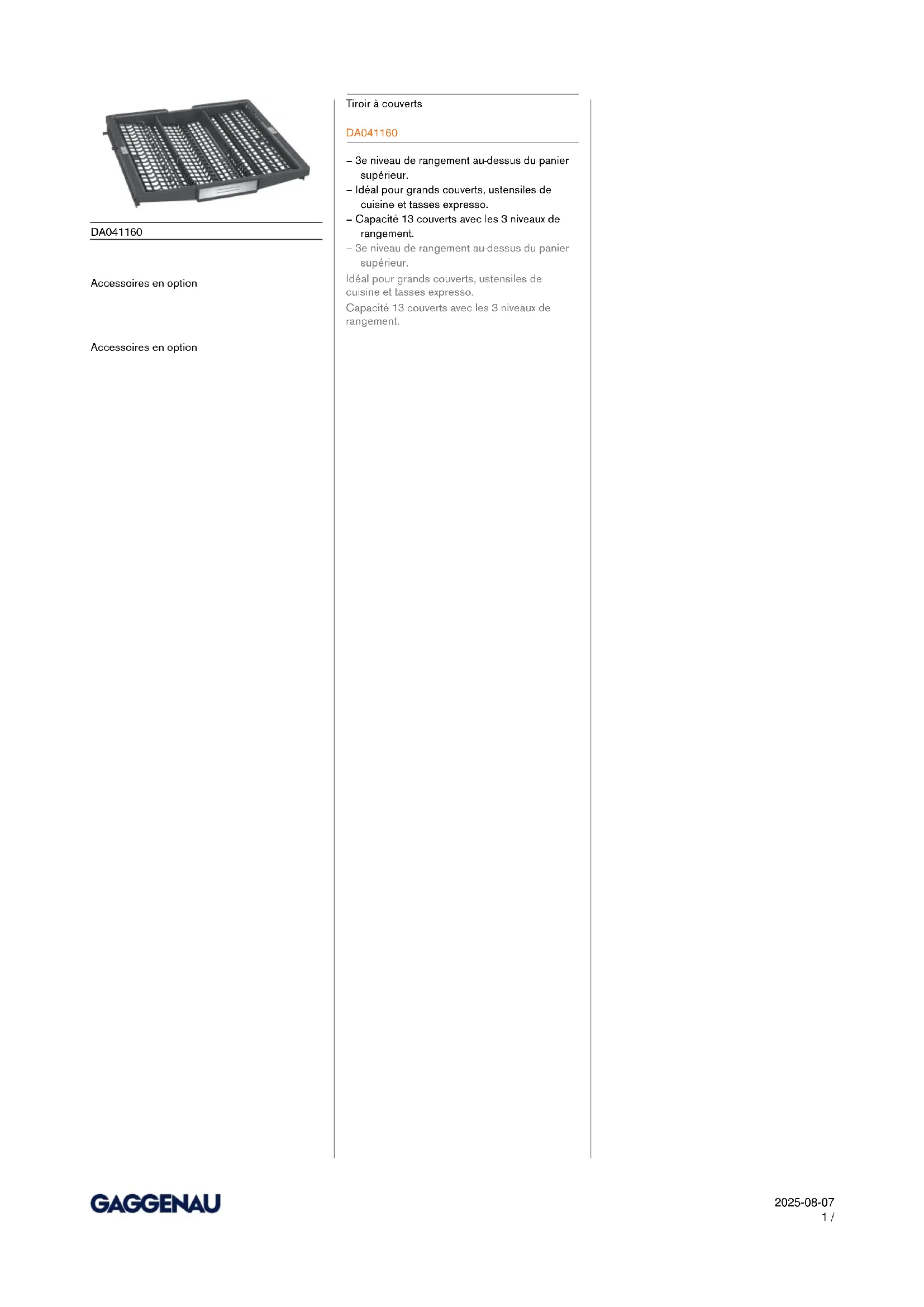 DA041160 Accessoires en option Accessoires en option Tiroir à couverts DA041160 – 3e niveau de rangement au-dessus du panier supérieur. – Idéal pour grands couverts, ustensiles de cuisine et tasses expresso. – Capacité 13 couverts avec les 3 niveaux de rangement. – 3e niveau de rangement au-dessus du panier supérieur. Idéal pour grands couverts, ustensiles de cuisine et tasses expresso. Capacité 13 couverts avec les 3 niveaux de rangement. 2025-08-07 1 /DA041160 2025-08-07 2 /