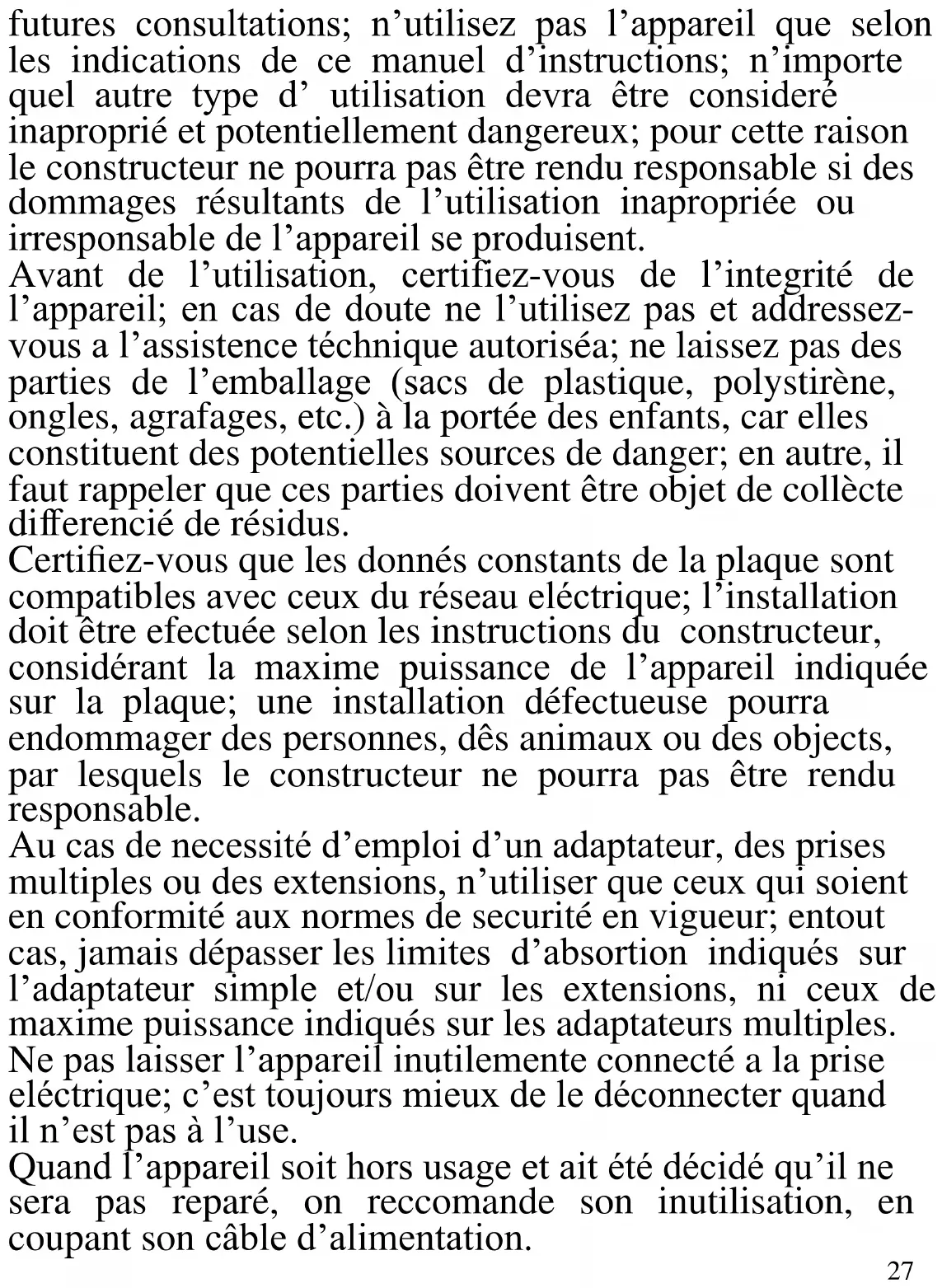 FRANCAIS: AVERTISSEMENT Les indications suivantes sont très importantes en ce qui concerne l’installation, usage et manutention de cet appareil; gardez soigneusement ce manuel pour des27 futures consultations; n’utilisez pas l’appareil que selon les indications de ce manuel d’instructions; n’importe quel autre type d’ utilisation devra être consideré inaproprié et potentiellement dangereux; pour cette raison le constructeur ne pourra pas être rendu responsable si des dommages résultants de l’utilisation inapropriée ou irresponsable de l’appareil se produisent. Avant de l’utilisation, certifiez-vous de l’integrité de l’appareil; en cas de doute ne l’utilisez pas et addressez- vous a l’assistence téchnique autoriséa; ne laissez pas des parties de l’emballage (sacs de plastique, polystirène, ongles, agrafages, etc.) à la portée des enfants, car elles constituent des potentielles sources de danger; en autre, il faut rappeler que ces parties doivent être objet de collècte differencié de résidus. Certifiez-vous que les donnés constants de la plaque sont compatibles avec ceux du réseau eléctrique; l’installation doit être efectuée selon les instructions du constructeur, considérant la maxime puissance de l’appareil indiquée sur la plaque; une installation défectueuse pourra endommager des personnes, dês animaux ou des objects, par lesquels le constructeur ne pourra pas être rendu responsable. Au cas de necessité d’emploi d’un adaptateur, des prises multiples ou des extensions, n’utiliser que ceux qui soient en conformité aux normes de securité en vigueur; entout cas, jamais dépasser les limites d’absortion indiqués sur l’adaptateur simple et/ou sur les extensions, ni ceux de maxime puissance indiqués sur les adaptateurs multiples. Ne pas laisser l’appareil inutilemente connecté a la prise eléctrique; c’est toujours mieux de le déconnecter quand il n’est pas à l’use. Quand l’appareil soit hors usage et ait été décidé qu’il ne sera pas reparé, on reccomande son inutilisation, en coupant son câble d’alimentation.28 Débranchez toujours l'appareil de l'alimentation électrique s'il est laissé sans surveillance et avant de l'assembler et de le désassembler. Pour le nettoyage déconnectez la fiche du secteur électrique. - Ne pas utiliser l’appareil si le câble d’alimentation ou la fiche de connéction eléctrique sont endommagés, ou encore en cas de court-circuits; dans ce cas là, apporter l’appareil a un centre d’assistence autorisé. - Ne pas approcher le câble d’alimentation d’objects coupants ou de surfaces chaudes, et ne pas tirer sur le cordon d’alimentation pour le débrancher de la prise. Ne le laissez pas pendre du plan de travail où un enfant pourrait le tenir. - L’appareil n’est pas indiqué pour être exposé à des conditions météorologiques défavorables (pluie, vent, humidité, la glace, etc.); Gardez-le dans un endroit sec. Jamais opérer ou même toucher l’appareil avec les mains mouillées ou les pieds nus. - Cet appareil peut être utilisé par des enfants agés de plus de 8 ans et par des personnes avec une réduite capacité phisique, sensorial ou mental, ou encore avec peu d’expérience à son usage, pourvu qu’une supervision adéquate leur en soit assuré, ou s’ils auraient été instruits à l’usage de l’appareil en complete securité. Les opérations de nettoyage e de manutention ne oivent pás être efectués par des enfants, sauf pour ceux qui sont agés de plus de 8 ans et sont supervisionés. - Les enfants ne doivent pas jouer avec cet appareil. - Gardez l’appareil et le câble d’alimentation hors la portée des enfants agés de moins de 8 ans. - Cet appareil peut être utilisé par des personnes ayant des capacités physiques, sensorielles ou mentales réduites, ou qui manquent d'expérience ou de connaissances, si elles ont été correctement supervisées ou ont reçu des instructions pour utiliser cet appareil en toute sécurité.29 - L’appareil est pour l’usage domestique et intérieur. Au cas de panne et/ou de mauvais fonctionnement, ne pas intervenir sur l’ appareil. Pour une éventuel réparation s’addresser uniquement a un centre autorisé par le constructeur, en demandant dês pièces de remplacement originaux. Le non respect de ces indications peut compromettre la securité de l’appareil e rendre invalides les termes de la garantie. - Cet appareil est destiné à être utilisé dans les ménages et des applications similaires: les cuisines du personnel dans les magasins, bureaux et autres environnements de travail, pour les clients dans les hôtels, motels et autres environnements de type résidentiel, de type lit et petit- déjeuner, hébergement. - L’appareil n’est pas conçu pour être utilisé avec une minuterie extérieure ou une commande à distance. - N’utiliser que des accéssoires e pièces d’origine. - Avant chaque utilisation, effectuez le cordon d'alimentation. Ne soumettez pas le produit à des chocs susceptibles de l'endommager. - Ne pas utiliser sous ou près des matériaux inflammables comme des rideaux, sources de chaleur, endroits froids et vapeur. -Placer toujours les aliments à cuir dans le récipient afin d’éviter qu’ils touchent la partie chauffante. -Ne pas couvrir les ouvertures de ventilation quand l’appareil est en fonction. -Ne pas remplir le récipient avec de l’huile : risque d’incendie. Ne pas toucher la partie intérieure de l’appareil quand il est en fonction.