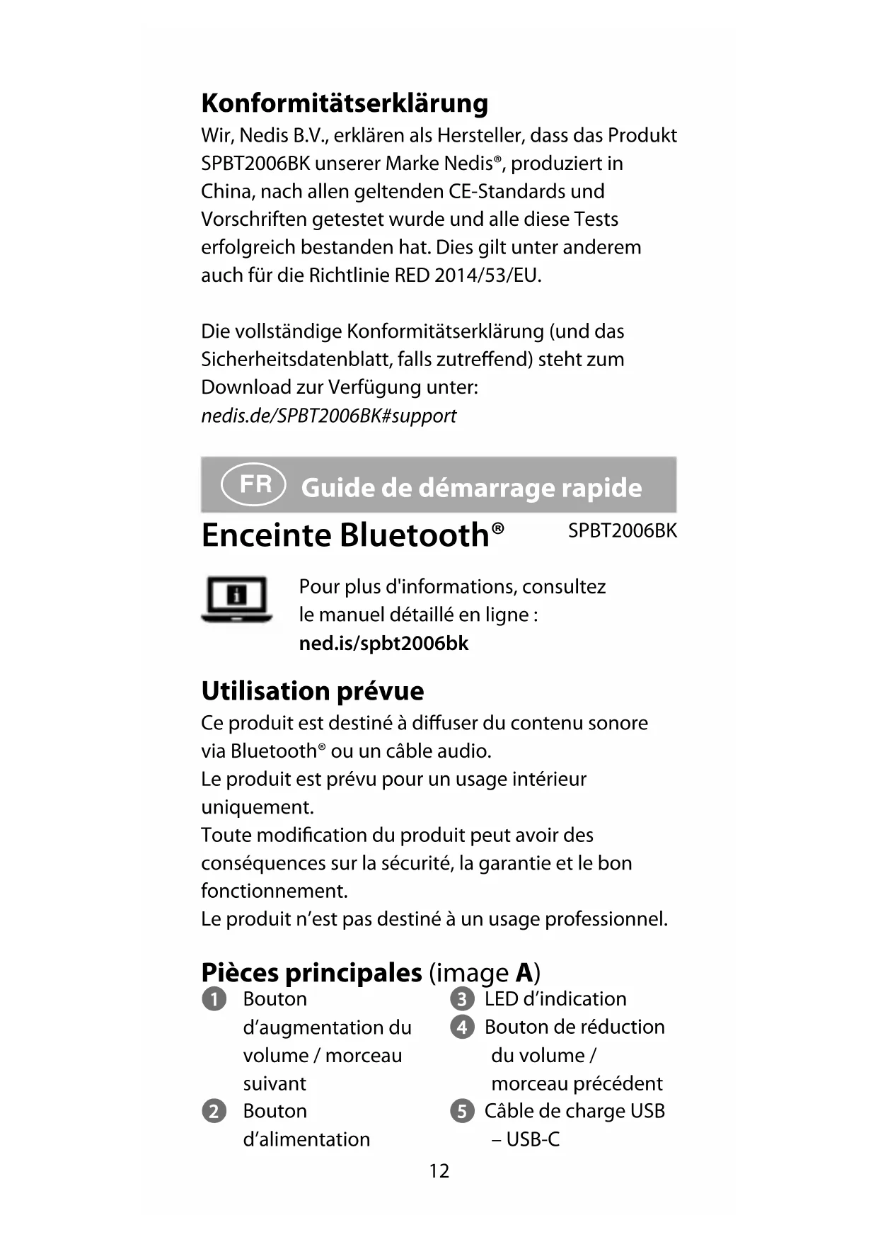 Guide de démarrage rapide Enceinte Bluetooth® SPBT2006BK Pour plus d'informations, consultez le manuel détaillé en ligne : ned.is/spbt2006bk Utilisation prévue Ce produit est destiné à diuser du contenu sonore via Bluetooth® ou un câble audio. Le produit est prévu pour un usage intérieur uniquement. Toute modication du produit peut avoir des conséquences sur la sécurité, la garantie et le bon fonctionnement. Le produit n’est pas destiné à un usage professionnel. Pièces principales (image A) 1 Bouton d’augmentation du volume / morceau suivant 2 Bouton d’alimentation 3 LED d’indication 4 Bouton de réduction du volume / morceau précédent 5 Câble de charge USB – USB-C13 6 Microphone 7 Port AUX 8 Port de charge USB-C Consignes de sécurité