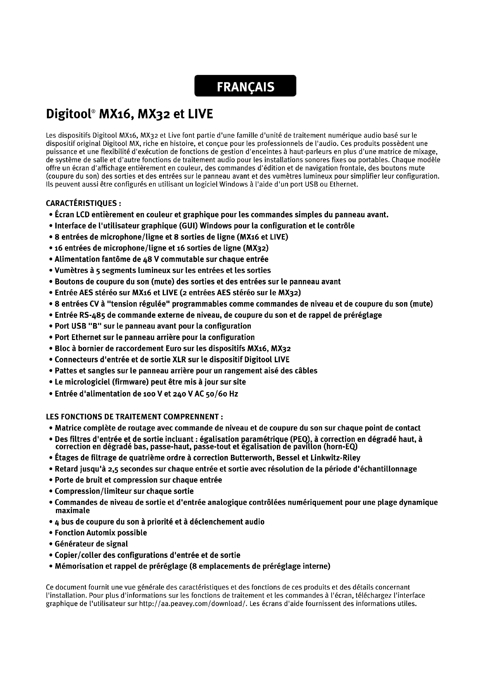 MX16, MX32 et LIVE Les dispositifs Digitool MX16, MX32 et Live font partie d'une famille d'unité de traitement numérique audio basé sur le dispositif original Digitool MX, riche en histoire, et conçue pour les professionnels de l'audio. Ces produits possèdent une puissance et une flexibilité d'exécution de fonctions de gestion d'enceintes à haut-parleurs en plus d'une matrice de mixage, de système de salle et d'autre fonctions de traitement audio pour les installations sonores fixes ou portables. Chaque modèle offre un écran d'affichage entièrement en couleur, des commandes d'édition et de navigation frontale, des boutons mute (coupure du son) des sorties et des entrées sur le panneau avant et des vumètres lumineux pour simplifier leur configuration. Ils peuvent aussi être configurés en utilisant un logiciel Windows à l'aide d'un port USB ou Ethernet. CARACTÉRISTIQUES :