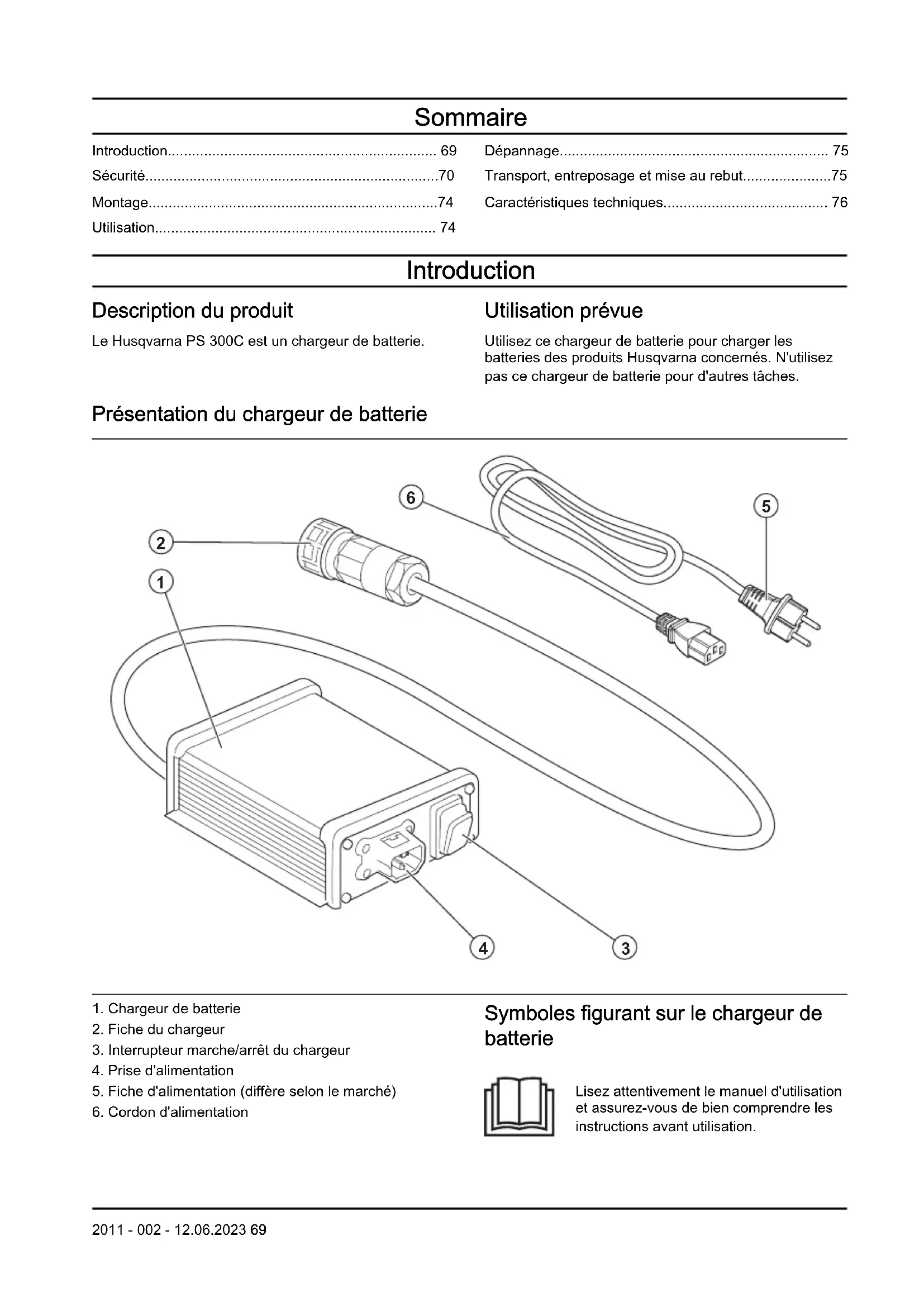 - Caractéristiques techniques Introduction Description du produit Le Husqvarna PS 300C est un chargeur de batterie. Utilisation prévue Utilisez ce chargeur de batterie pour charger les batteries des produits Husqvarna concernés. N'utilisez pas ce chargeur de batterie pour d'autres tâches. Présentation du chargeur de batterie p. 76