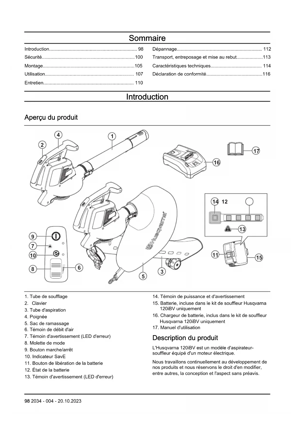 Description du produit L'Husqvarna 120iBV est un modèle d'aspirateur- souffleur équipé d'un moteur électrique. Nous travaillons continuellement au développement de nos produits et nous réservons le droit d'en modifier, entre autres, la conception et l'aspect sans préavis. 98 2034 - 004 - 20.10.2023Utilisation prévue Mode souffleur: le souffleur permet d'éliminer la poussière ou les résidus d'herbe des allées, des cours et d'autres lieux extérieurs. Il est également conçu pour souffler l'herbe coupée, la paille ou les feuilles afin de créer des tas, ou pour éliminer la poussière accumulée dans les recoins, les joints ou les espaces entre les dalles ou les briques. Mode aspirateur: l'aspirateur permet d'aspirer les déchets secs, notamment les feuilles, l'herbe, les brindilles et les morceaux de papier. Symboles concernant le produit