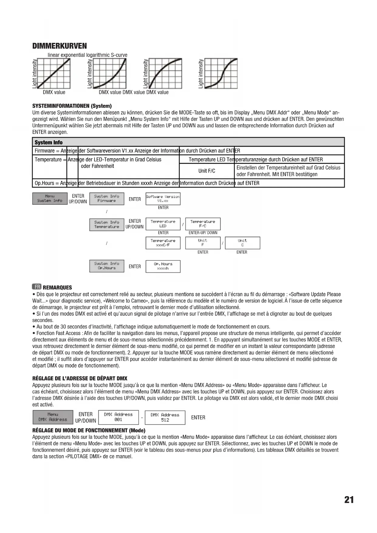 Intensité lumineuse Intensité lumineuse Intensité lumineuse Intensité lumineuse Valeur DMX linéaire exponentielle logarithmique courbe en S valeur DMX valeur DMX valeur DMX COURBES DIMMER INFORMATIONS SYSTÈME (System) Pour accéder aux informations système, appuyez plusieurs fois sur la touche MODE jusqu’à ce que la mention «Menu DMX Addr» ou «Menu Mode» apparaisse dans l’afficheur. Sélectionnez alors, avec les touches UP et DOWN, l’élément de menu «Menu System Info», puis appuyez sur ENTER. Sé- lectionnez l’élément de sous-menu désiré avec les touches UP et DOWN, puis appuyez sur ENTER pour visualiser les informations correspondantes. Infos système Firmware = Visualisation du numéro de version de firmware V1.xx Anzeige der Information durch Drücken auf ENTER Temperature = Visualisation de la température de la LED, en degrés Celsius ou Fahrenheit Temperature LED Pour visualiser la valeur de température, appuyez sur la touche ENTER. Unit F/C Réglage de l’unité de visualisation de la valeur de température, degrés Celsius ou Fahrenheit. Pour valider, appuyez sur ENTER. Op.Hours = Affichage de la durée totale de fonctionne- ment en heures xxxxh Pour visualiser l’information, appuyez sur la touche ENTER.25 ENTER UP/DOWN ENTER ENTER