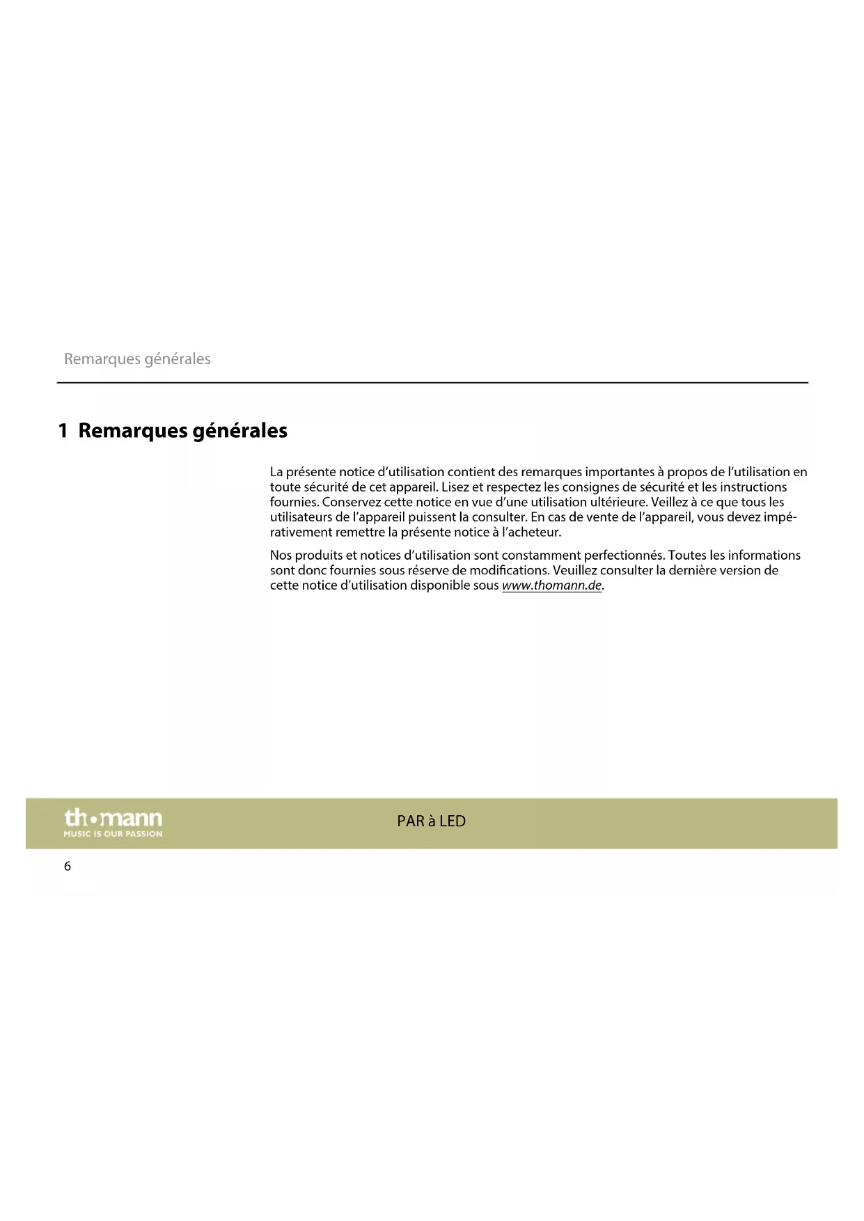 Retro Flat Par 18x10W RGBWA UV, 18x12W RGBW, 18x12W RGB WW 51 Remarques générales La présente notice d’utilisation contient des remarques importantes à propos de l’utilisation en toute sécurité de cet appareil. Lisez et respectez les consignes de sécurité et les instructions fournies. Conservez cette notice en vue d’une utilisation ultérieure. Veillez à ce que tous les utilisateurs de l’appareil puissent la consulter. En cas de vente de l’appareil, vous devez impé‐ rativement remettre la présente notice à l’acheteur. Nos produits et notices d’utilisation sont constamment perfectionnés. Toutes les informations sont donc fournies sous réserve de modications. Veuillez consulter la dernière version de cette notice d’utilisation disponible sous www.thomann.de. Remarques générales