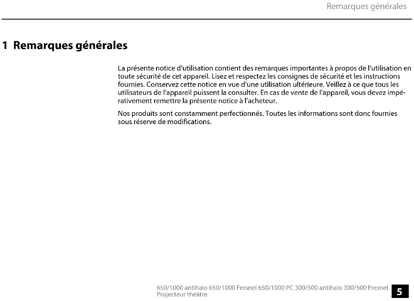 650/1000 antihalo 650/1000 Fresnel 650/1000 PC 300/500 antihalo 300/500 Fresnel Projecteur théâtreAVERTISSEMENT ! Risque de blessures par la chute de l’appareil Assurez-vous que le montage est conforme aux normes et consignes en vigueur dans votre pays. Sécurisez toujours l’appareil à l’aide d’une seconde fixation, par exemple un câble d’arrêt de sécurité ou une chaîne de sécurité. Sécurisez le volet réglable après le montage par un câble de sécurité au projec- teur. Le câble de sécurité doit cheminer en dehors du volet réglable et ne doit pas affecter la sortie du lumière. REMARQUE ! Risque d’incendie Ne recouvrez jamais les fentes d’aération. Ne montez pas l’appareil à proximité directe d’une source de chaleur. Tenez l’appareil éloigné des flammes nues. Consignes de sécurité 650/1000 antihalo 650/1000 Fresnel 650/1000 PC 300/500 antihalo 300/500 Fresnel