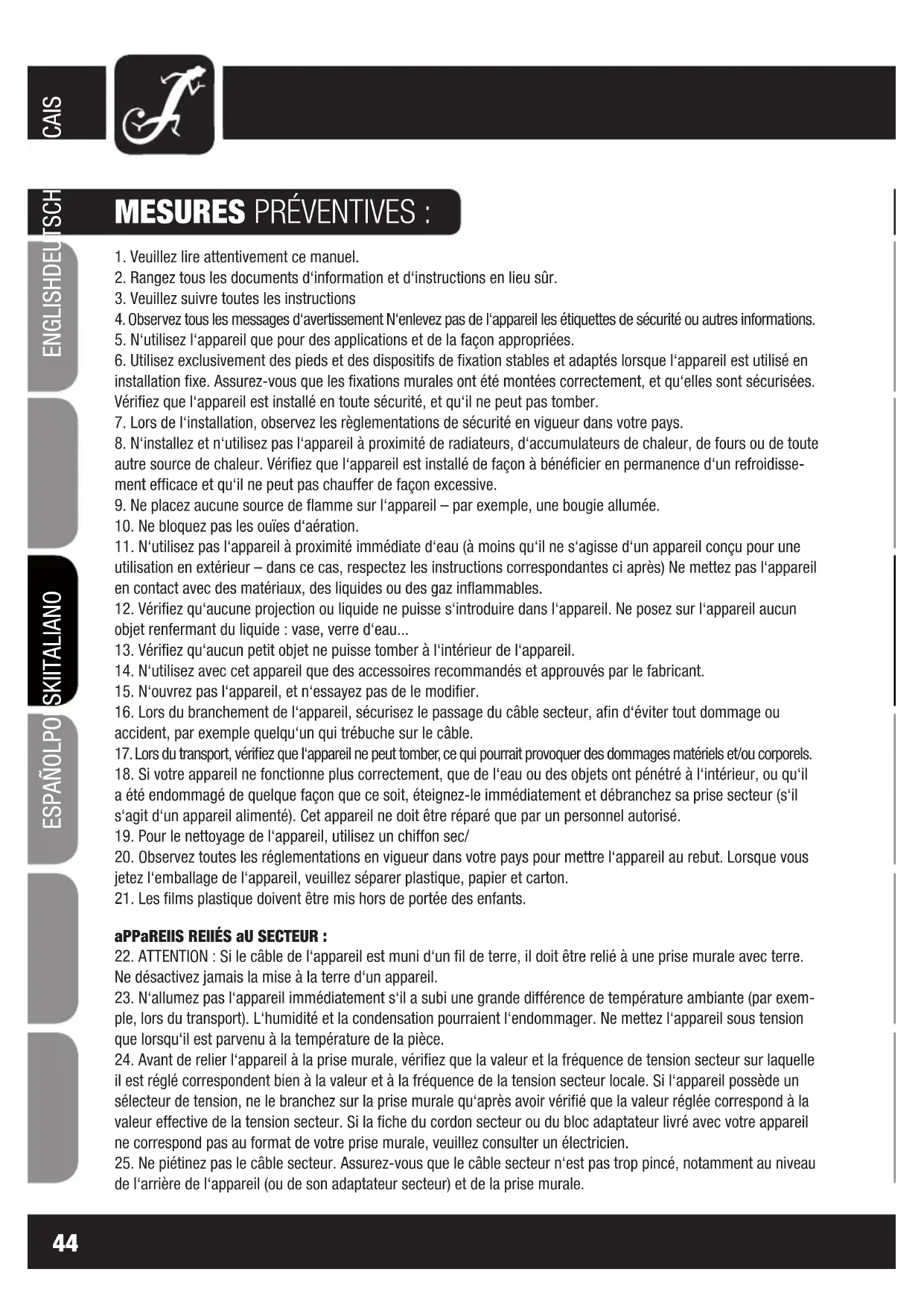 de l‘arrière de l‘appareil (ou de son adaptateur secteur) et de la prise murale.44 45 ITALIANOPOLSKIESPAÑOL FRANCAISFRANCAIS FRANCAISFRANCAIS FRANCAISDEUTSCHENGLISH SÉCURITÉ :