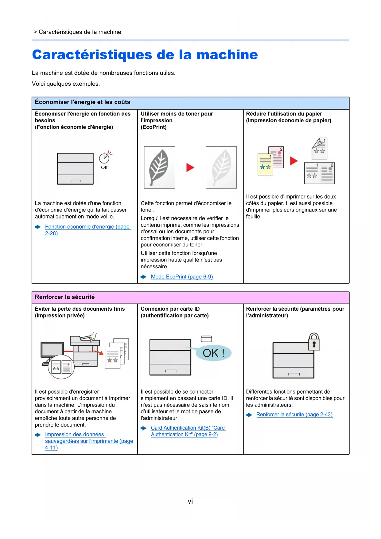 Safety Instructions Regarding the Disconnection of Power ...................................... 1-7 Compliance and Conformity ...................................................................................... 1-7 Other precautions (for users in California, the United States) ................................... 1-7 EN ISO 7779 ............................................................................................................. 1-7 EK1-ITB 2000 ............................................................................................................ 1-8 Wireless Connection (Mexico only) ........................................................................... 1-8 Précautions de sécurité lors de l'utilisation d'un réseau local sans fil (le cas échéant) ......................................................................................................... 1-8 Utilisation limitée de ce produit (le cas échéant) ....................................................... 1-9 Informations légales ................................................................................................ 1-10 Fonction Économie d’énergie .................................................................................. 1-14 Fonction d'impression recto-verso automatique ...................................................... 1-14 Économie des ressources - Papier ......................................................................... 1-14 Bénéfices de la « gestion de l'alimentation » pour l'environnement ........................ 1-14 Programme Energy Star (ENERGY STAR®) .......................................................... 1-14 2 Installation et préparation de la machine ............................................ 2-1 Nomenclature (extérieur de la machine) ......................................................................... 2-2 Nomenclature (connecteurs/intérieur) ............................................................................ 2-3 Nomenclature (avec les équipements en option installés) ........................................... 2-5 Raccordement de la machine et des autres périphériques ........................................... 2-6 Raccordement des câbles ................................................................................................ 2-7 Raccordement du câble réseau ................................................................................ 2-7 Raccordement du câble USB .................................................................................... 2-8 Raccordement du câble secteur ............................................................................... 2-8 Mise sous tension et hors tension .................................................................................. 2-9 Mise sous tension ..................................................................................................... 2-9 Mise hors tension ...................................................................................................... 2-9 Utilisation du panneau de commande ........................................................................... 2-10 Touches du panneau de commande ....................................................................... 2-10 Méthode d'utilisation ................................................................................................ 2-11 Sélection d'un menu ................................................................................................ 2-12 Réglage d'un menu ................................................................................................. 2-12 Annulation de la sélection d'un menu ...................................................................... 2-12 Écran d'aide ............................................................................................................ 2-12 Connexion/déconnexion ................................................................................................. 2-13 Connexion ............................................................................................................... 2-13 Déconnexion ........................................................................................................... 2-14 Paramètres par défaut de la machine ............................................................................ 2-15 Configuration de la date et de l’heure ..................................................................... 2-15 Configuration réseau ...................................................................................................... 2-17 Configuration du réseau filaire ................................................................................ 2-17 Configuration du réseau sans fil .............................................................................. 2-19 Configuration Wi-Fi Direct ....................................................................................... 2-24iii Fonction économie d'énergie ......................................................................................... 2-28 Veille automatique ................................................................................................... 2-28 Param niv veille ....................................................................................................... 2-29 Règles d'arrêt (modèles pour l'Europe) ................................................................... 2-30 Mode silencieux ............................................................................................................... 2-31 Installation du logiciel ..................................................................................................... 2-32 Logiciel sur le DVD (Windows) ................................................................................ 2-32 Installation du logiciel sous Windows ...................................................................... 2-33 Désinstallation 