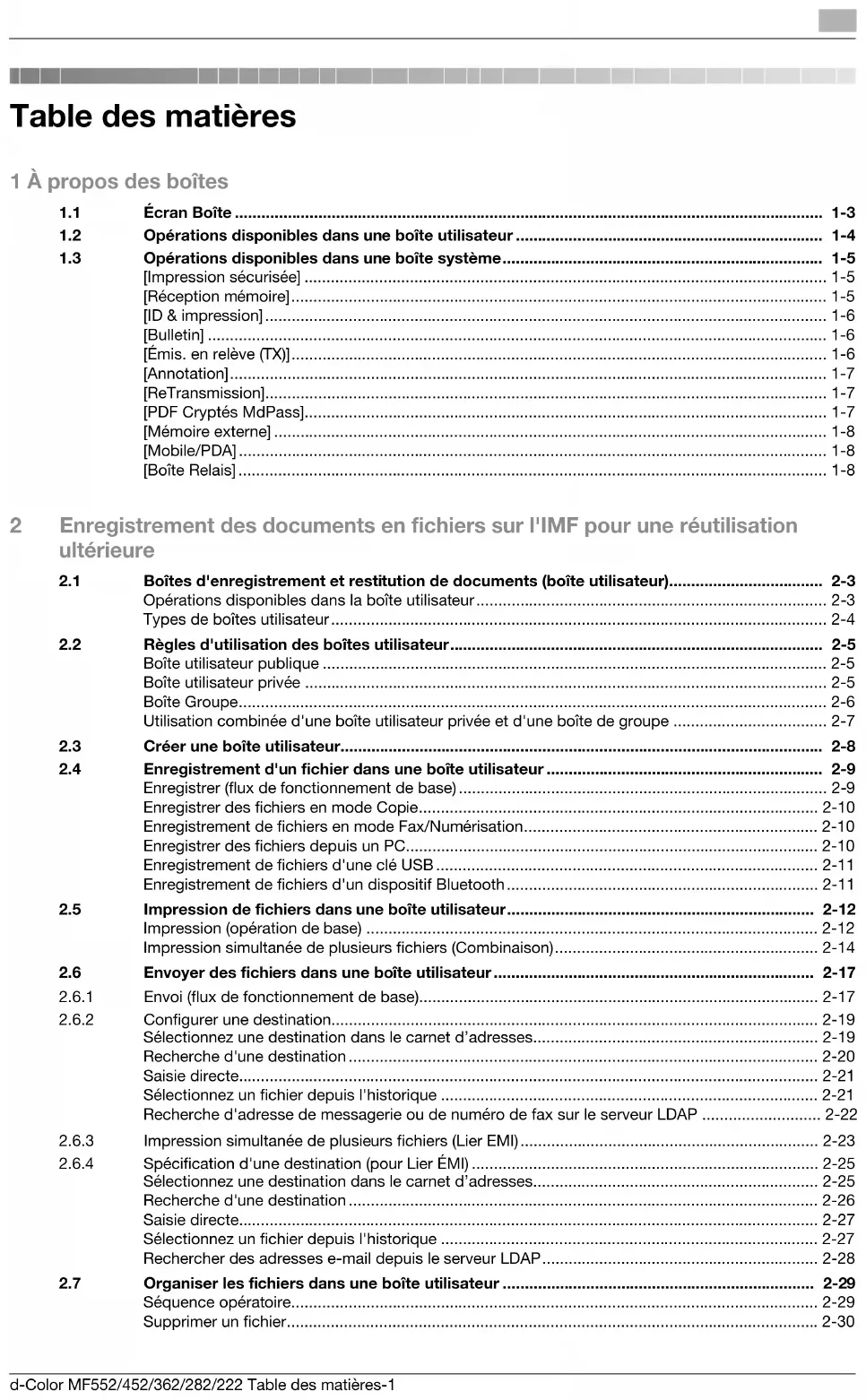 - remplacement de composants ou d’accessoires originaux par des pièces non approuvées par le constructeur, ou effectué par du personnel non autorisé. Tous droits réservés. Aucune partie de ce document ne peut être reproduite ou transmise sous quelque forme ou par quelque moyen que ce soit, électronique ou mécanique, tel que par photocopie, enregistrement ou par un système quelconque de stockage et de rappel des informations, sans l’autorisation écrite de l’éditeur. Les qualités requises pour ce produit sont garanties par le label appliqué sur le produit même. Tous droits réservésImportant ! En raison des modifications apportées à la spécification de l'interface utilisateur, les images de l'interface utilisateur illustrées dans les guides de l'utilisateur peuvent différer légèrement des descriptions qui en sont faites. Les boutons "Annul", "OK", "Ferm.", "Oui" et "Non" ont été remplacés par des icônes et le texte de leur description peut encore contenir les mots "Annul", "OK", "Ferm.", "Oui" et "Non". Précédente conception : Nouvelle conception :d-Color MF552/452/362/282/222 Table des matières-1 Table des matières 1 À propos des boîtes 1.1 Écran Boîte ...................................................................................................................................... 1-3 1.2 Opérations disponibles dans une boîte utilisateur ...................................................................... 1-4 1.3 Opérations disponibles dans une boîte système......................................................................... 1-5 [Impression sécurisée] ....................................................................................................................... 1-5 [Réception mémoire].......................................................................................................................... 1-5 [ID & impression]................................................................................................................................ 1-6 [Bulletin] ............................................................................................................................................. 1-6 [Émis. en relève (TX)].......................................................................................................................... 1-6 [Annotation]........................................................................................................................................ 1-7 [ReTransmission]................................................................................................................................ 1-7 [PDF Cryptés MdPass]....................................................................................................................... 1-7 [Mémoire externe] .............................................................................................................................. 1-8 [Mobile/PDA]...................................................................................................................................... 1-8 [Boîte Relais] ...................................................................................................................................... 1-8 2 Enregistrement des documents en fichiers sur l'IMF pour une réutilisation ultérieure