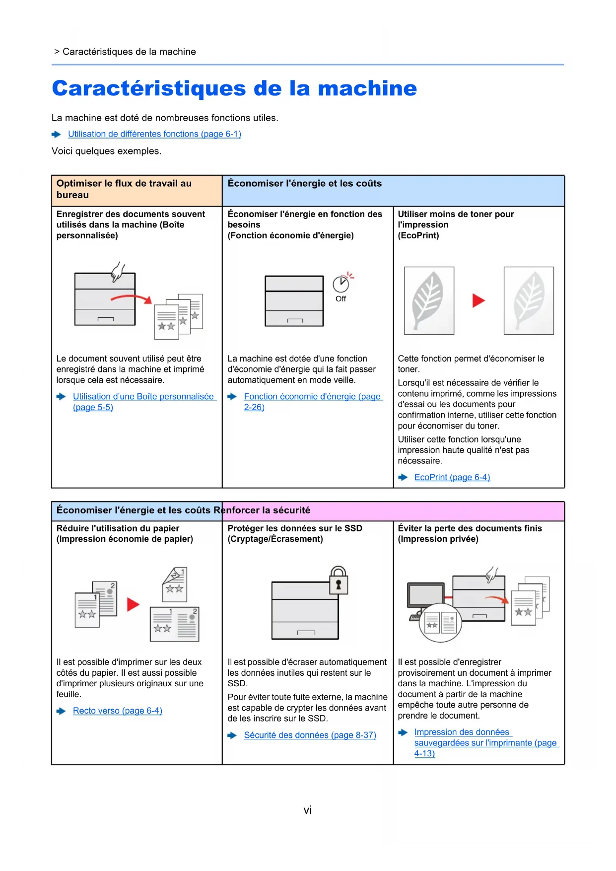 - Sélectionner la touche [OK]. Touche [Menu] > touche [▲] [] > [Périph. commun] > touche [OK]xiii > Plan du menu Plan du menu Il s'agit d'une liste des menus affichés sur l'écran. Selon les paramètres, certains menus peuvent ne pas s'afficher. Certains noms de menu peuvent différer des titres de référence. Boîte perso. (sélection de boîte) (sélection de fichier) Impr. Impr. (ParModif) Fonctions Mode silencieux (page 6-5) Recto verso (page 6-4) EcoPrint (page 6-4) Entrée nom fich. (page 6-5) Avis fin travail (page 6-4) Suppr.Après impr (page 6-5) Supprimer Déplacer Boîte travaux Copie rapide (page 4-18) Privé/Stocké (page 4-14) Param boîte trav (page 4-22) État du travail (page 7-2) Journal travaux (page 7-3) Clavier (page 7-5) Réseau (page 7-5) Wi-Fi (page 7-5) Wi-Fi Direct (page 7-5) Réseau option (page 7-5) État Sxiv > Plan du menu Rapport Imprimer rapport Plan menu (page 8-4) Liste config. (page 8-4) Page d'état (page 8-5) Liste polices (page 8-5) ListFich RAM (page 8-5) Liste fich. SSD (page 8-5) ListFich carteSD (page 8-5) Nettoy. données (page 8-5) Hist. jrnl trav Envoi auto (page 8-6) Env. historique (page 8-6) Destination (page 8-6) Objet (page 8-6) Info. perso (page 8-6) Lecteur USB Imprimer fichier (page 5-13) Retirer le lecteur USB (page 5-15) Compteur (page 2-38)xv > Plan du menu Paramètres du papier Config. by-pass Format papier (page 8-7) Type de support (page 8-7) Param. bac G. C. Format papier (page 8-8) Type de support (page 8-8) Param. magasin 1 Type de support (page 8-9) Autre papier (page 8-9) Format pap.perso (page 8-9) Param. magasin 2 Type de support (page 8-9) Autre papier (page 8-9) Format pap.perso (page 8-9) Param. magasin 3 Type de support (page 8-9) Autre papier (page 8-9) Format pap.perso (page 8-9) Param. magasin 4 Type de support (page 8-9) Autre papier (page 8-9) Format pap.perso (page 8-9) Param. magasin 5 Type de support (page 8-9) Autre papier (page 8-9) Format pap.perso (page 8-9) Config type supp (page 8-7) Réinit. rég. papier (page 8-7) Paramètres du papier Mess.conf.papier Bac MF (page 8-7) Bac G. C. (page 8-7) Magasin 1 (page 8-7) Magasin 2 (page 8-7) Magasin 3 (page 8-7) Magasin 4 (page 8-7) Magasin 5 (page 8-7)xvi > Plan du menu Paramètres d'impression Source de papier (page 8-11) Chang. bac auto (page 8-11) Priorité bac MF (page 8-11) Mode alim papier (page 8-11) Recto verso (page 8-11) Sortie du papier (page 8-11) Ann. A4/Letter (page 8-11) Param. émulation (page 8-12) Police (page 8-12) Jeu caractères (page 8-12) Qualité d'impression KIR (page 8-13) EcoPrint (page 8-13) Niv.éco.EcoPrint (page 8-13) Résolution impr. (page 8-13) Densité impress. (page 8-13) Paramètre page Copies (page 8-13) Orientation (page 8-13) Saut de ligne (page 8-13) Retour chariot (page 8-13) A4 étendu (page 8-13) XPS ajust.à page (page 8-13) Format TIFF/JPEG (page 8-13) Entrée nom fich. (page 8-13) Nom utilisateur (page 8-14) Nom du travail (page 8-14) Finisseur trav. (page 8-14) Réseau Nom d'hôte (page 8-14) Cfg.Wi-Fi Direct Wi-Fi Direct (page 8-14) Nom du périph. (page 8-14) Adresse IP (page 8-14) Déconnexion auto (page 8-15) Tempor. déconn. (page 8-15) Paramètres Wi-Fi Wi-Fi (page 8-15) Configuration (page 8-15) Config. TCP/IP (page 8-17) Redém. réseau. (page 8-18)xvii > Plan du menu Réseau Par. rés.filaire Config. TCP/IP (page 8-19) Interface LAN (page 8-19) Param. protocole (page 8-19) Réseau principal (page 8-25) Ping (page 8-25) Redém. réseau. (page 8-25) Réseau en option Réseau sans fil (page 8-26) Général (page 8-28) Périph. commun Langue (page 8-29) Déf. écran(bte) (page 8-29) Définition date Date (page 8-29) Heure (page 8-29) Format de date (page 8-29) Déf. fuseau hor. (page 8-29) Heure d'été (page 8-29) Alarme Confirmation clé (page 8-30) Avis de fin trav (page 8-30) Prêt (page 8-30) Erreur (page 8-30) Confirm. clavier (page 8-30) Paramètre disque RAM (page 8-30) Formater SSD (page 8-30) Formater carteSD (page 8-31) Lumin. affich. (page 8-31) Rétroécl. Écran (page 8-31) Gestion des erreurs ErreurPapRecVers (page 8-31) Erreur papier (page 8-31) Erreur insert. (page 8-32) Bac MF vide (page 8-32)xviii > Plan du menu Périph. commun Param. tempor. Réinit. auto du panneau (page 8-32) Tempo. réinit. (page 8-32) Param niv veille (page 8-32) Tempor. veille (page 8-32) Règle d'arrêt (page 8-33) Tempo. Arrêt (page 8-33) Par.tempor.hebdo (page 8-33) Corr.Erreur auto (page 8-33) Temp.Corr.Erreur (page 8-33) Délai saut page (page 8-34) Dépas.délai ping (page 8-34) Aff. état/journ. (page 8-34) Type clavier USB (page 8-34) Param. Bluetooth (page 8-34) Alerte toner bas (page 8-35) Impr.msgBannière (page 8-35) Sécurité Sécurité réseau (page 8-36) Conf bloc interf (page 8-36) Niveau de sécurité (page 8-37) Sécurité des données (page 8-37) NomUtil/CptaTrav ParamLogin util Connexion util. (page 9-3) Liste des utilisateurs locaux (page 9-5) Paramètres de carte ID Login clavier (page 9-11) Auth. suppl. (page 9-11) Connexion PIN (page 9-12) Propr. nv util. (page 9-10) Param.compt.trav Compta. travaux (page 9-15) Accès compta (page 9-16) Compta.(locale) (page 9-16) Appliquer limite (page 9-23) ID trav. inconnu (page 9-27) Réglage/Maint. Mode silencieux (page 8-39) Redémarrer (page 8-39) Param. service (page 8-39) Fonction opt. (page 8-39) Logiciel (page 8-39)1-1 1 Informations légales et de sécurité Prendre connaissance de ces informations avant d'utiliser la machine. Ce chapitre aborde les sujets suivants : Avis p. 1